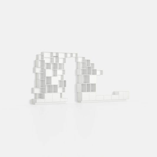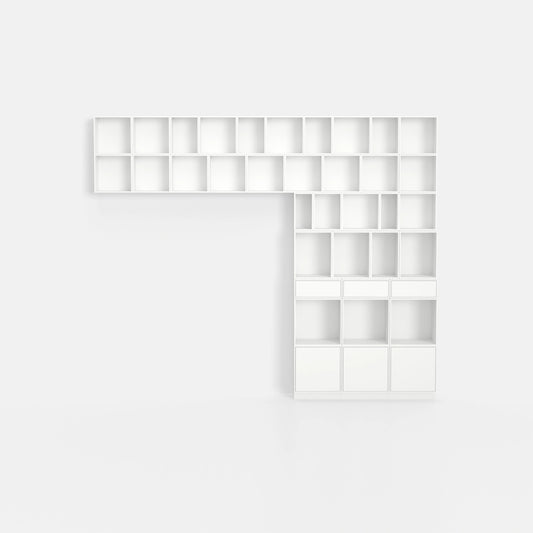 Our smart shelving system also integrates drawers and doors for hidden storage space.