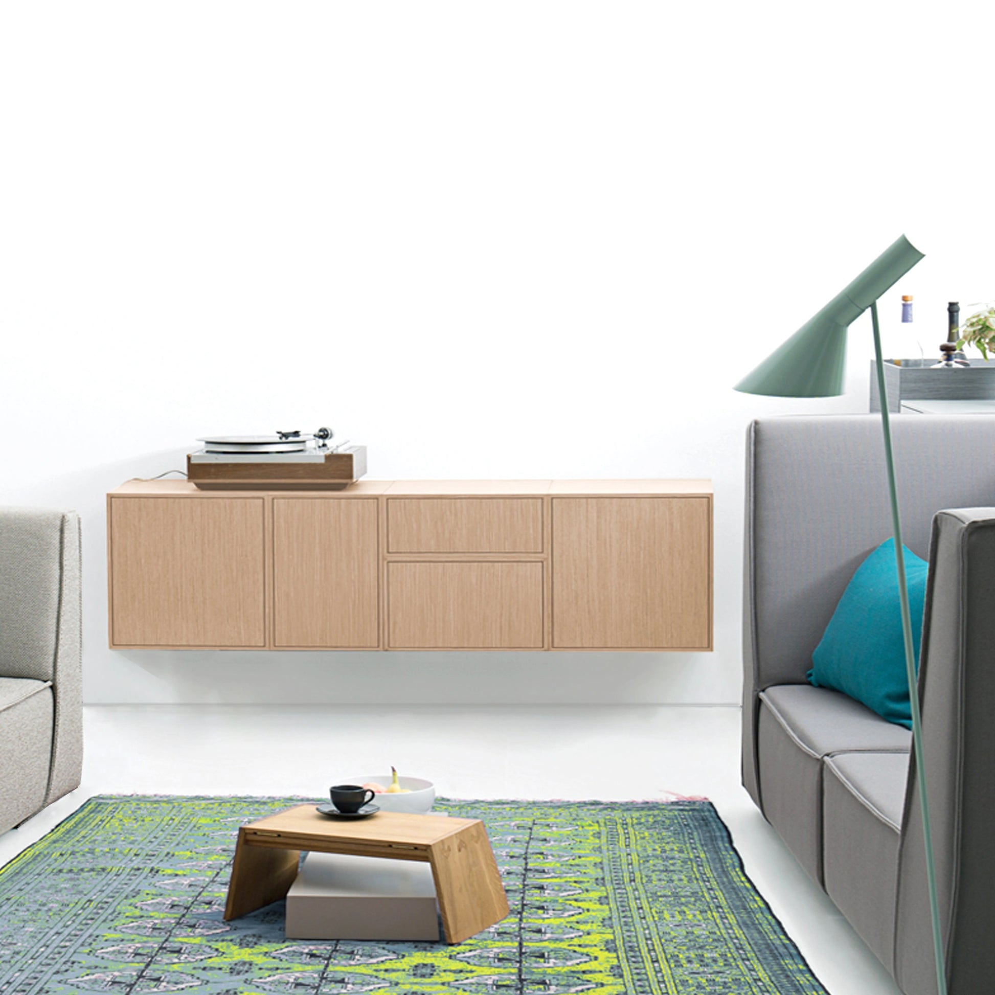 Three modular Cubit shelf boxes, two in light green and one in walnut veneer, arranged freely on the floor, another on a black metal frame