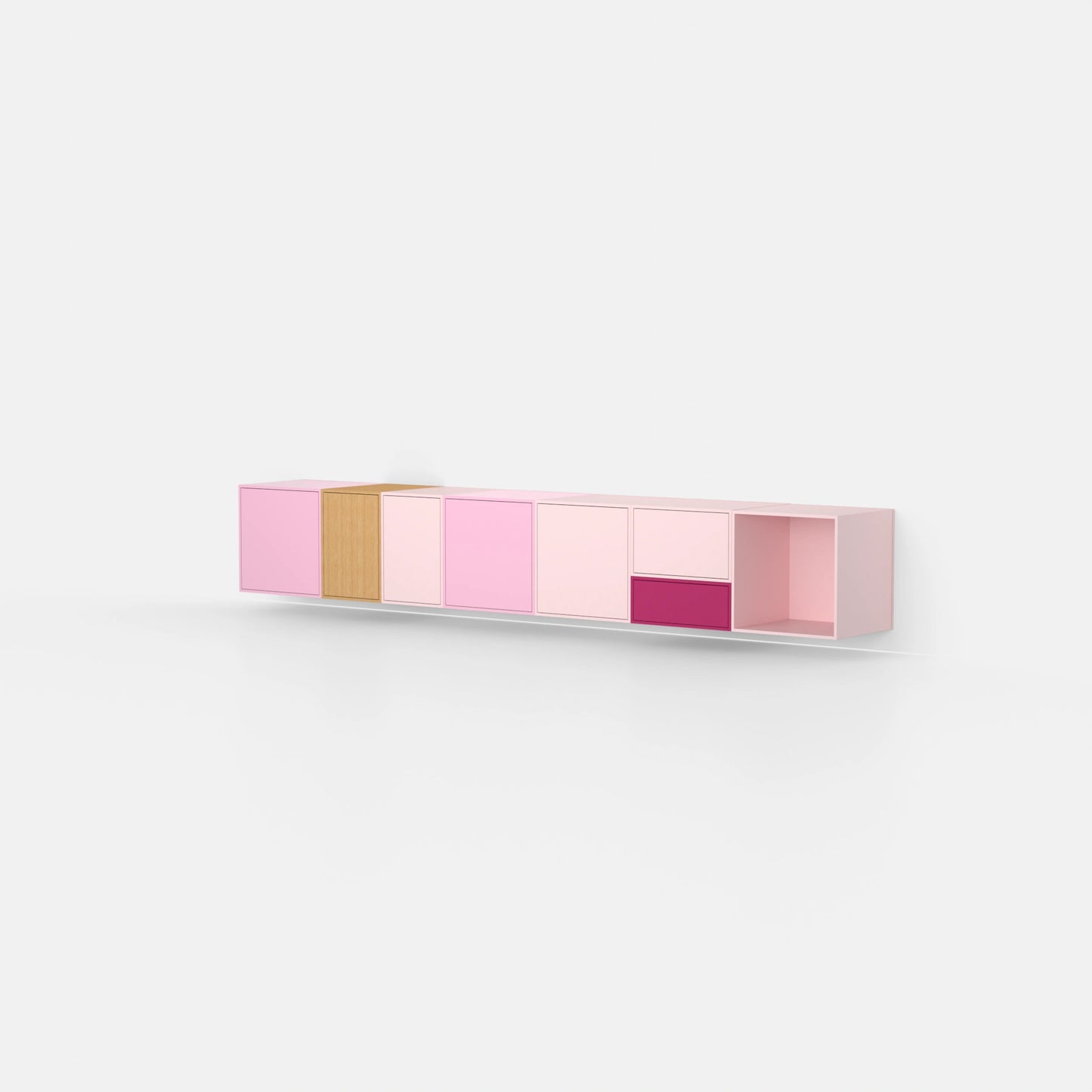 Shelving structure with various Cubit modules in pink and natural tones, combined with door modules and open modules