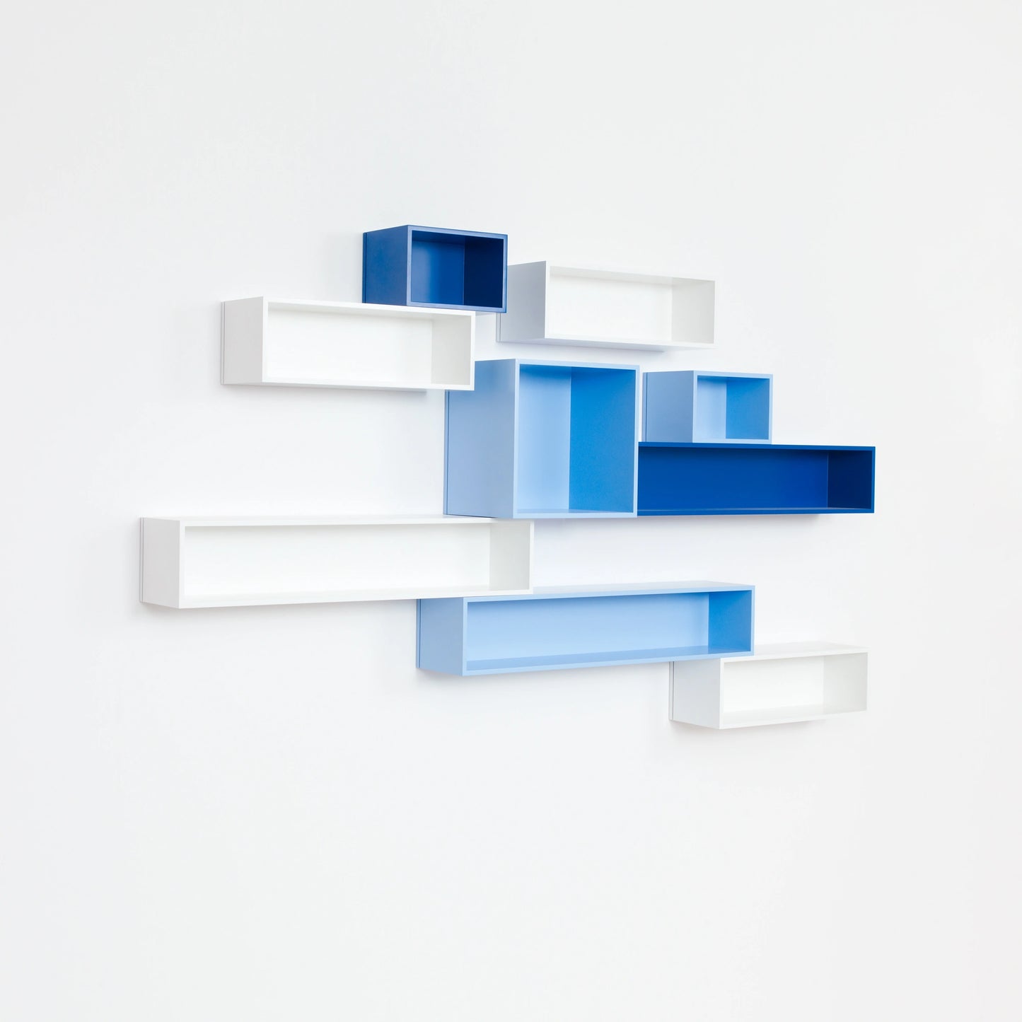 Cubit shelves in all colours of the rainbow as a wall installation, arranged in a flowing colour gradient - an expression of maximum colour variety and design freedom