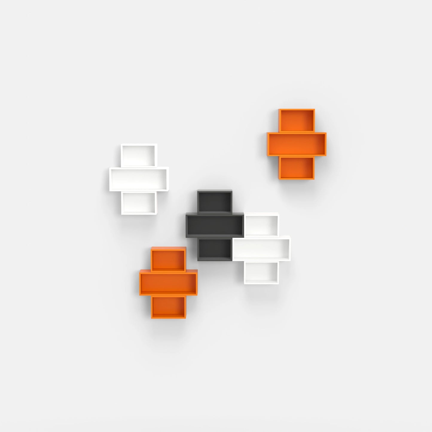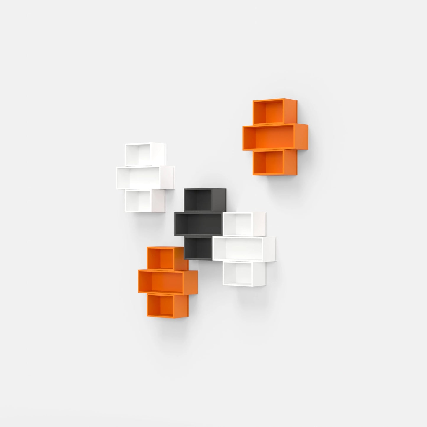 Cubit Wall bookshelf made of coloured modules in shades of red, pink and yellow, dynamically arranged for a lively room design