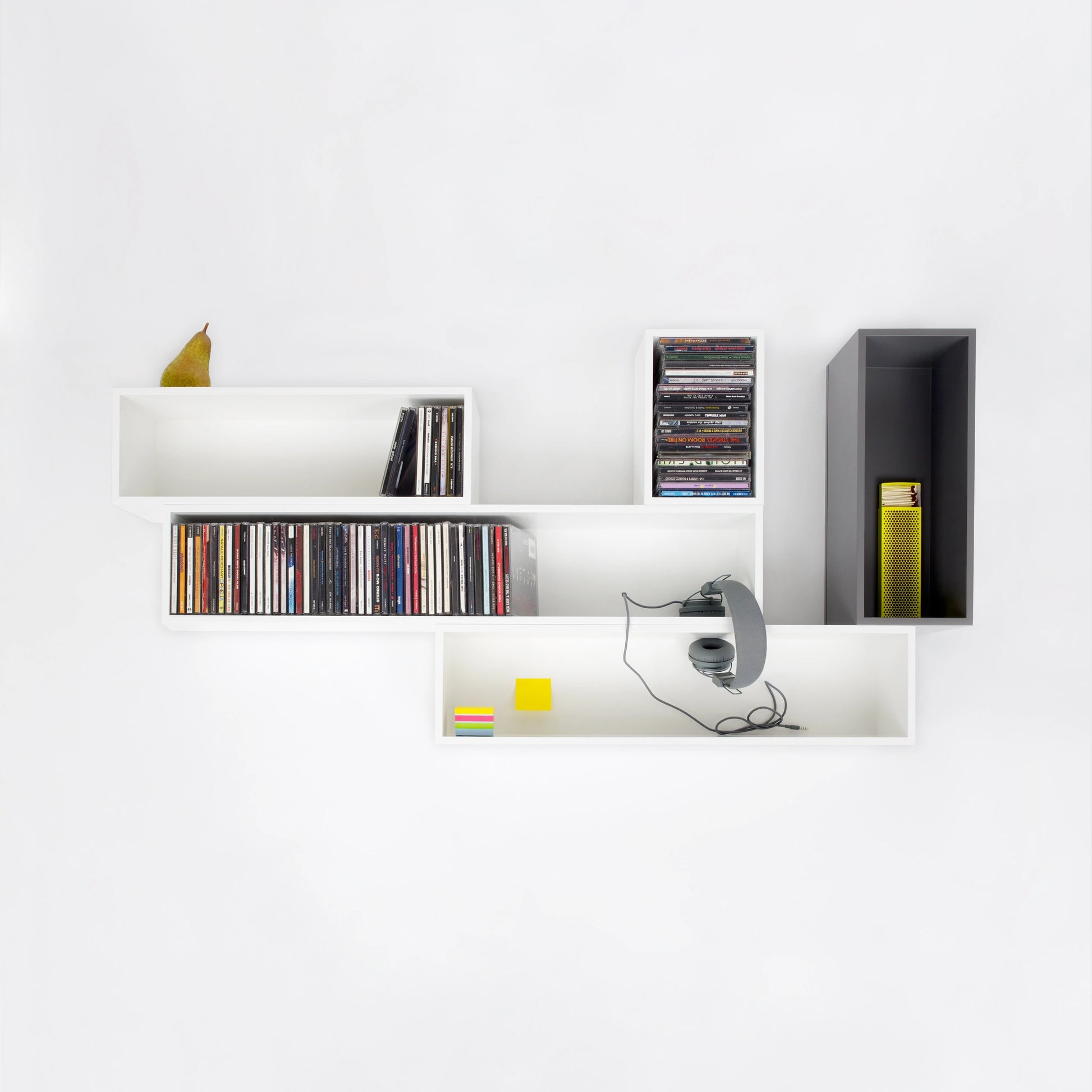 The shelving modules are based on standard literature and music formats, e.g. A4, A5, folders, atlases, illustrated books and records. This size grid based on the contents creates a unique sculptural look.
