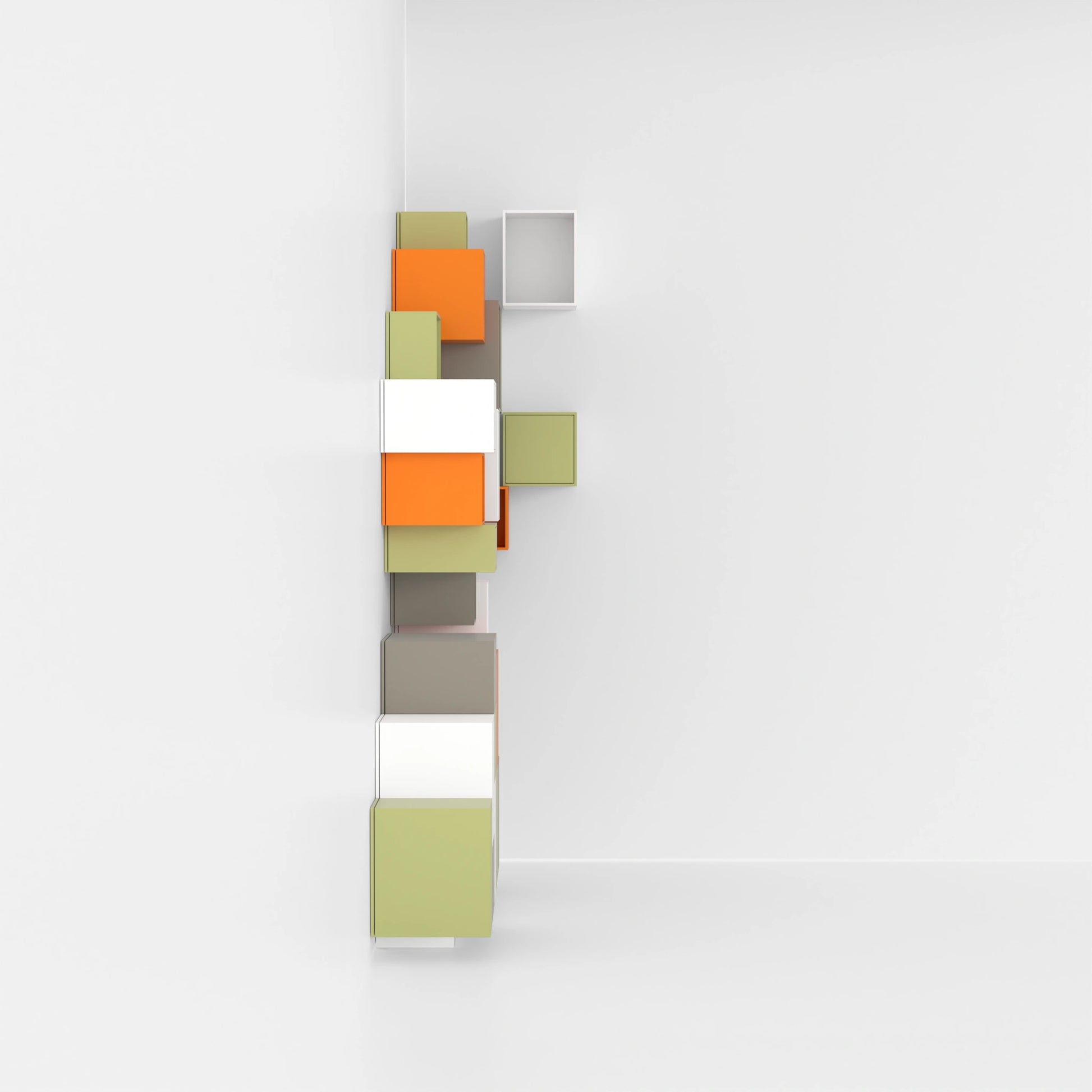 Cubit Wall bookshelf made of coloured modules in shades of red, pink and yellow, dynamically arranged for a lively room design