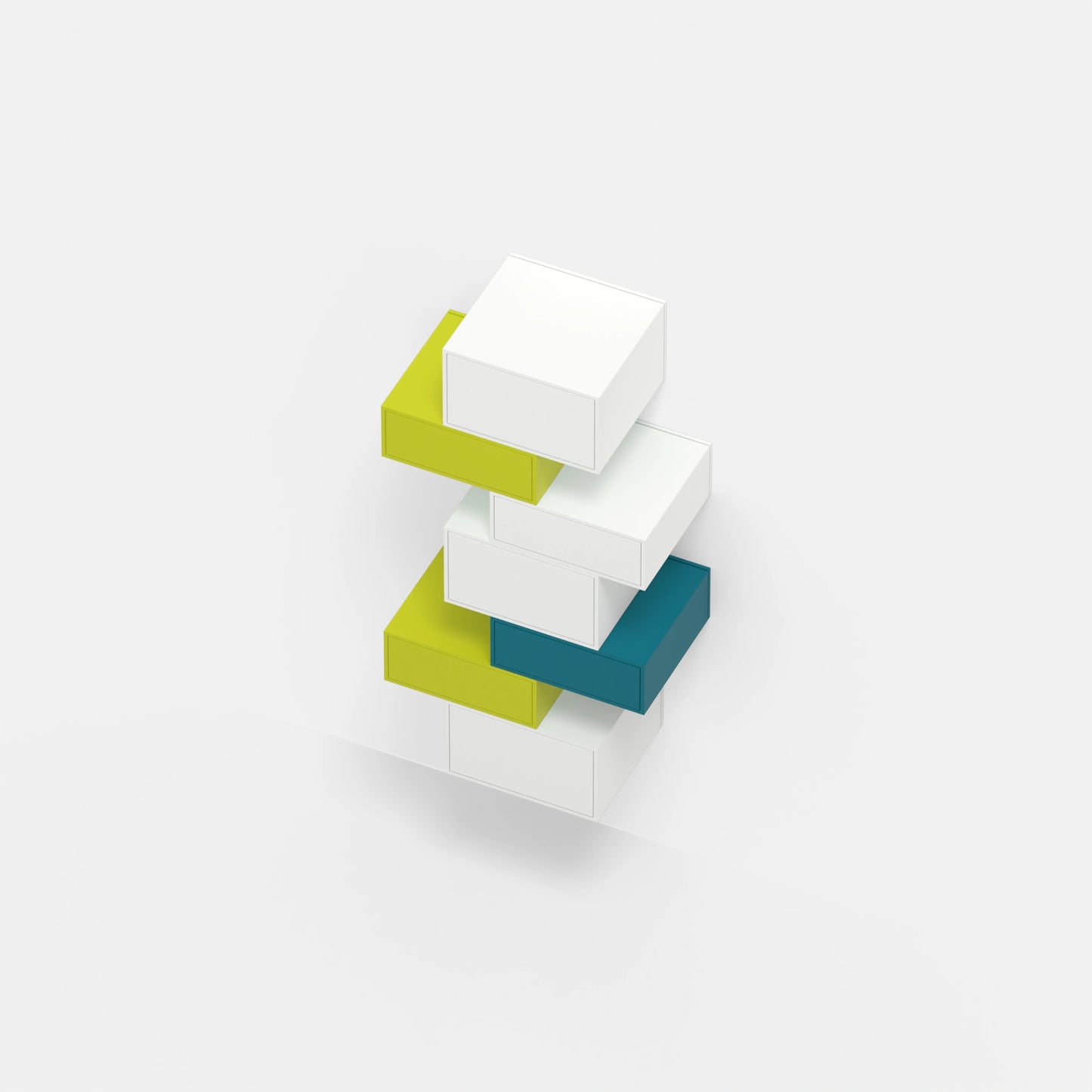 Three modular Cubit shelf boxes, two in light green and one in walnut veneer, arranged freely on the floor, another on a black metal frame