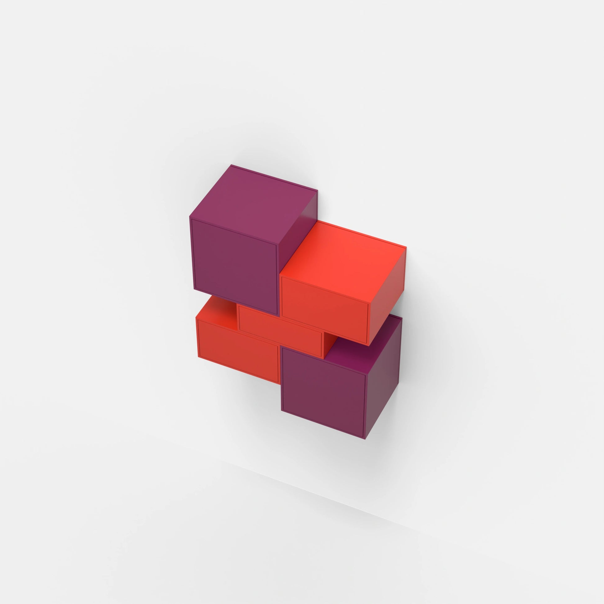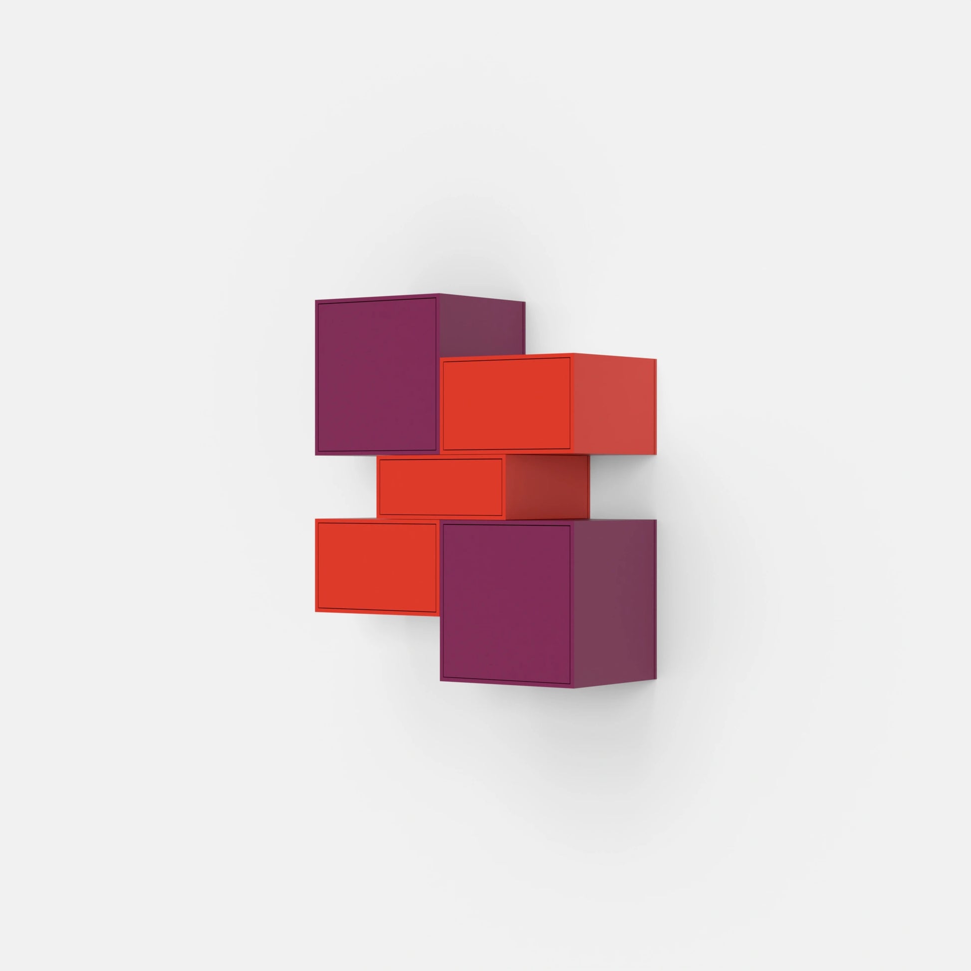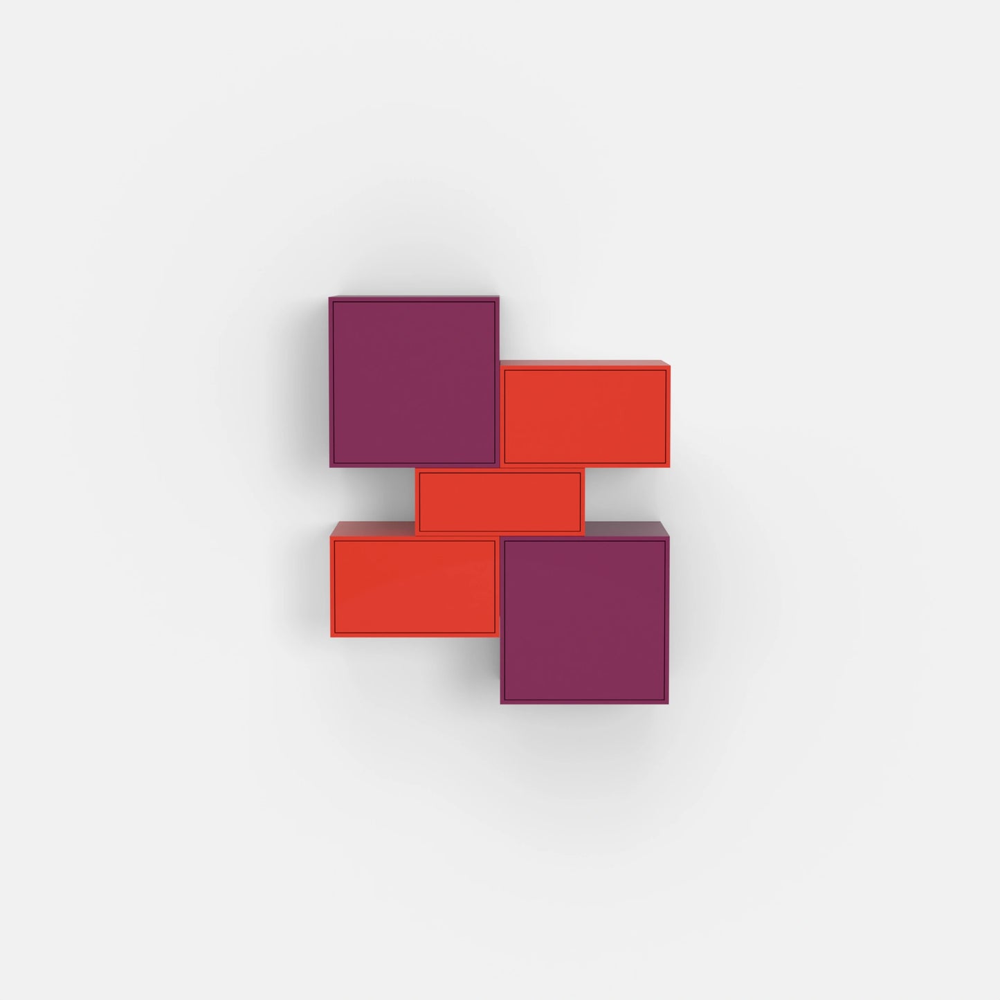 Cubit Wall bookshelf made of coloured modules in shades of red, pink and yellow, dynamically arranged for a lively room design
