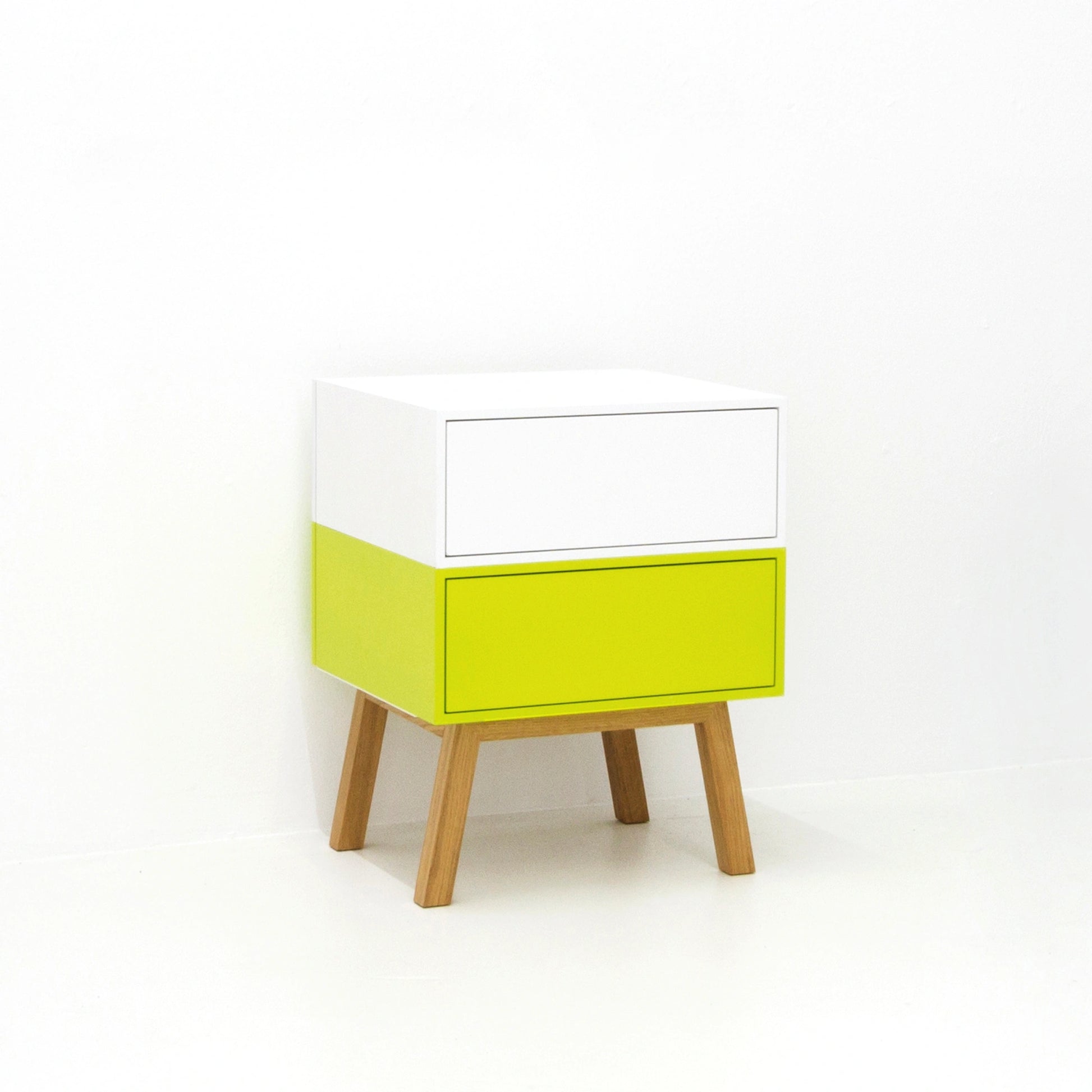 White and yellowish green give the shelf freshness and dynamism. The white is calming, while yellowish green sets accents. These colors enliven the room and create an appealing atmosphere.
