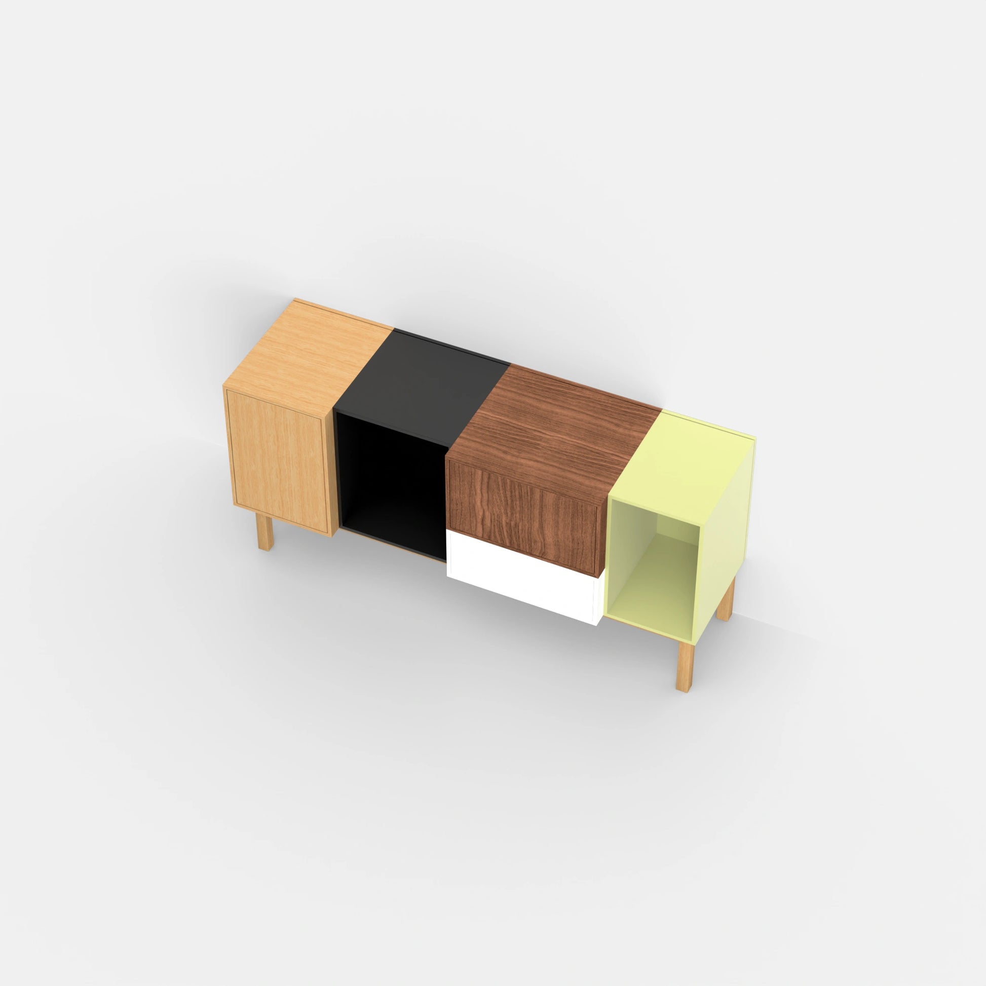 Three modular Cubit shelf boxes, two in light green and one in walnut veneer, arranged freely on the floor, another on a black metal frame