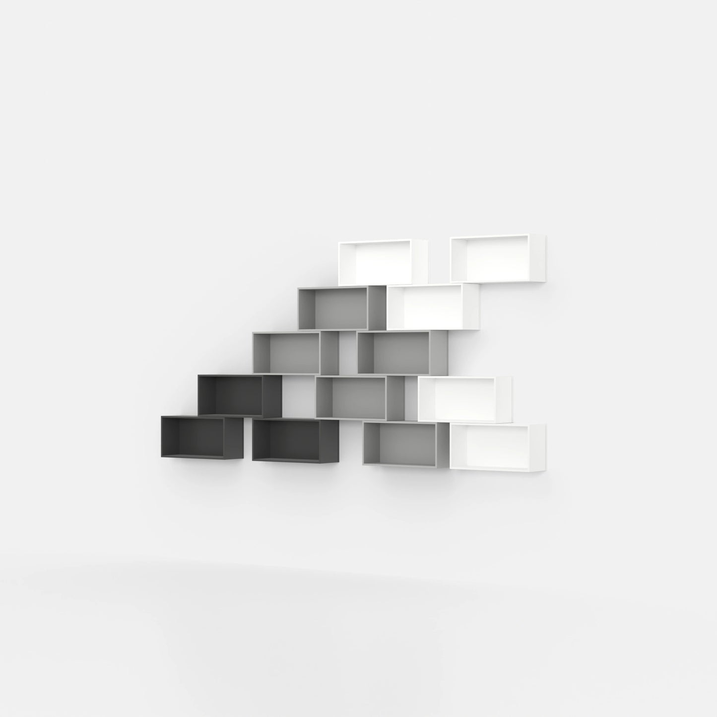 Cubit shelves in all colours of the rainbow as a wall installation, arranged in a flowing colour gradient - an expression of maximum colour variety and design freedom