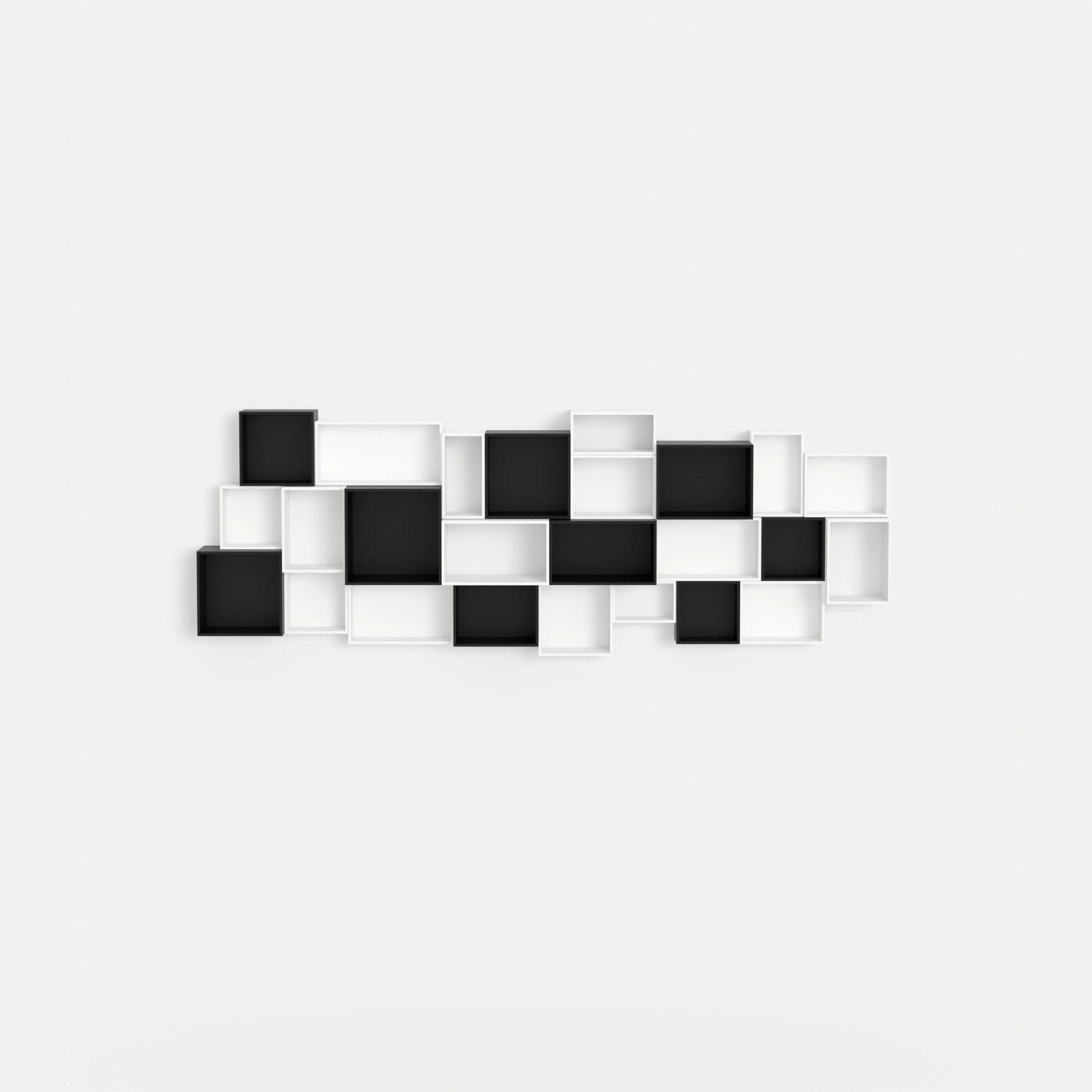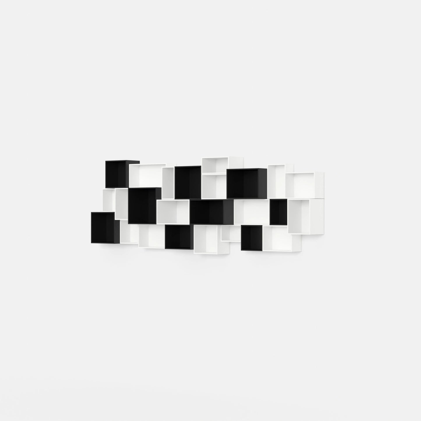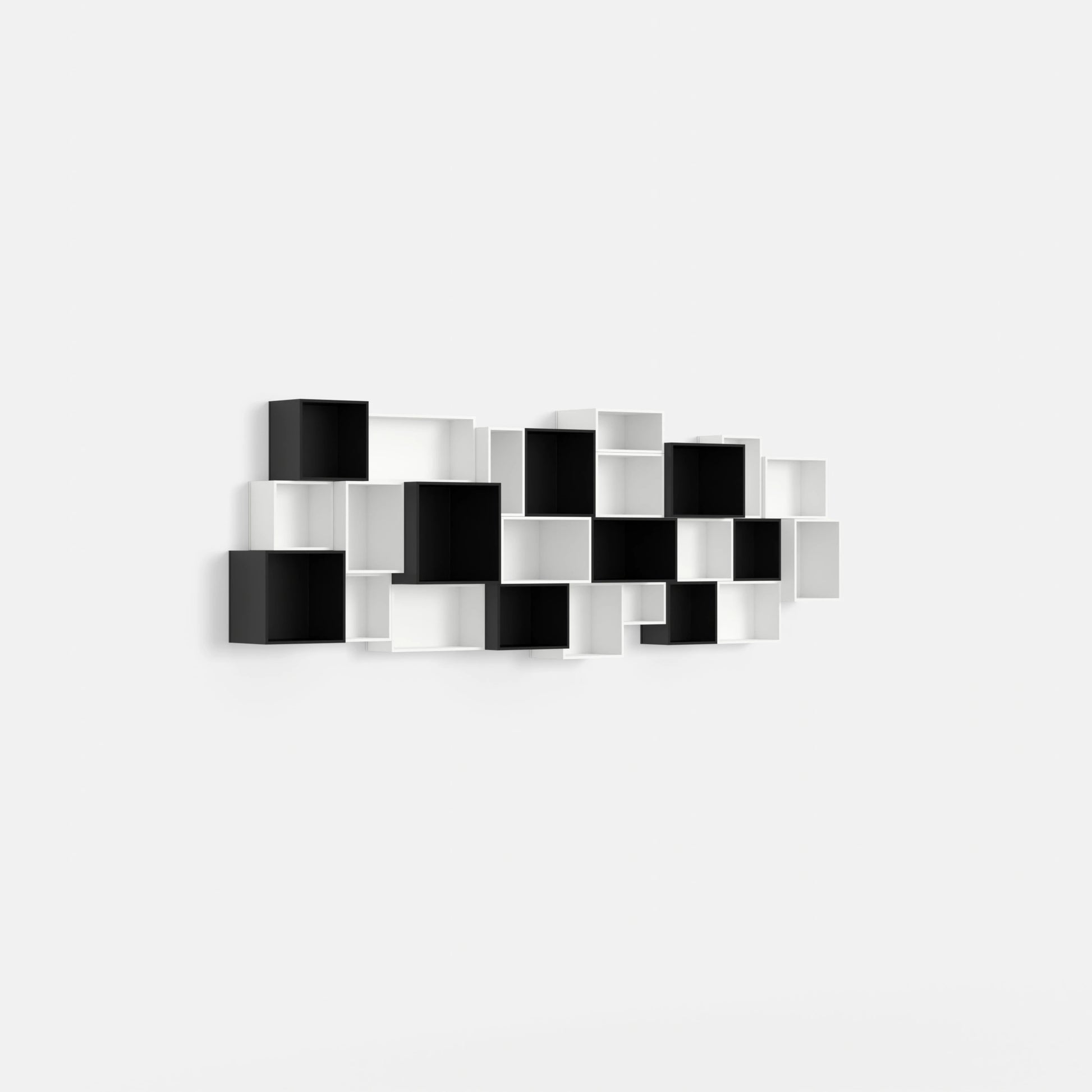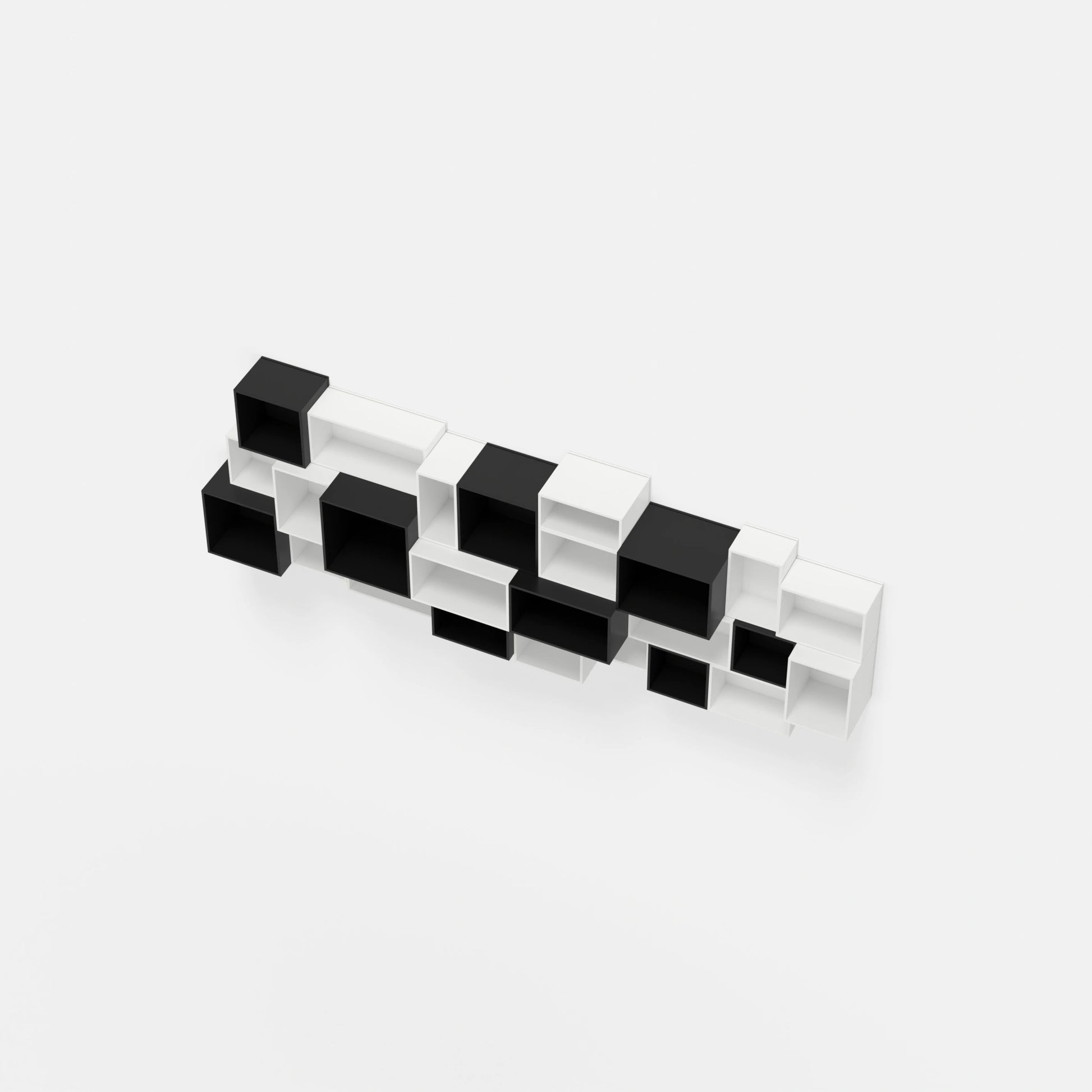 The Wall-mounted shelving RK1009 revolutionizes order and style in your home. At 260.00 cm wide, 92.00 cm high and 33.00 cm deep, it offers space for all your essentials. Its 25 modules are efficiently distributed for maximum storage space. black and white create an elegant color harmony, suitable for modern and classic environments.