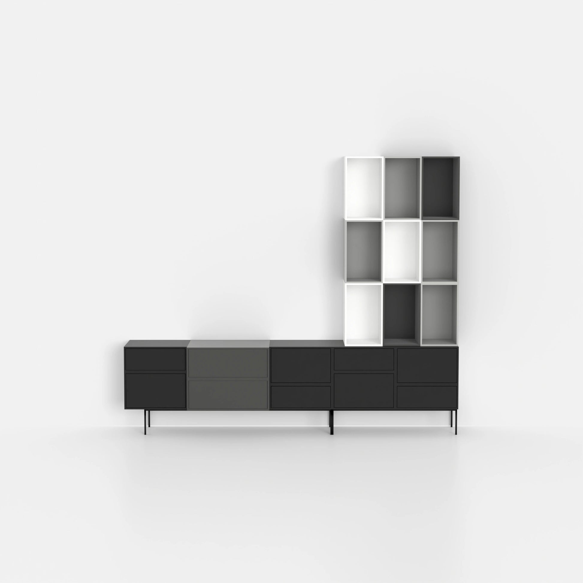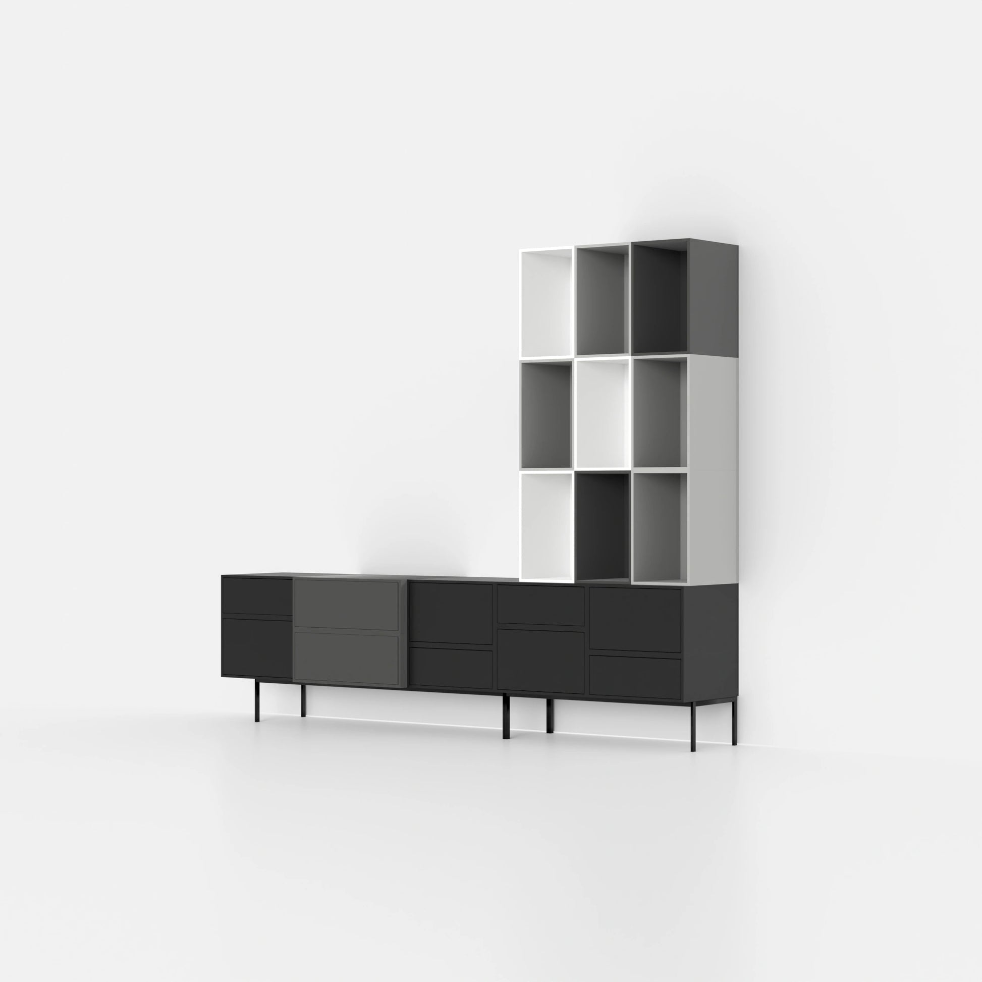 The shelving modules are based on standard literature and music formats, e.g. A4, A5, folders, atlases, illustrated books and records. This size grid based on the contents creates a unique sculptural look.