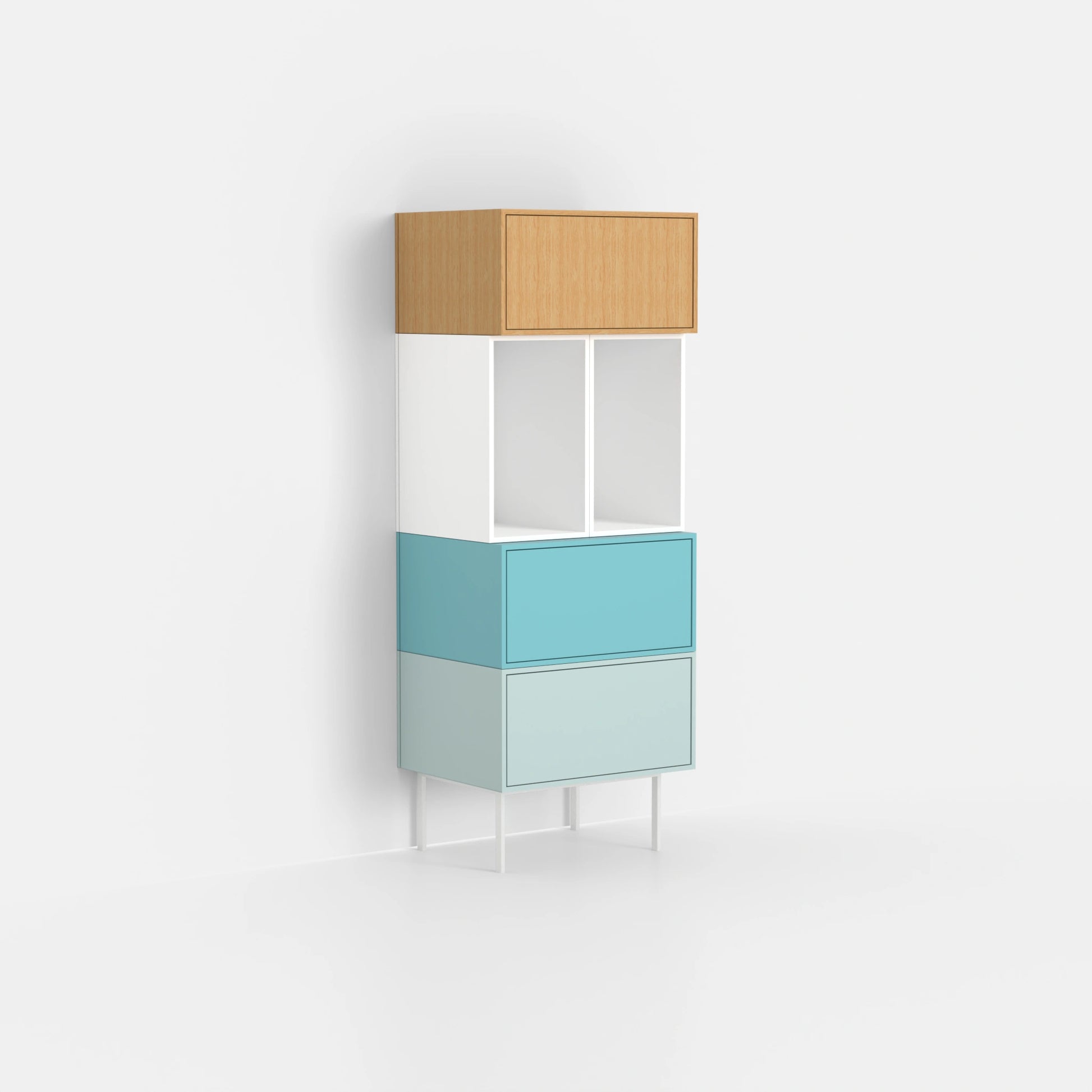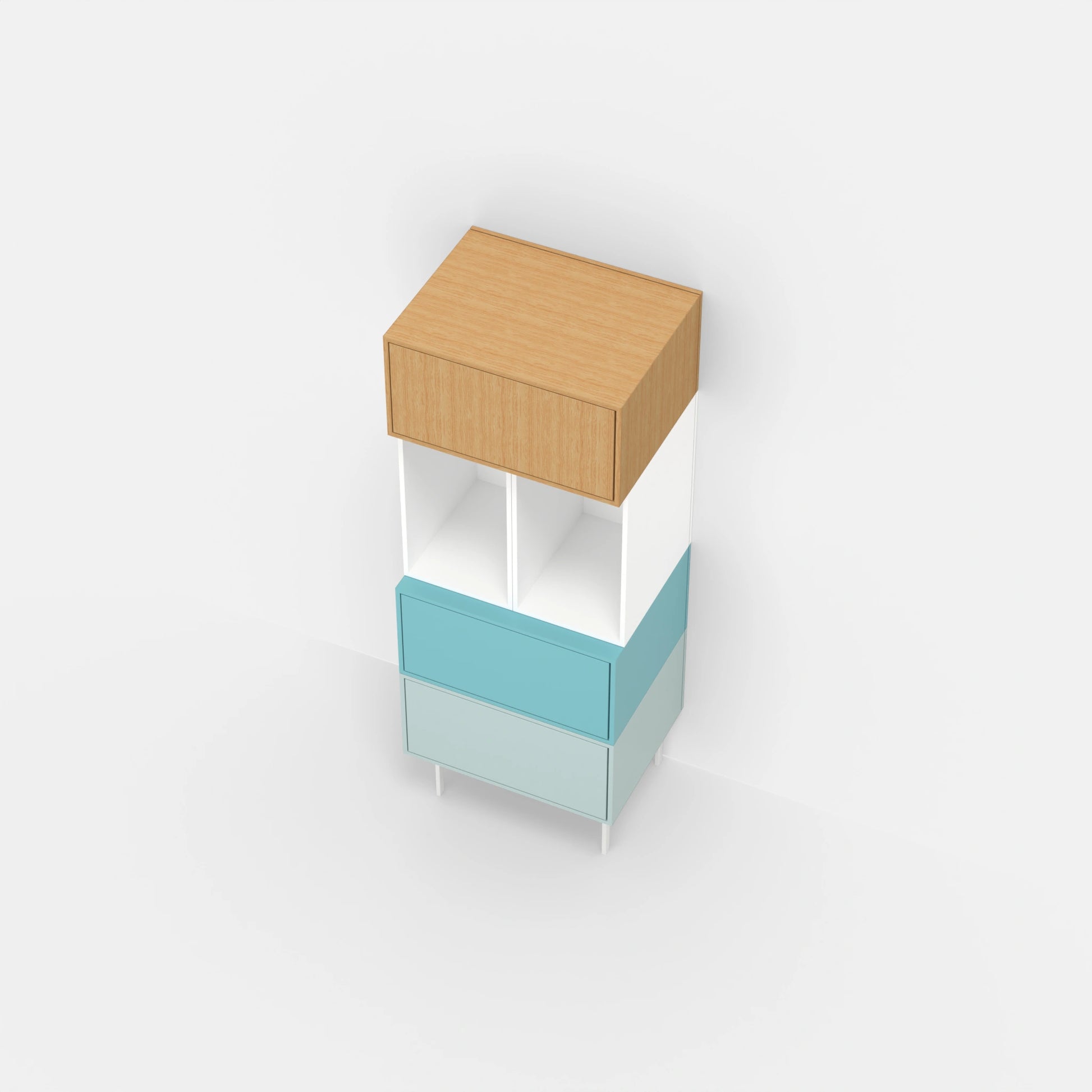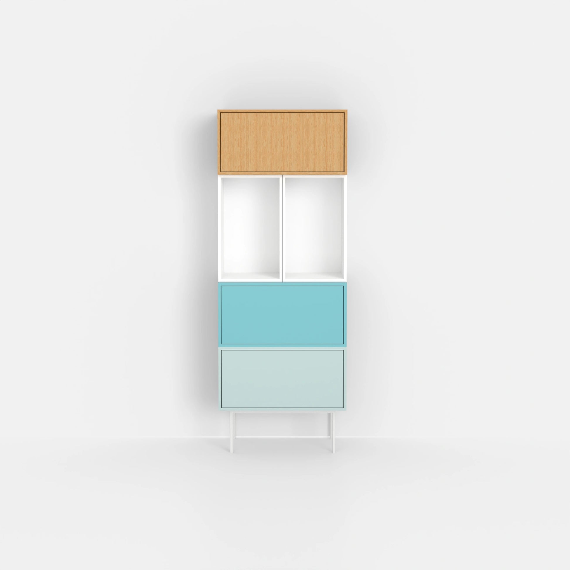 The shelf is available in white, lagoon, light lagoon and amber oak. Each colour option adapts seamlessly to different furnishing styles. The amber oak wood design gives your room a warm atmosphere.