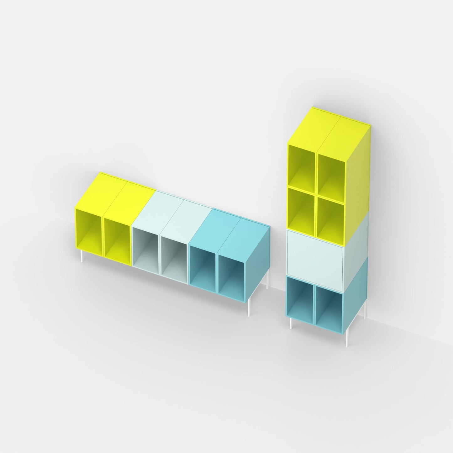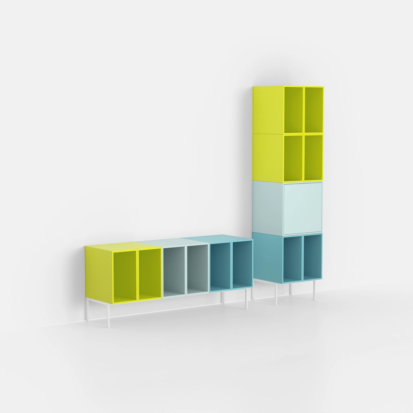 Three modular Cubit shelf boxes, two in light green and one in walnut veneer, arranged freely on the floor, another on a black metal frame
