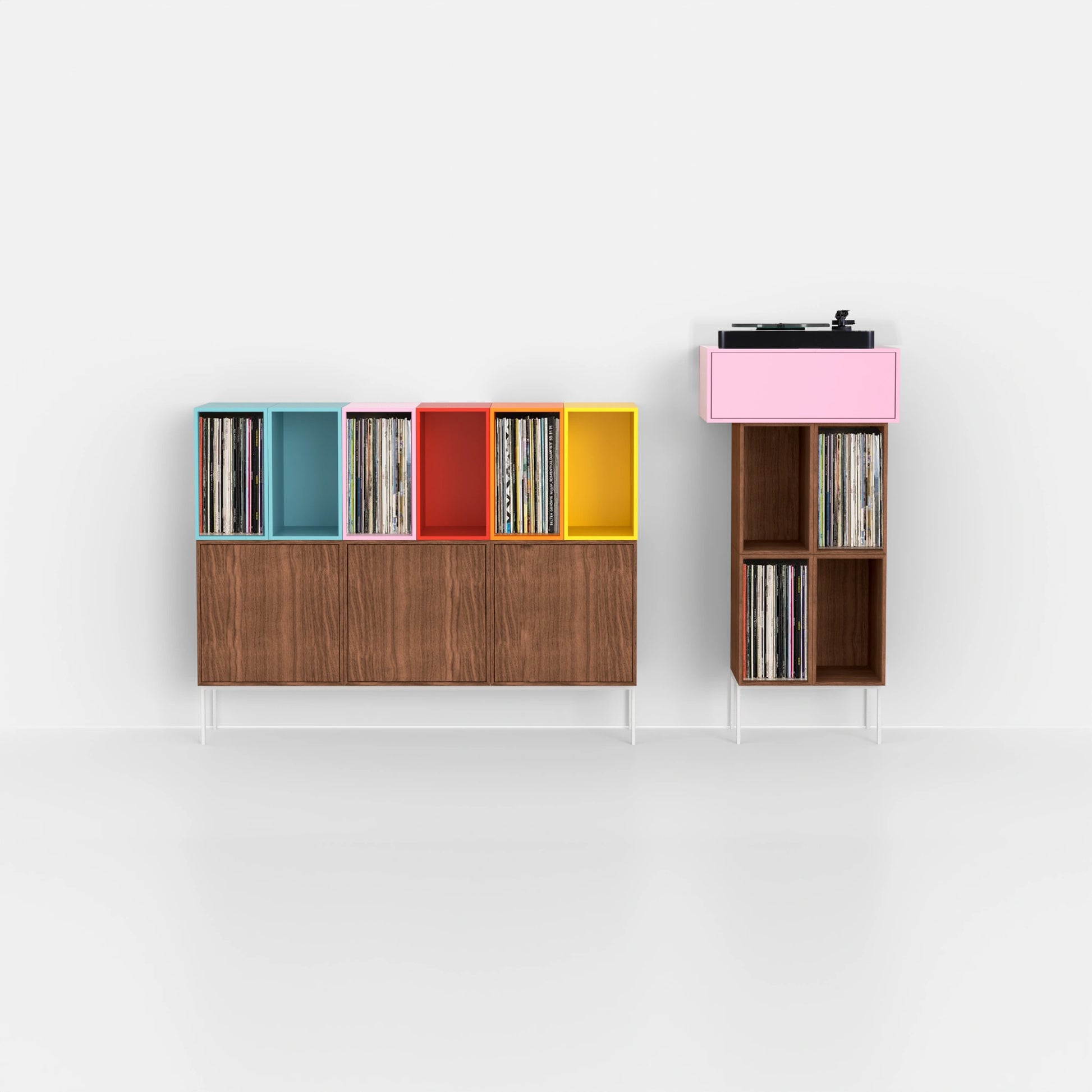 The RK1185 record shelf offers music lovers precise storage in 16 modules. It measures 196 cm in width, 112 cm in height and 41 cm in depth. This shelf fits in large rooms and smaller niches. Choice of colours? From white and elegant walnut to canary yellow and Buddha orange.