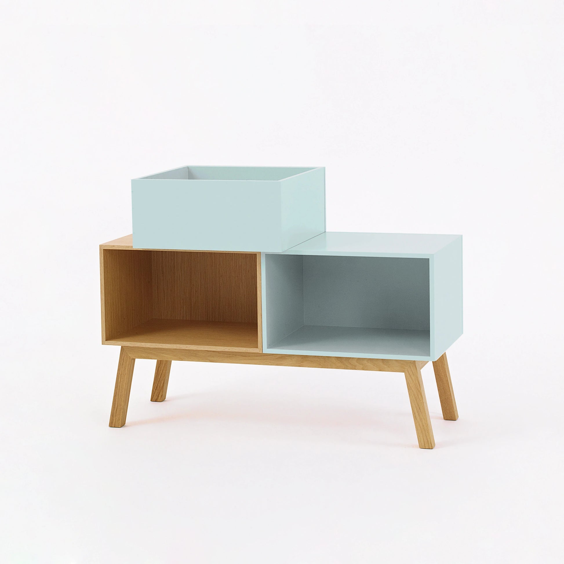 Three modular Cubit shelf boxes, two in light green and one in walnut veneer, arranged freely on the floor, another on a black metal frame