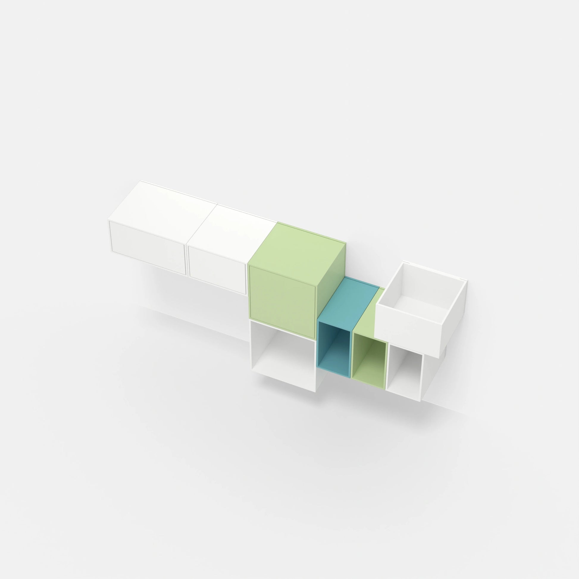 Three modular Cubit shelf boxes, two in light green and one in walnut veneer, arranged freely on the floor, another on a black metal frame
