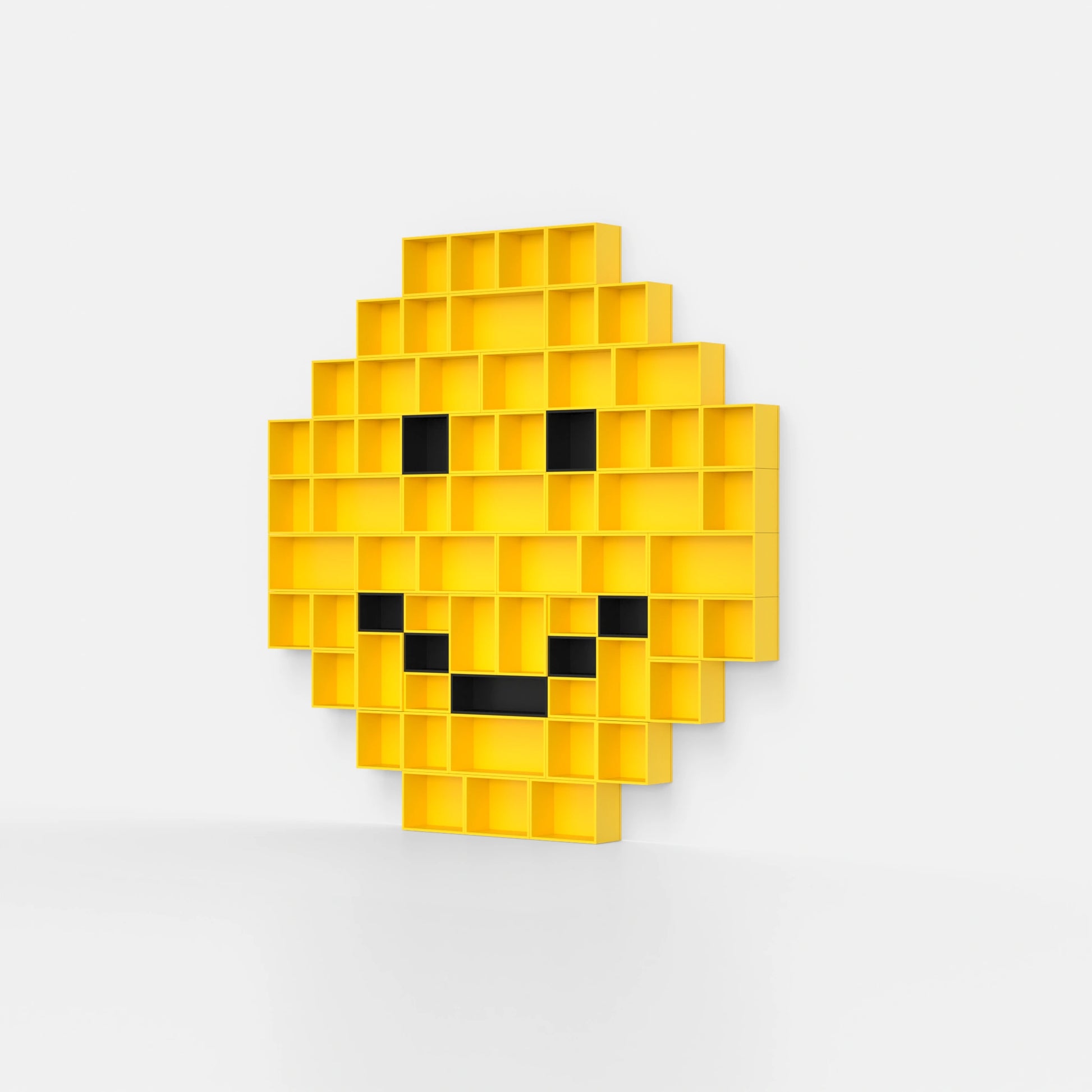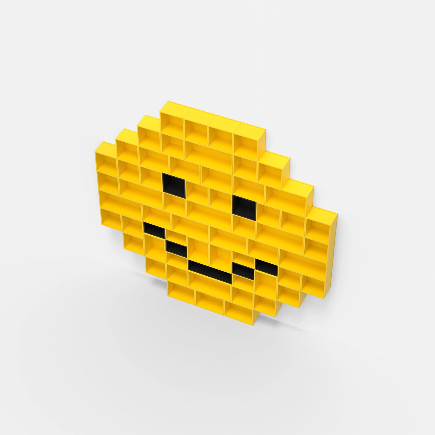 Cubit Wall bookshelf made of coloured modules in shades of red, pink and yellow, dynamically arranged for a lively room design