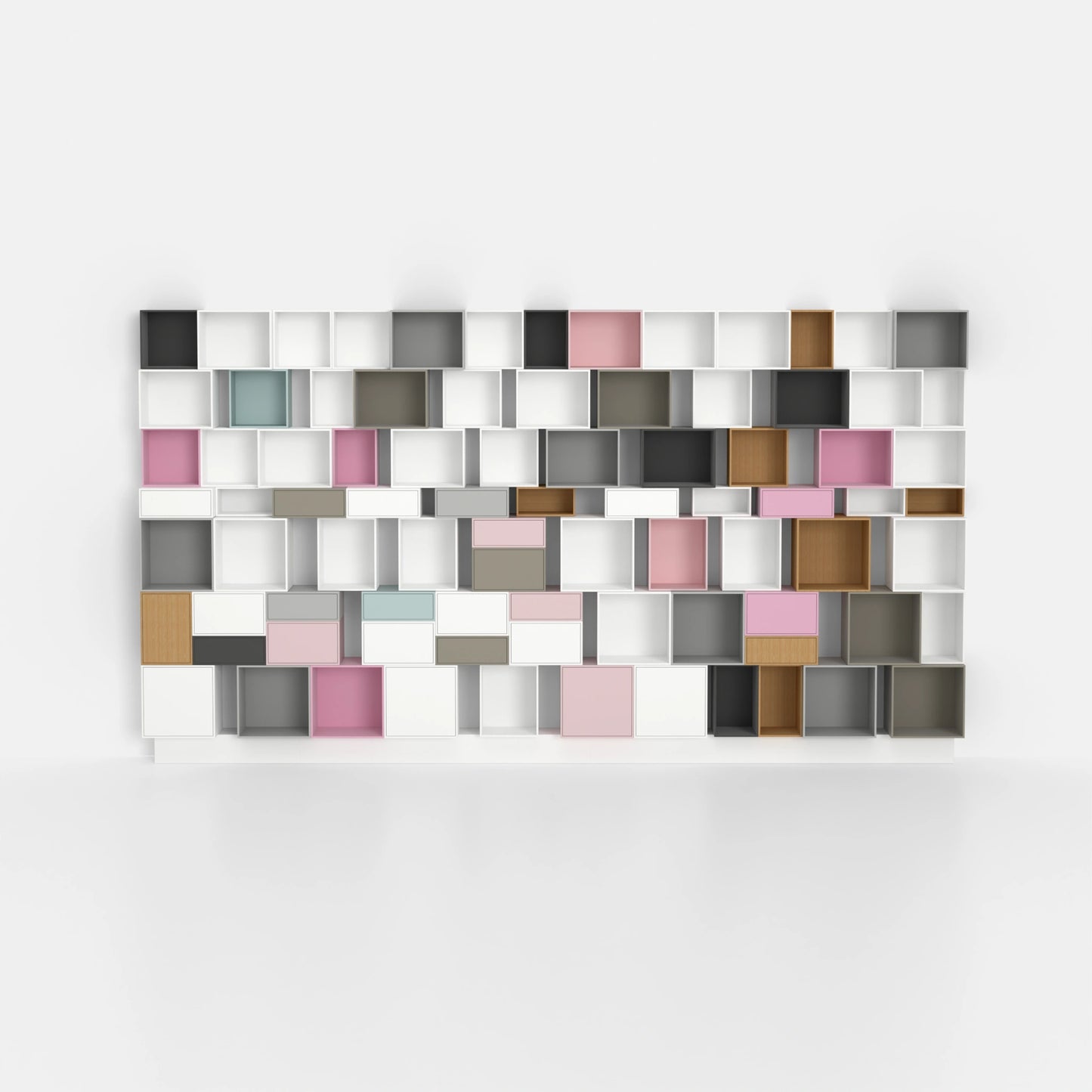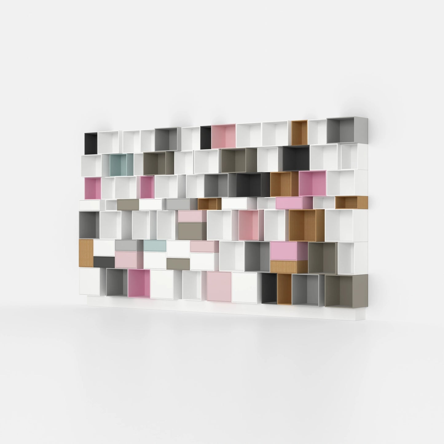 Shelving structure with various Cubit modules in pink and natural tones, combined with door modules and open modules