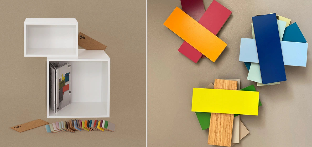 Overview of the Cubit sample package with white shelving modules, sample book and numerous lacquer and veneer samples for colour and material selection