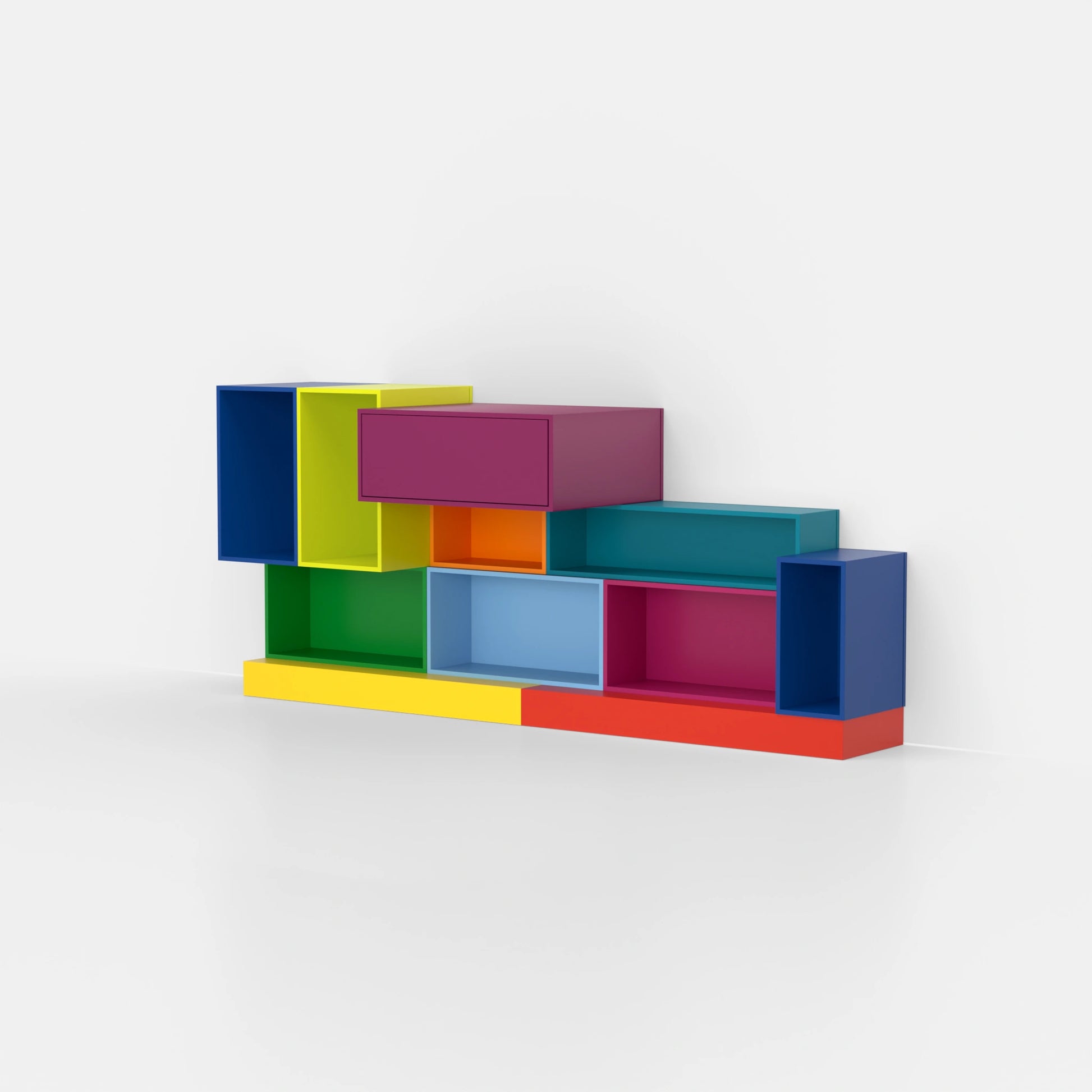 Cubit Wall bookshelf made of coloured modules in shades of red, pink and yellow, dynamically arranged for a lively room design