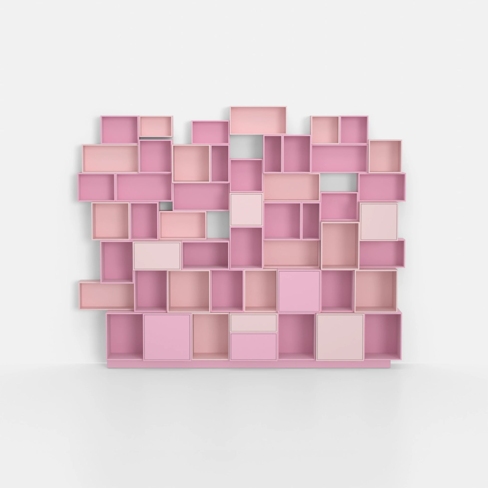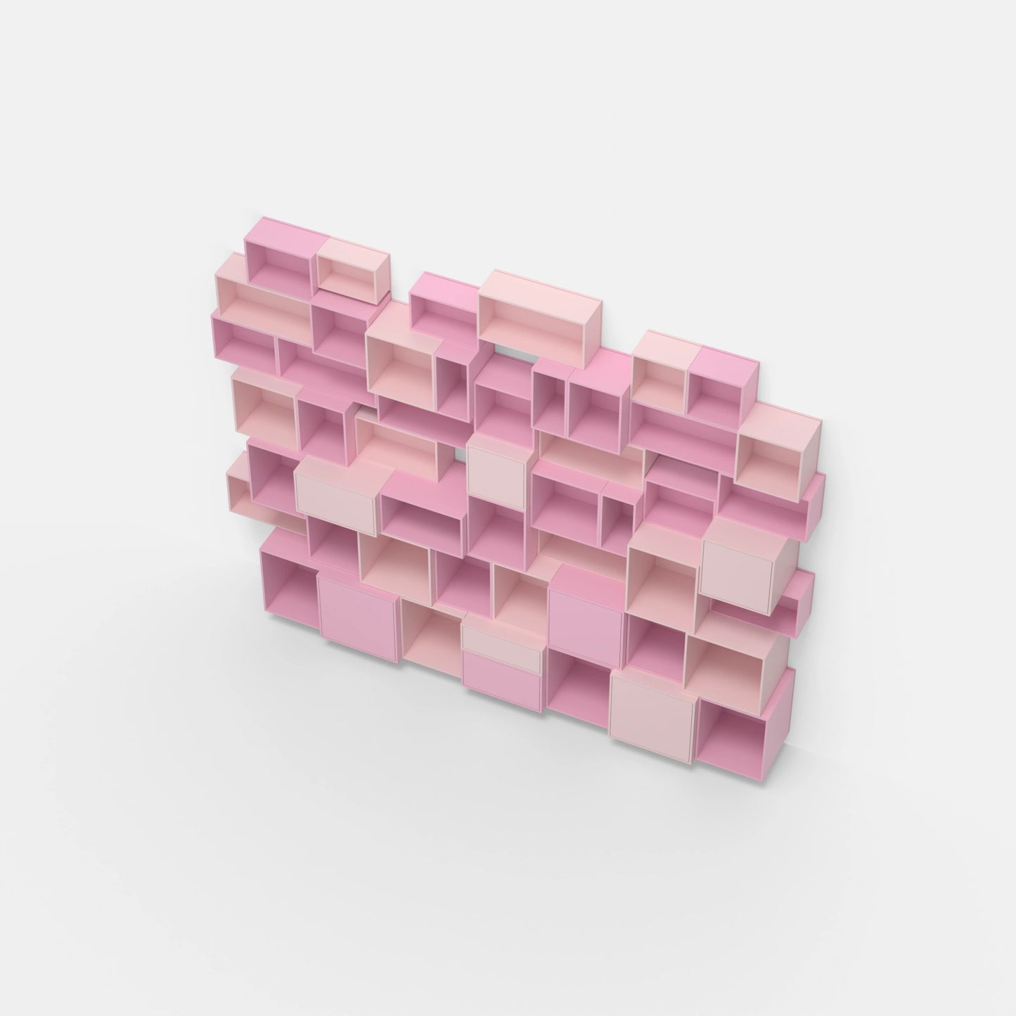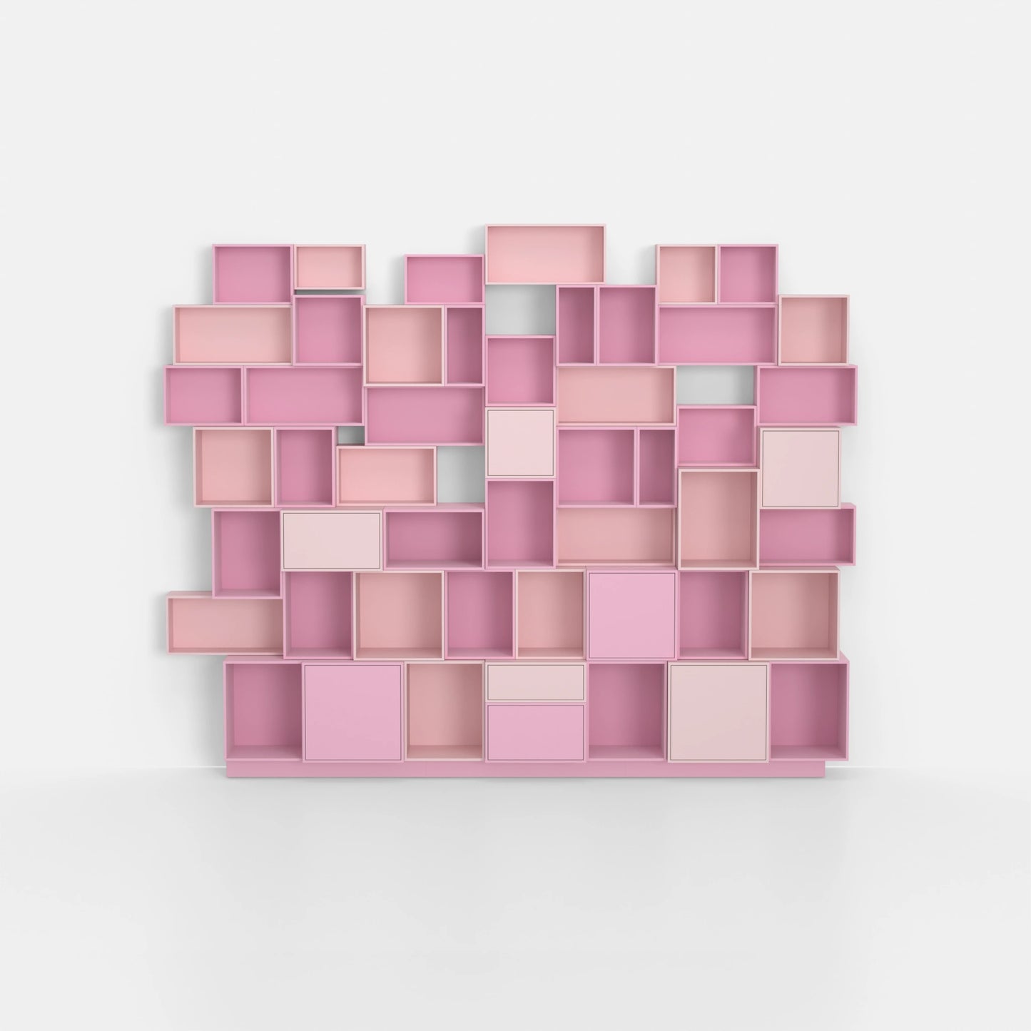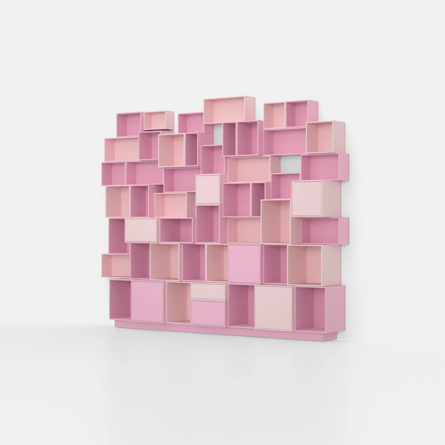Shelving structure with various Cubit modules in pink and natural tones, combined with door modules and open modules