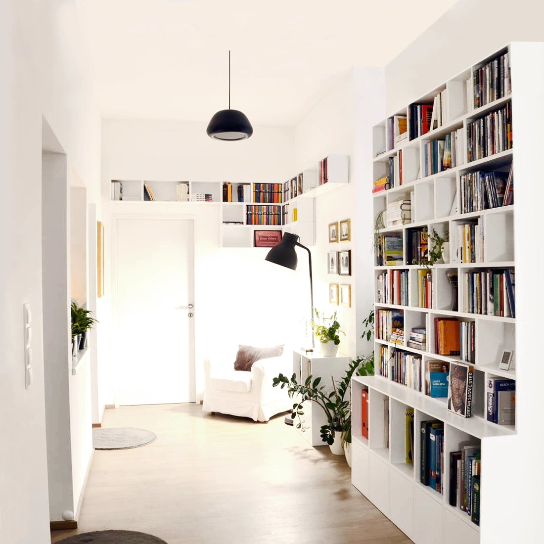 The shelving modules are based on standard literature and music formats, e.g. A4, A5, folders, atlases, illustrated books and records. This size grid based on the contents creates a unique sculptural look.