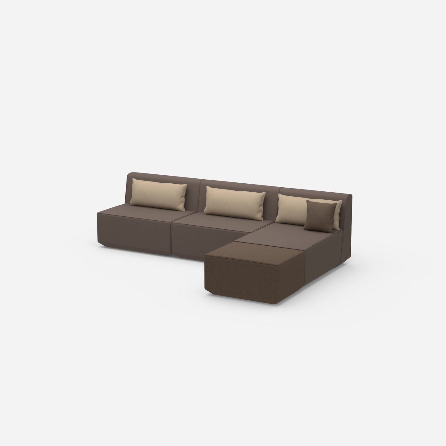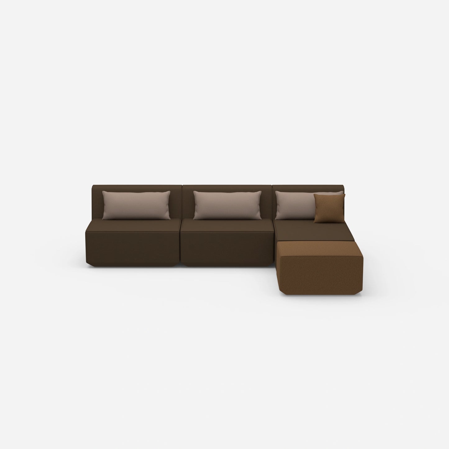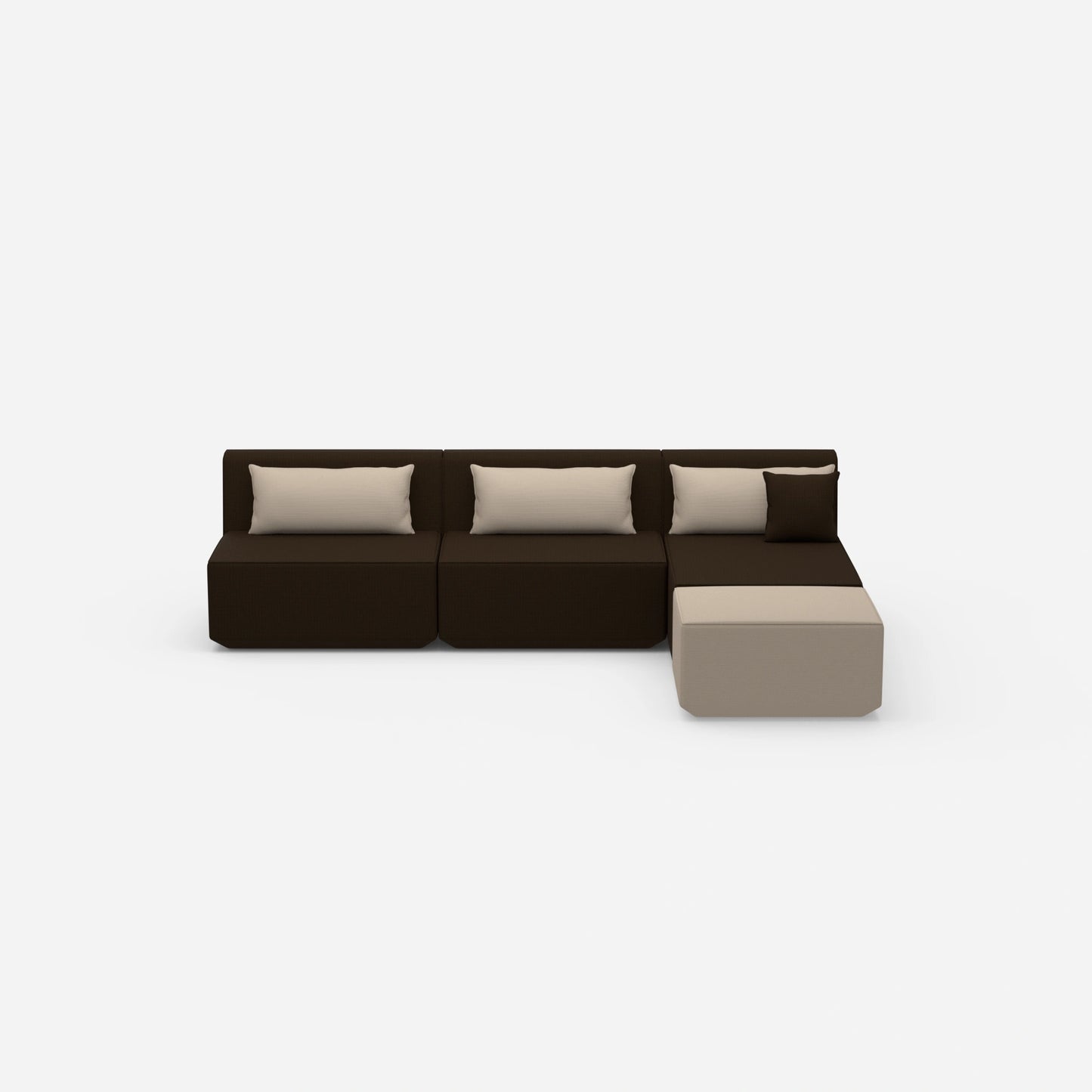 The modular structure consists of four cushions, a pouf module and three backrest modules. These elements can be arranged openly or compactly. They adapt effortlessly to your needs. The colour scheme includes shades such as cream, espresso and nougat. These colours harmonise perfectly with each other. Other variations are possible to emphasise your style.