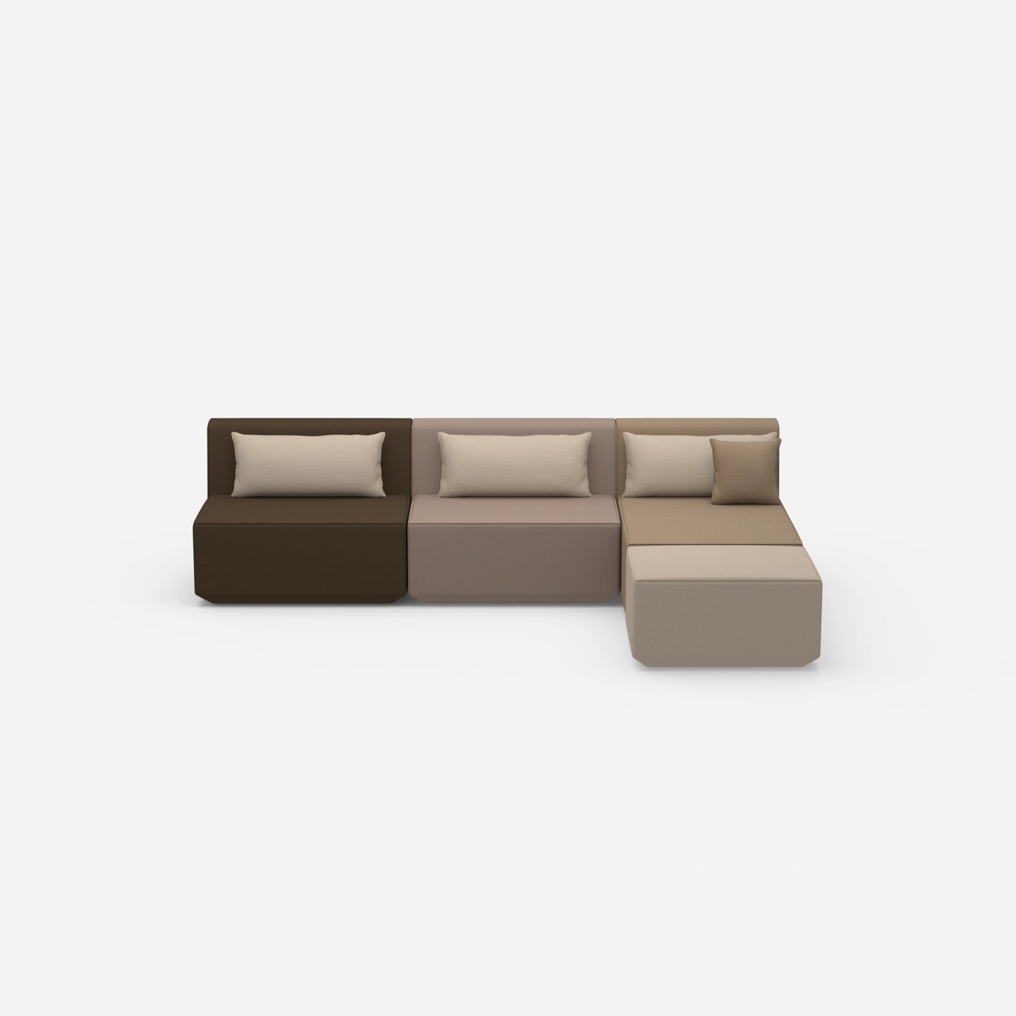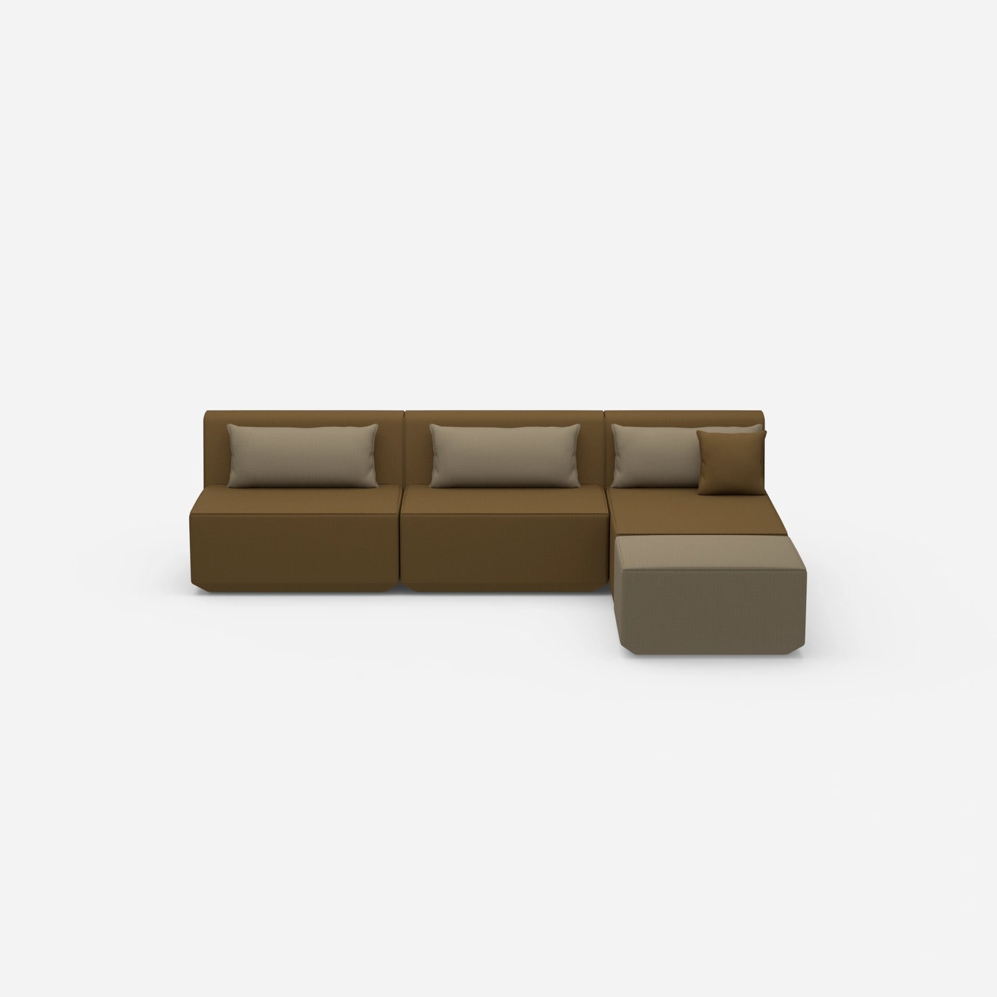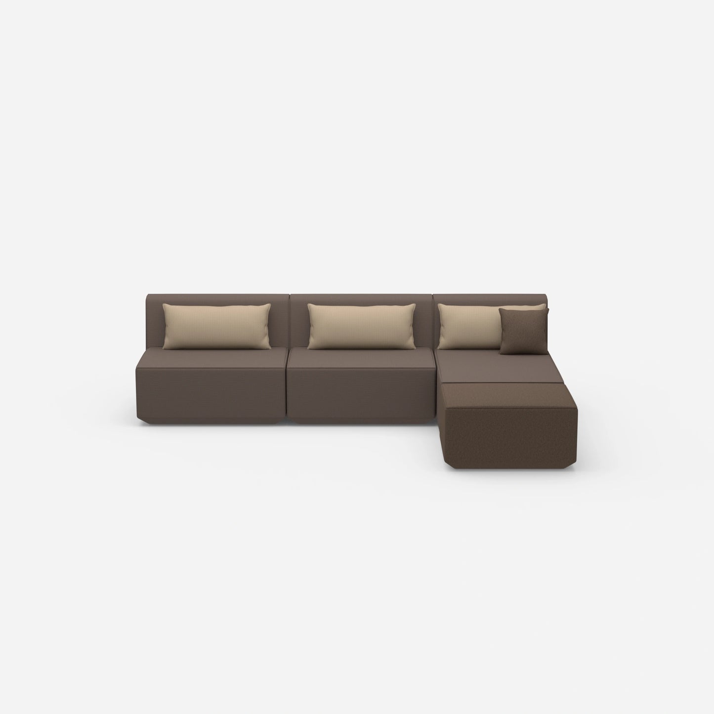 The modular structure consists of four cushions, a pouf module and three backrest modules. These elements can be arranged openly or compactly. They adapt effortlessly to your needs. The colour scheme includes shades such as cream, espresso and nougat. These colours harmonise perfectly with each other. Other variations are possible to emphasise your style.