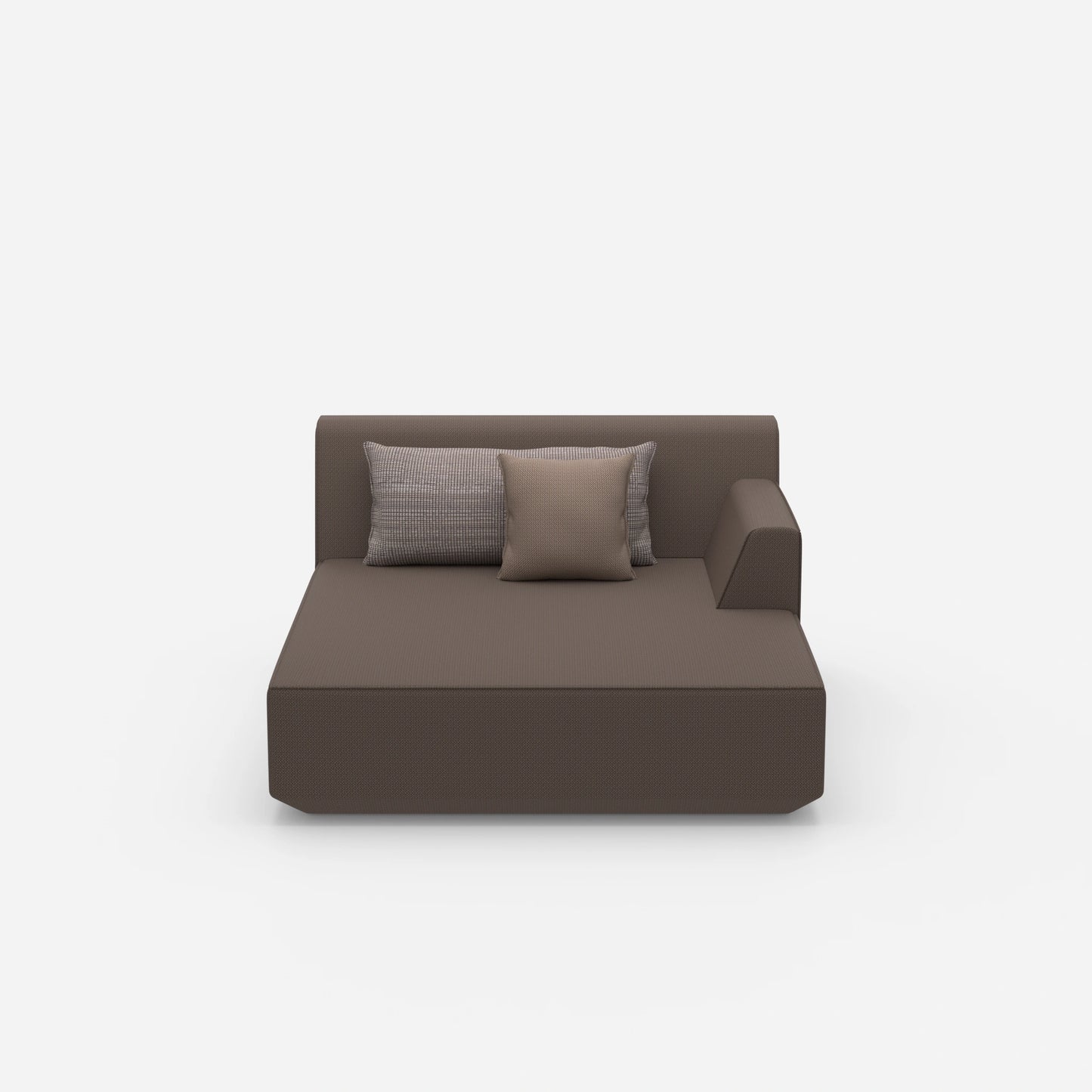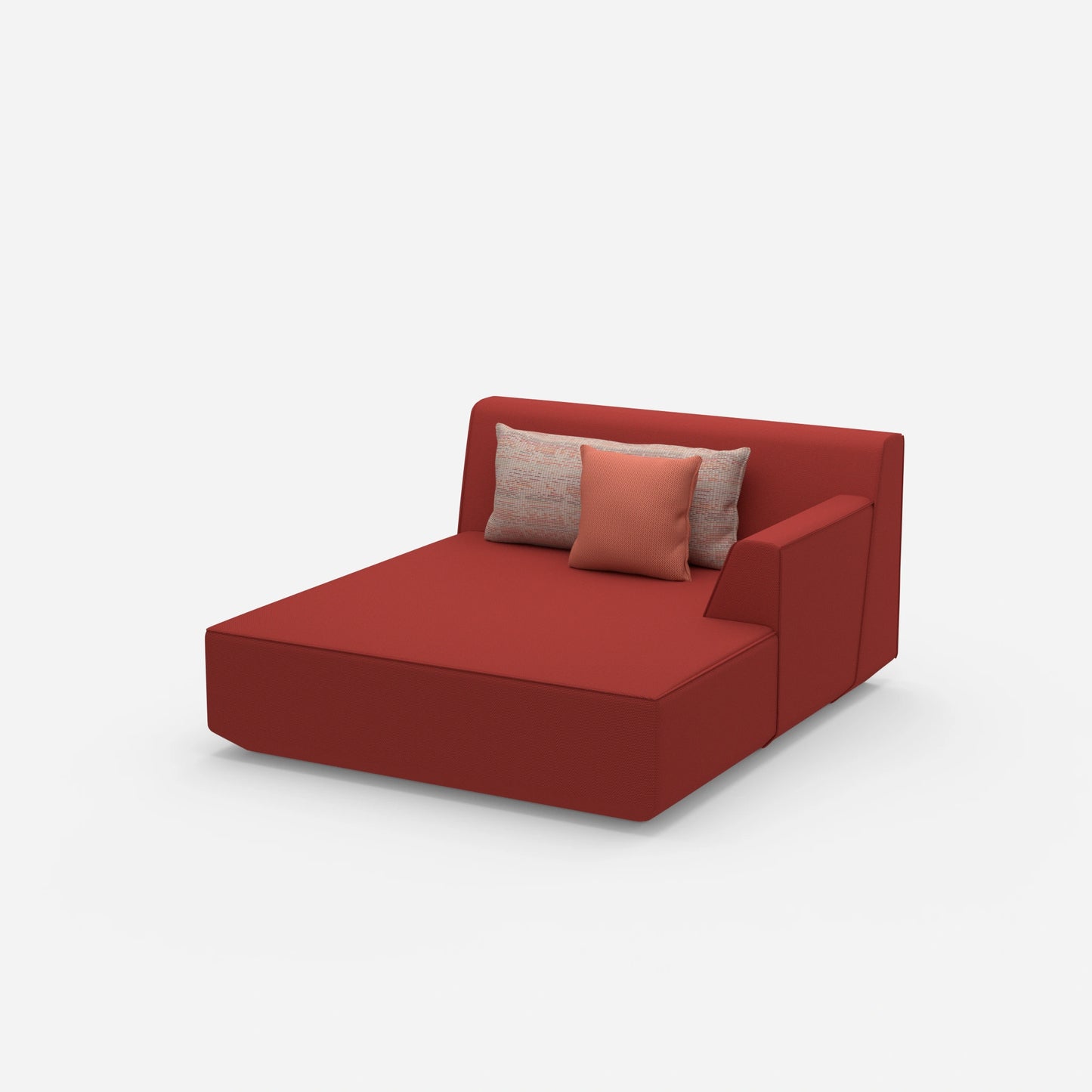 The modular chaise longue for 2 is part of a flexible sofa concept. It consists of a right chaise longue module and two cushions. This structure enables versatile use that is both open and compact.