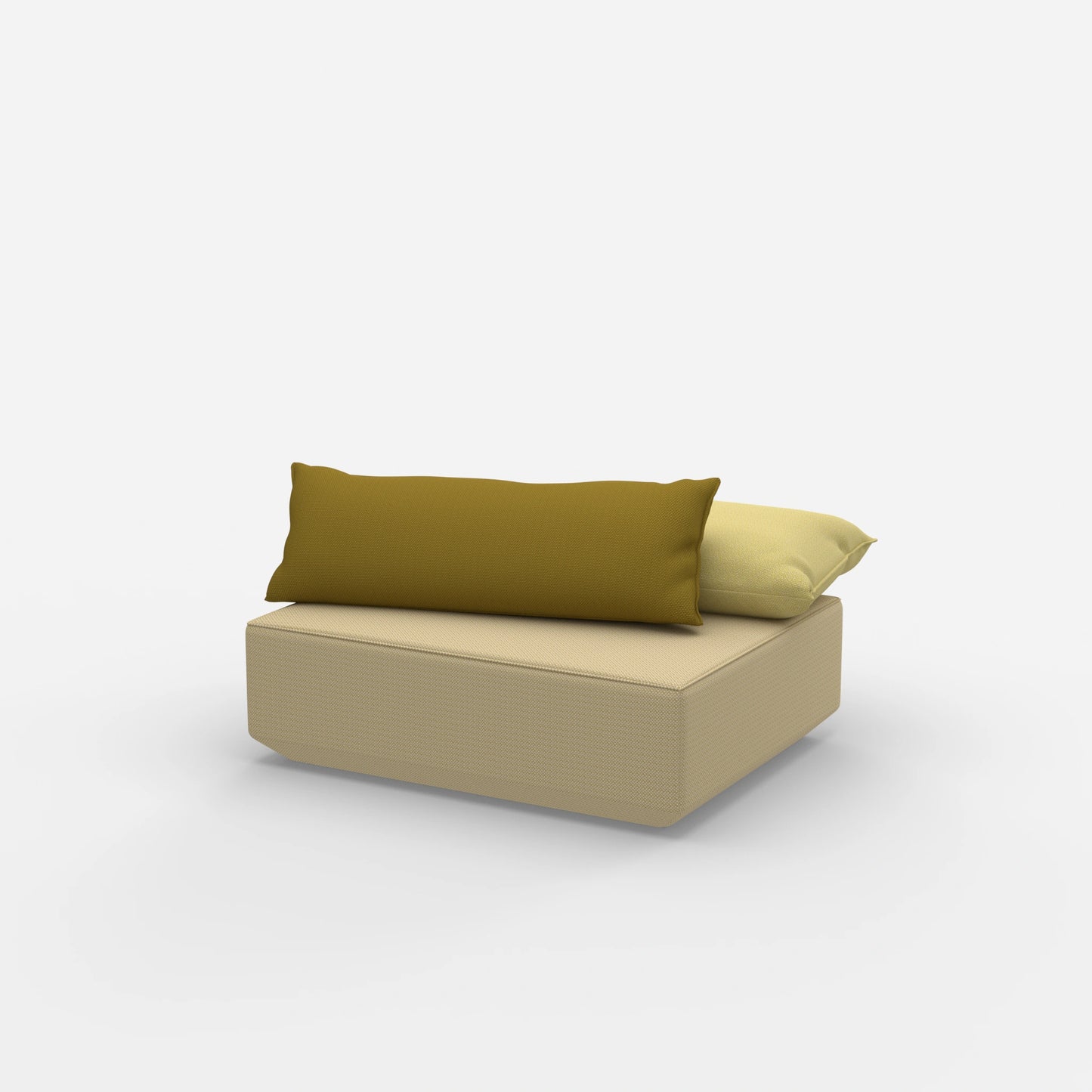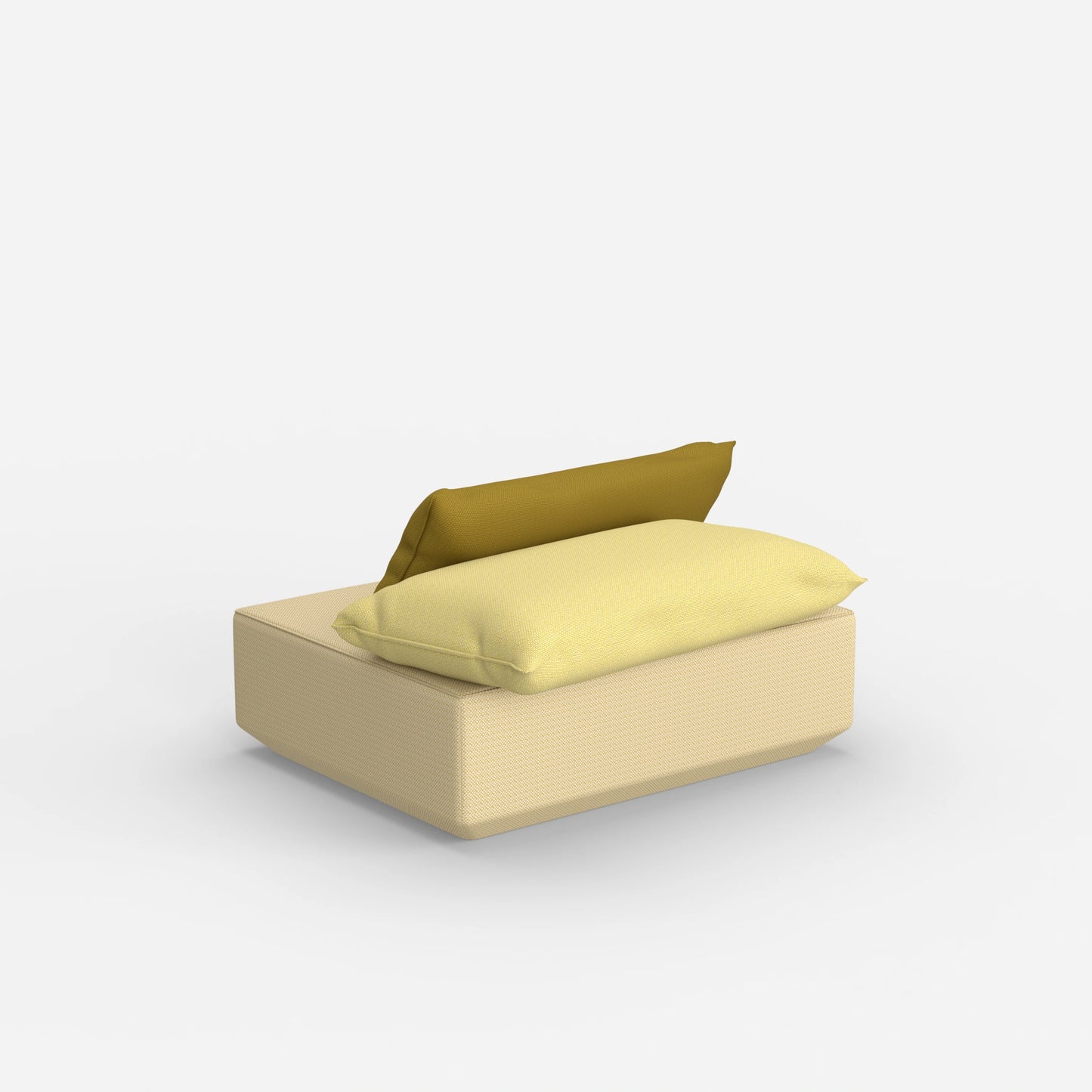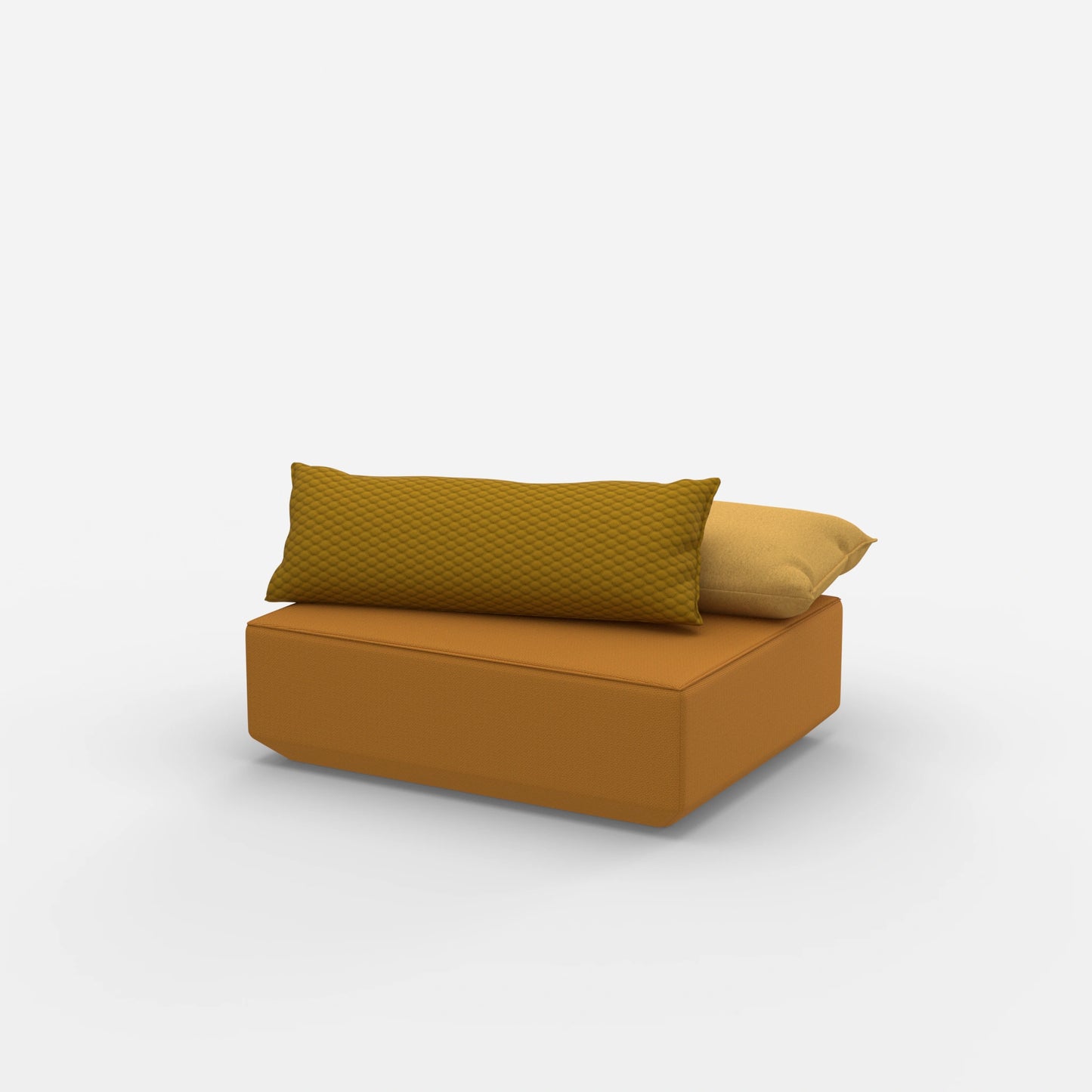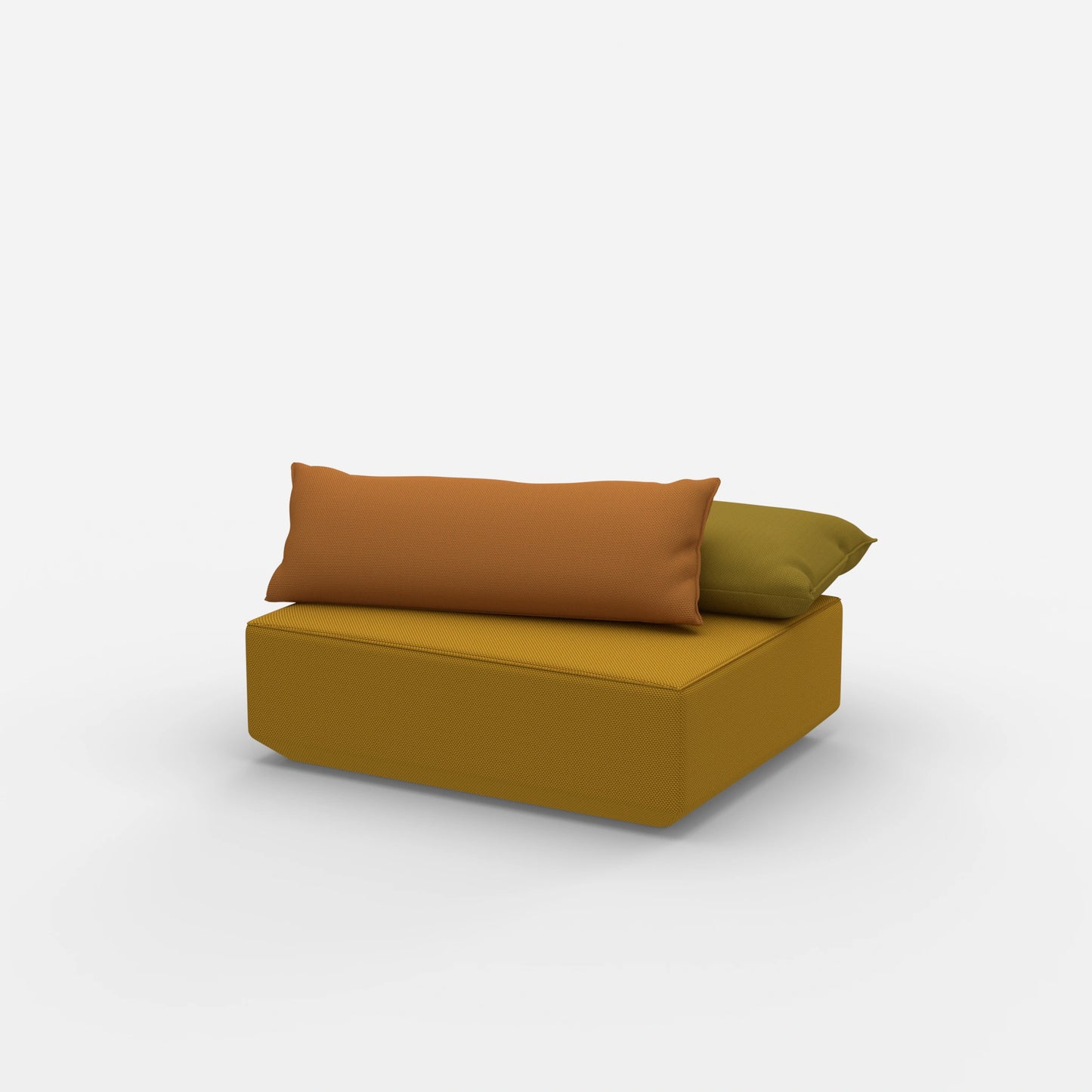 The modular pouf in yellow is revolutionising the world of modular sofas. This unique piece of furniture consists of a pouf module and two cushions. It offers a compact structure and yet remains open for creative design.