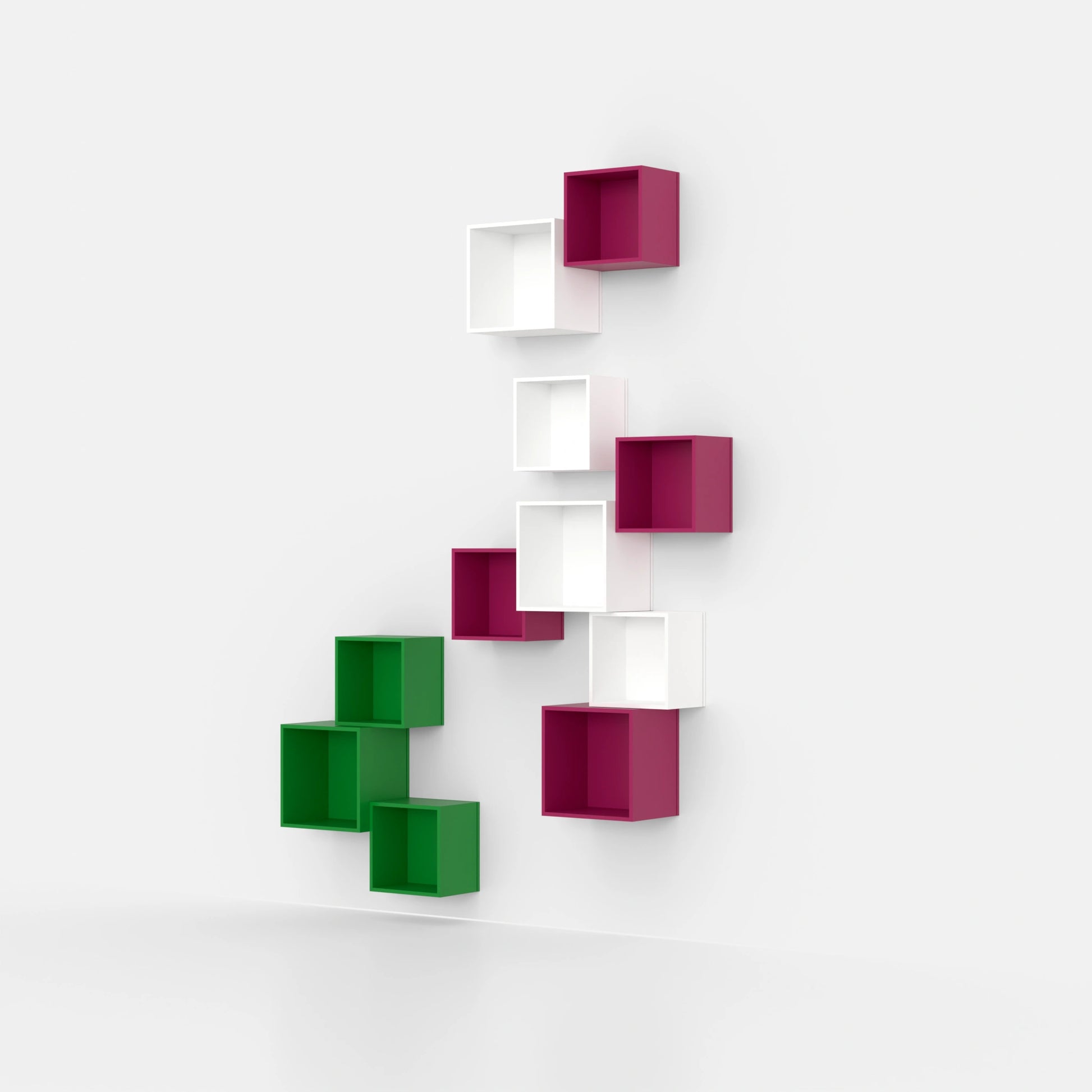Cubit Wall bookshelf made of coloured modules in shades of red, pink and yellow, dynamically arranged for a lively room design