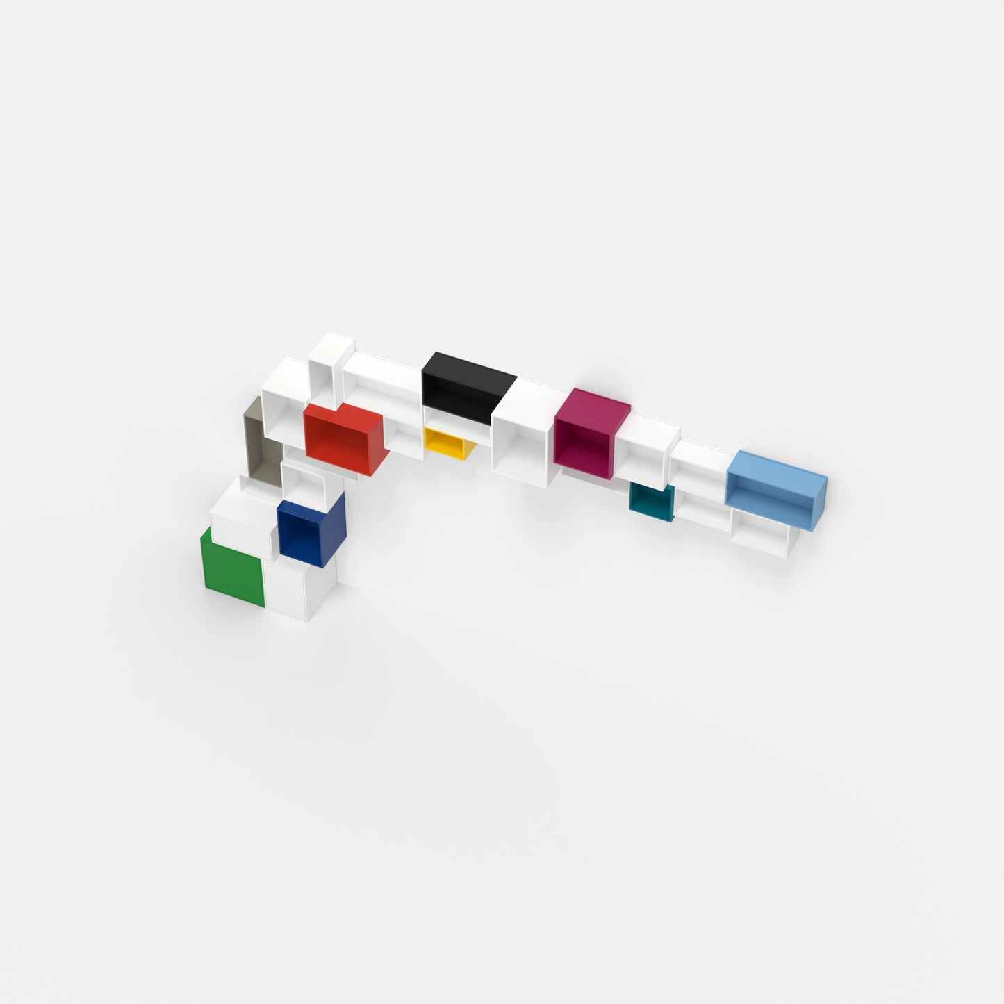 Cubit Wall bookshelf made of coloured modules in shades of red, pink and yellow, dynamically arranged for a lively room design