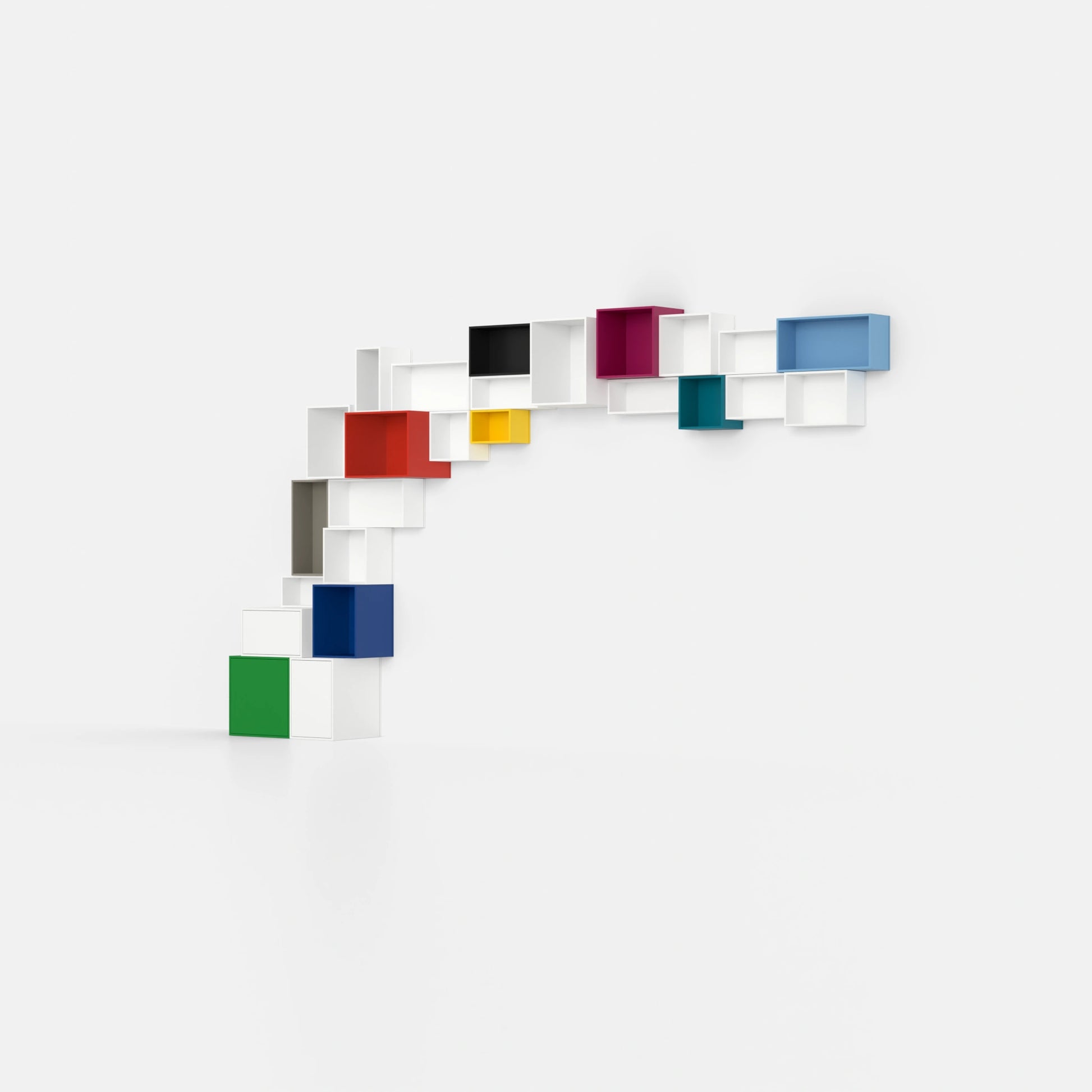 Cubit shelves in all colours of the rainbow as a wall installation, arranged in a flowing colour gradient - an expression of maximum colour variety and design freedom