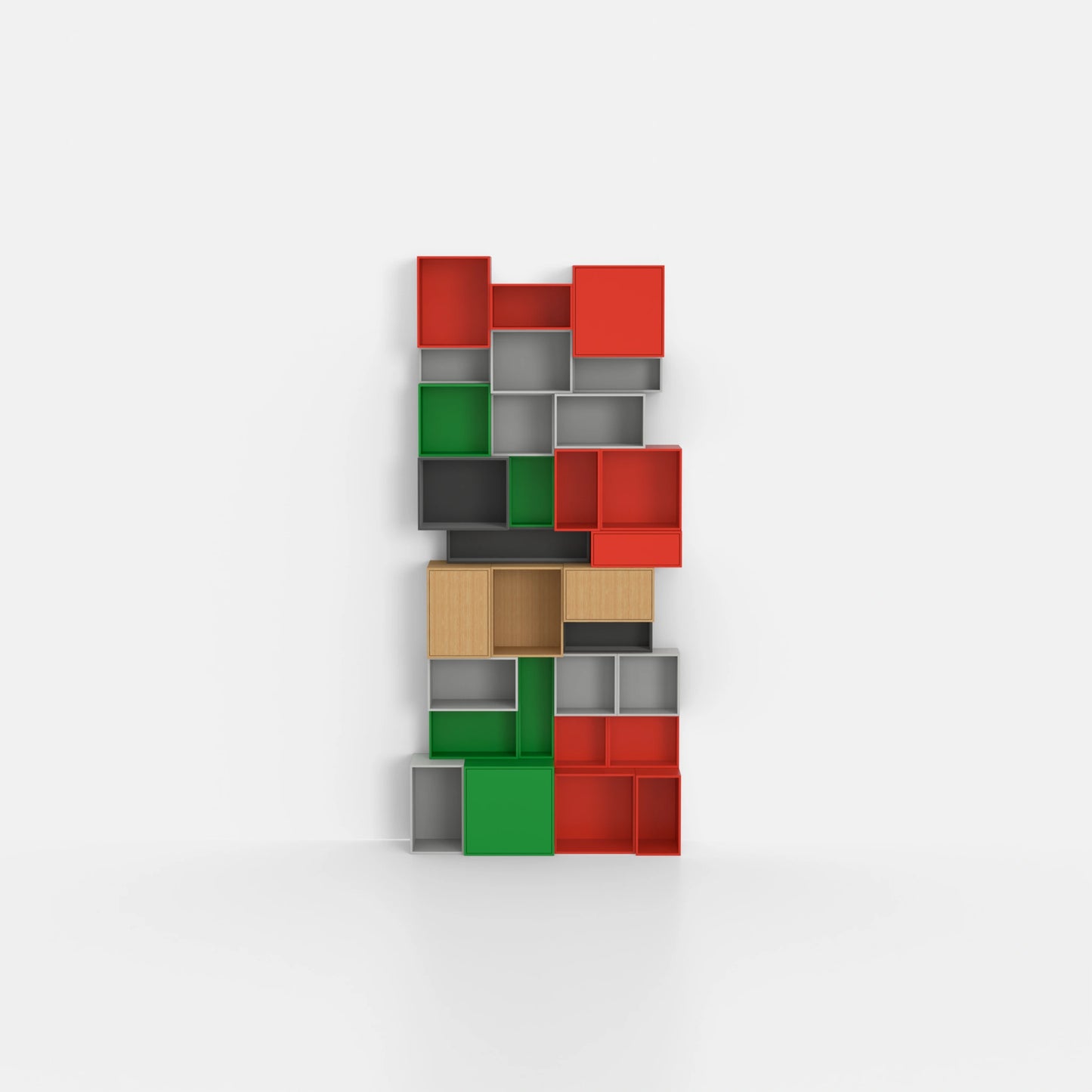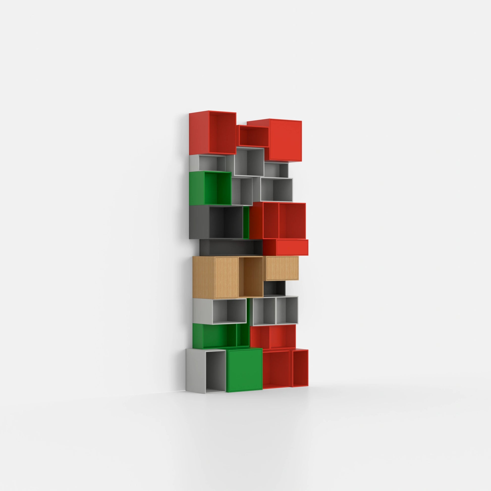 Cubit Wall bookshelf made of coloured modules in shades of red, pink and yellow, dynamically arranged for a lively room design