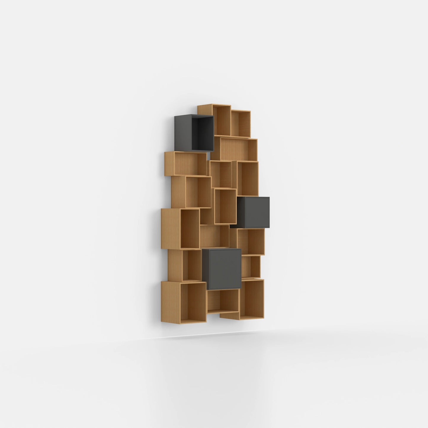 The RK1102 modular shelving unit offers flexibility and style for your home or office. With its 19 customisable modules at 112 cm wide, 216 cm high and 37 cm deep, it adapts to your needs.