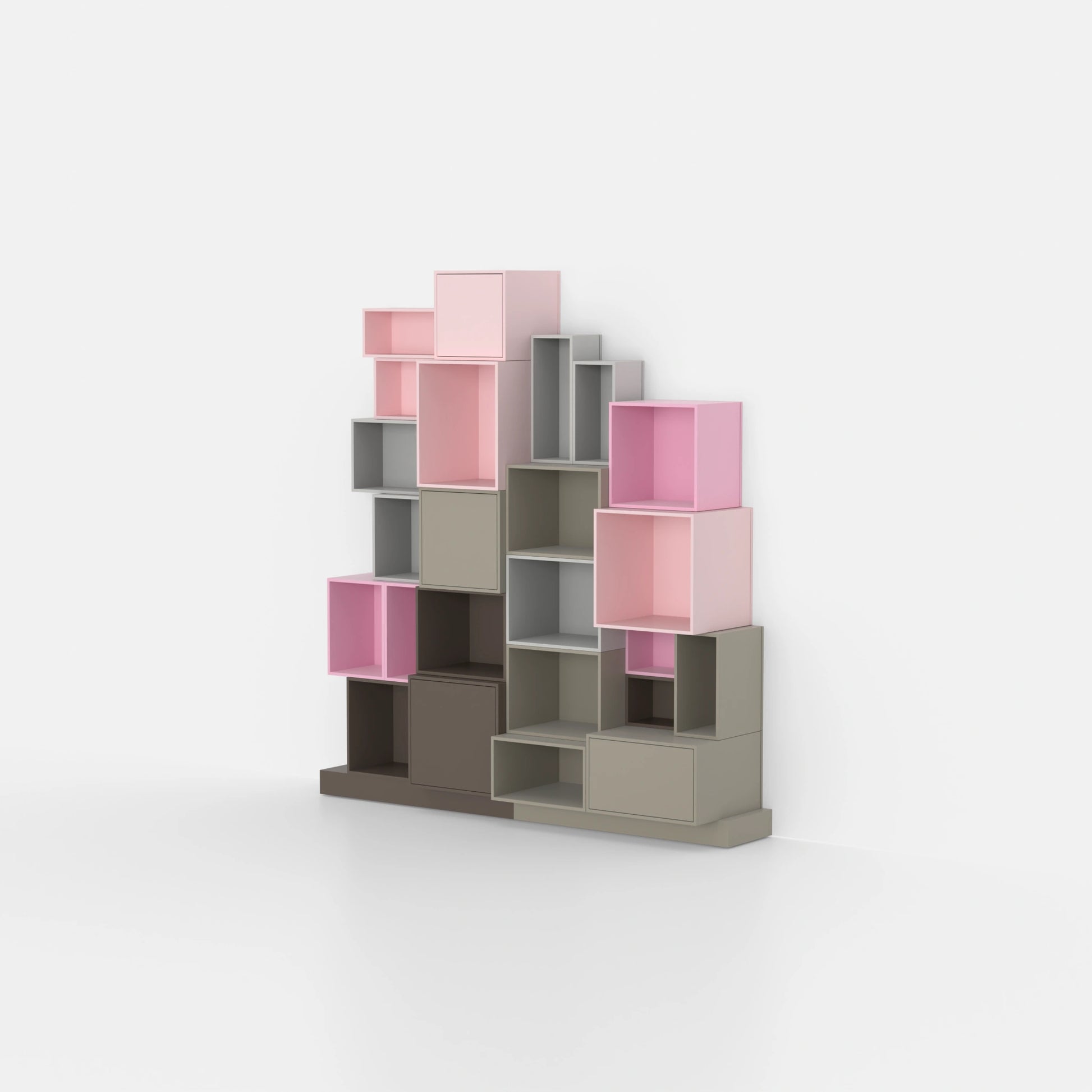 Shelving structure with various Cubit modules in pink and natural tones, combined with door modules and open modules