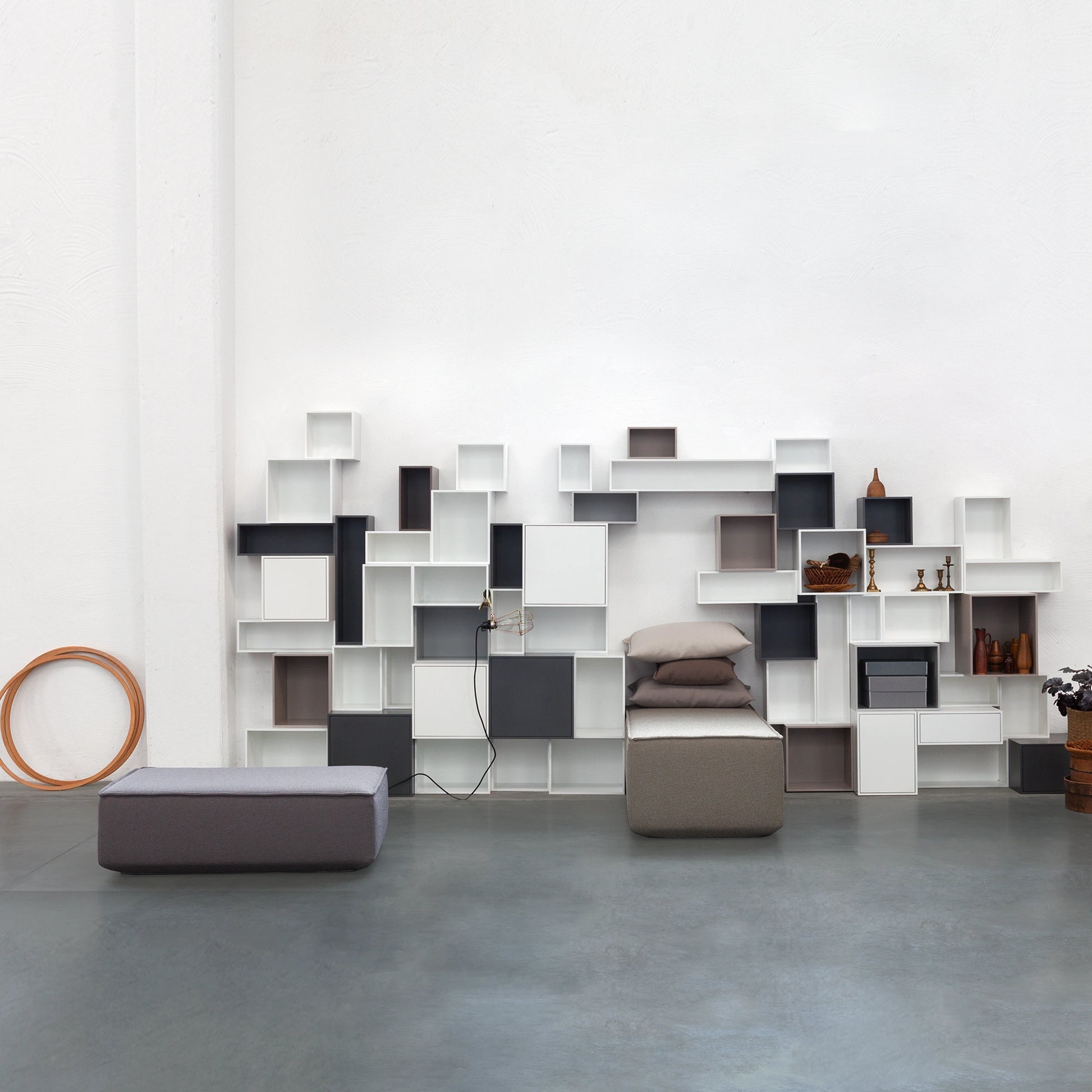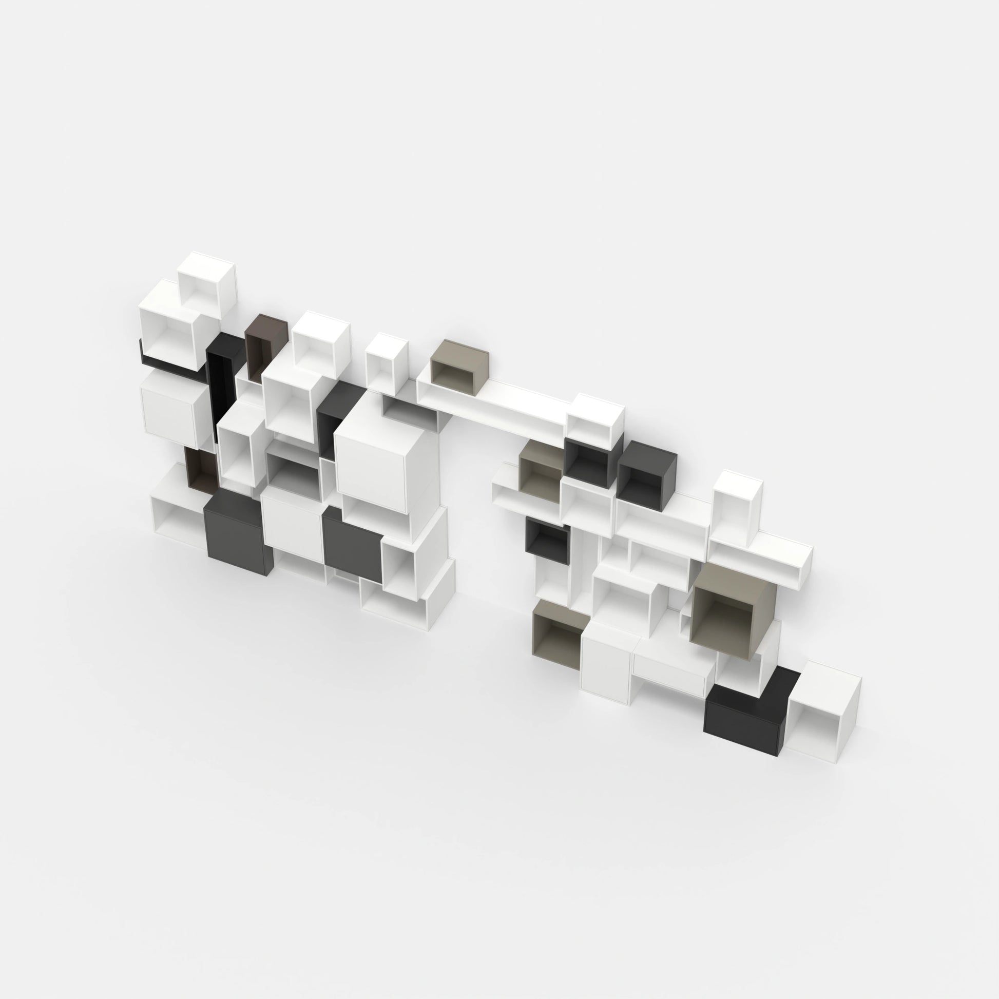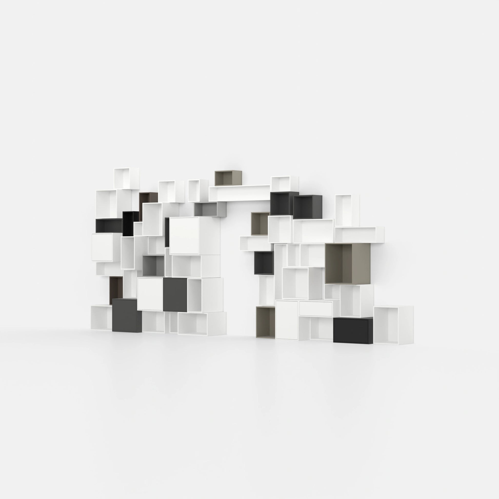With 56 modules, this shelf offers colors such as white, black and shades of greyfango grey light, dark grey, fango grey and light grey). This color palette was chosen to fit into both modern and classic spaces. Mix and match the colors to your taste for creative designs.