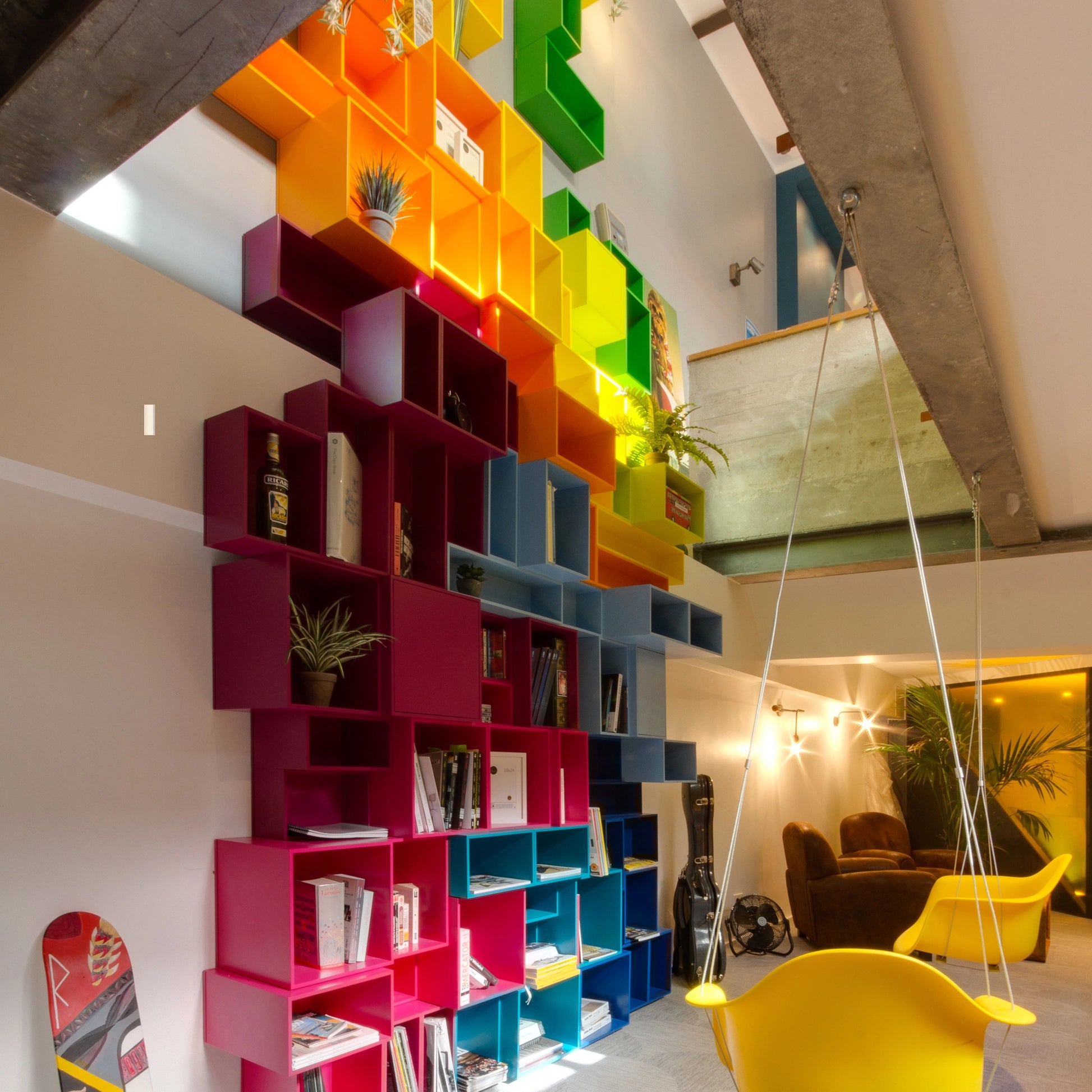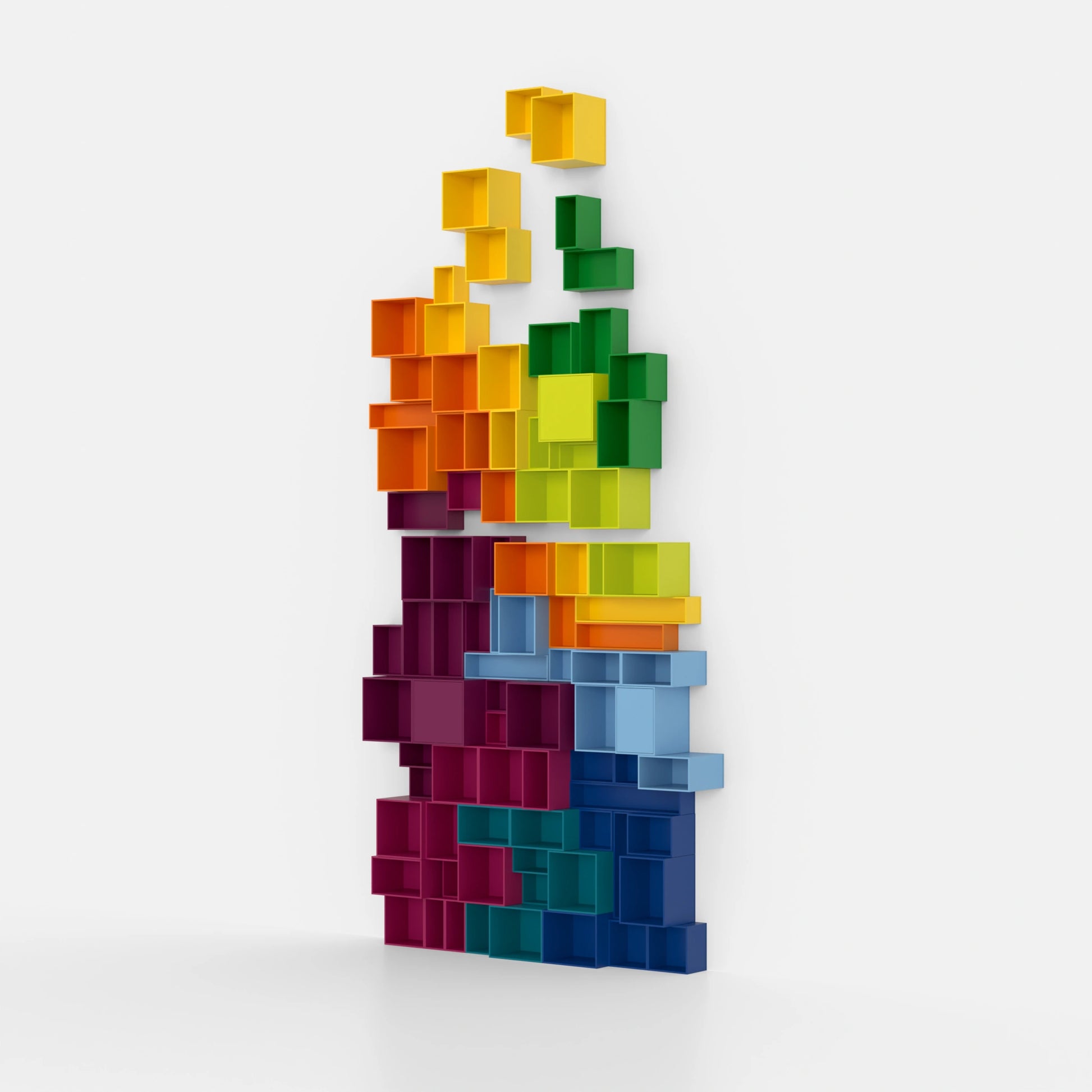 Cubit Wall bookshelf made of coloured modules in shades of red, pink and yellow, dynamically arranged for a lively room design