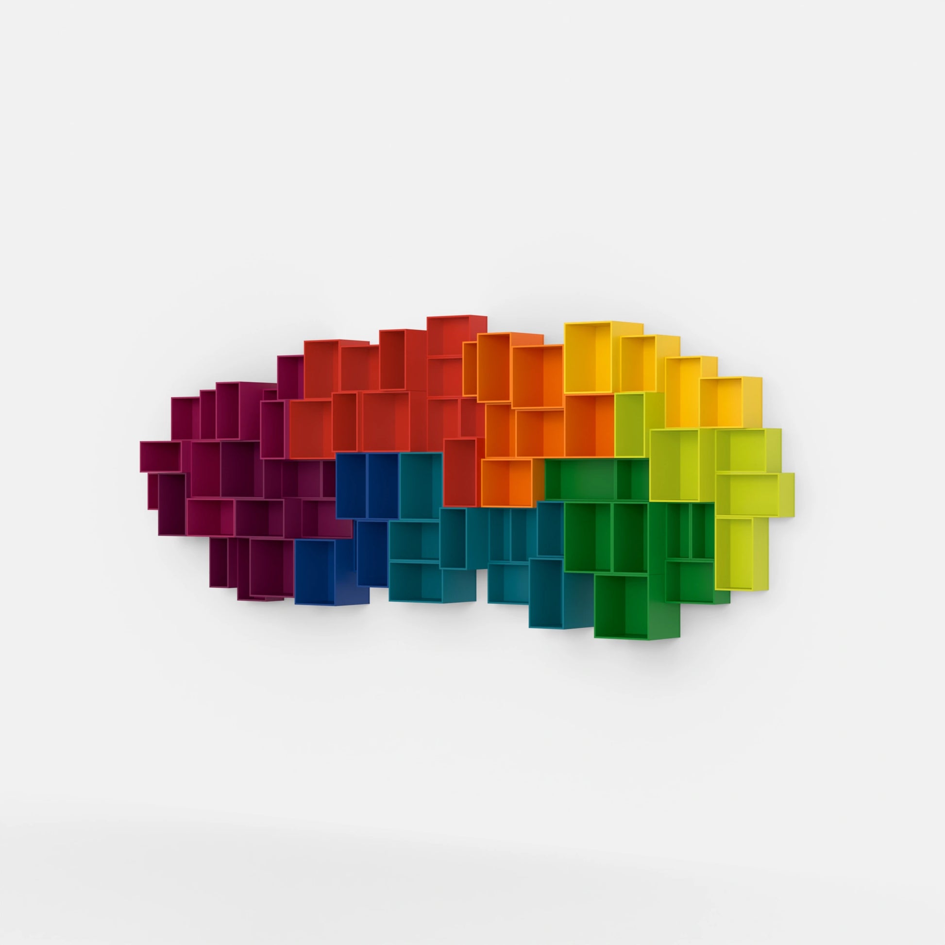 Cubit shelves in all colours of the rainbow as a wall installation, arranged in a flowing colour gradient - an expression of maximum colour variety and design freedom