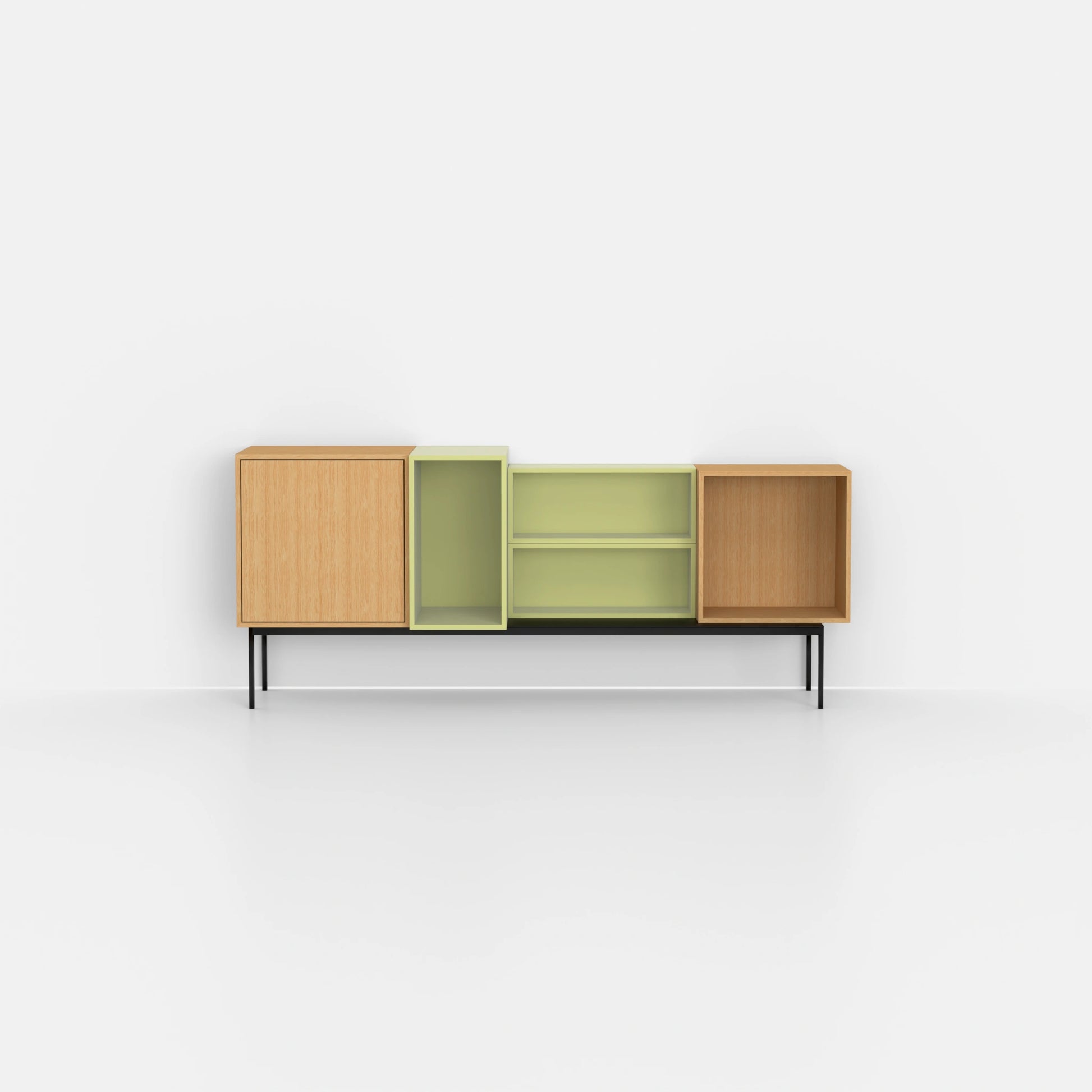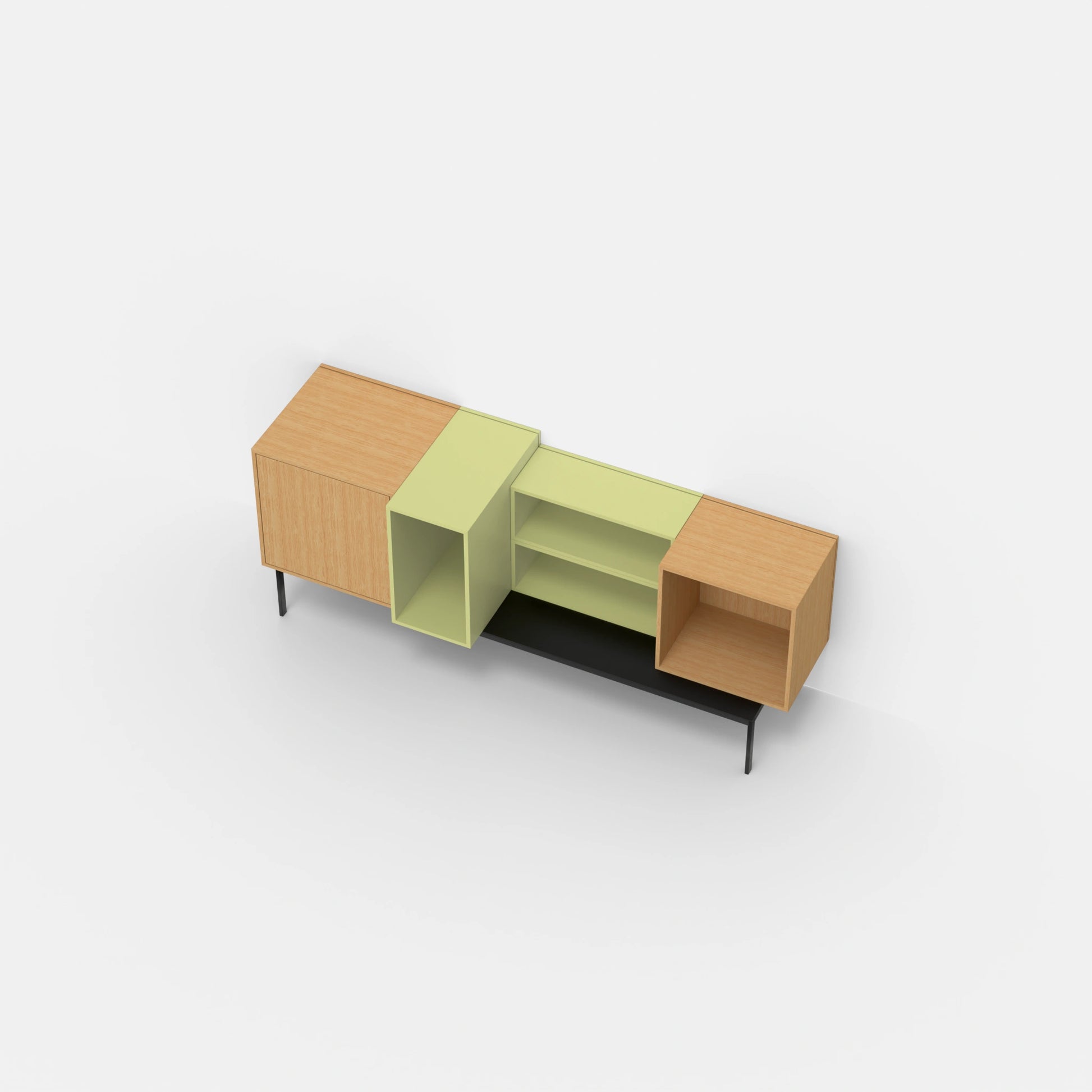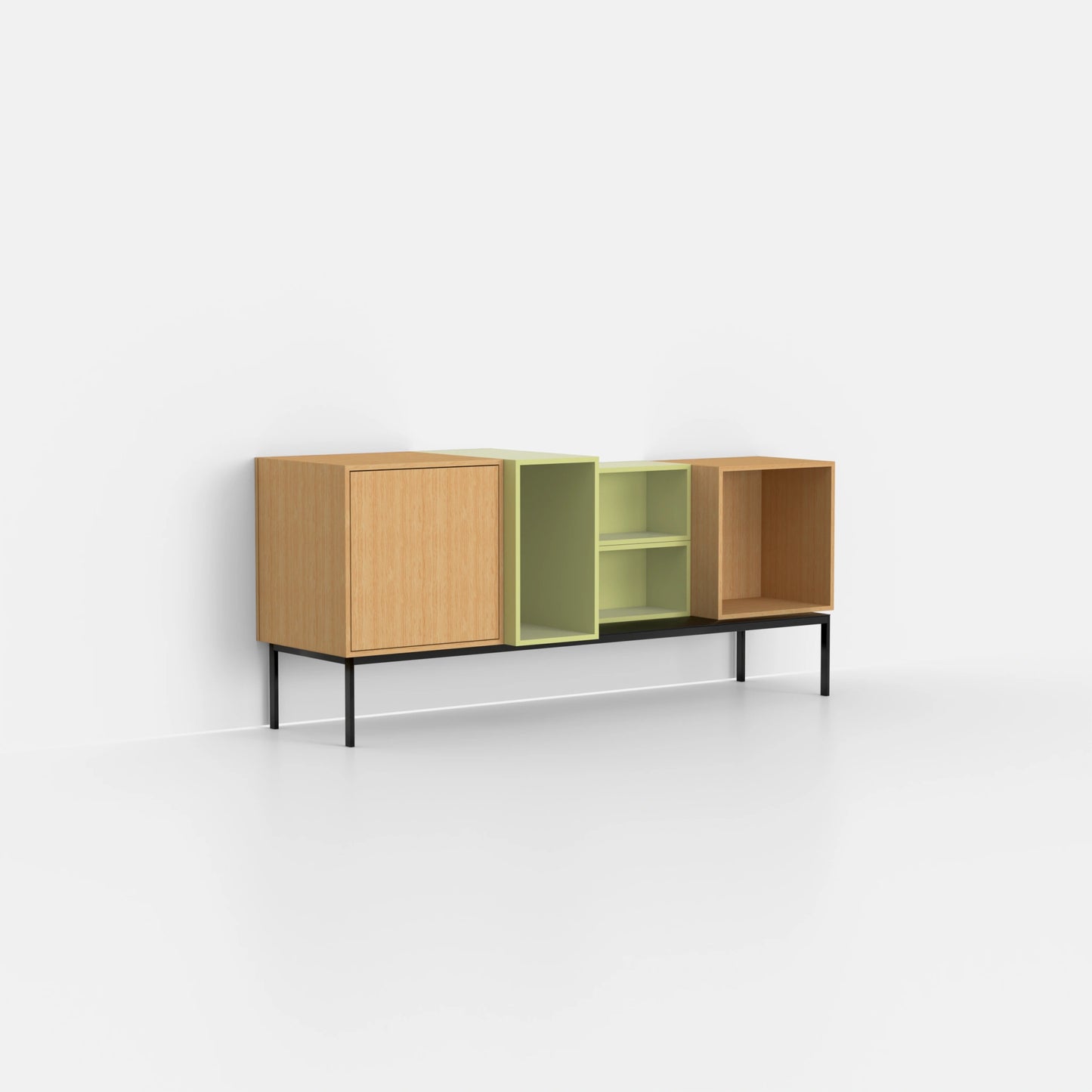 Three modular Cubit shelf boxes, two in light green and one in walnut veneer, arranged freely on the floor, another on a black metal frame