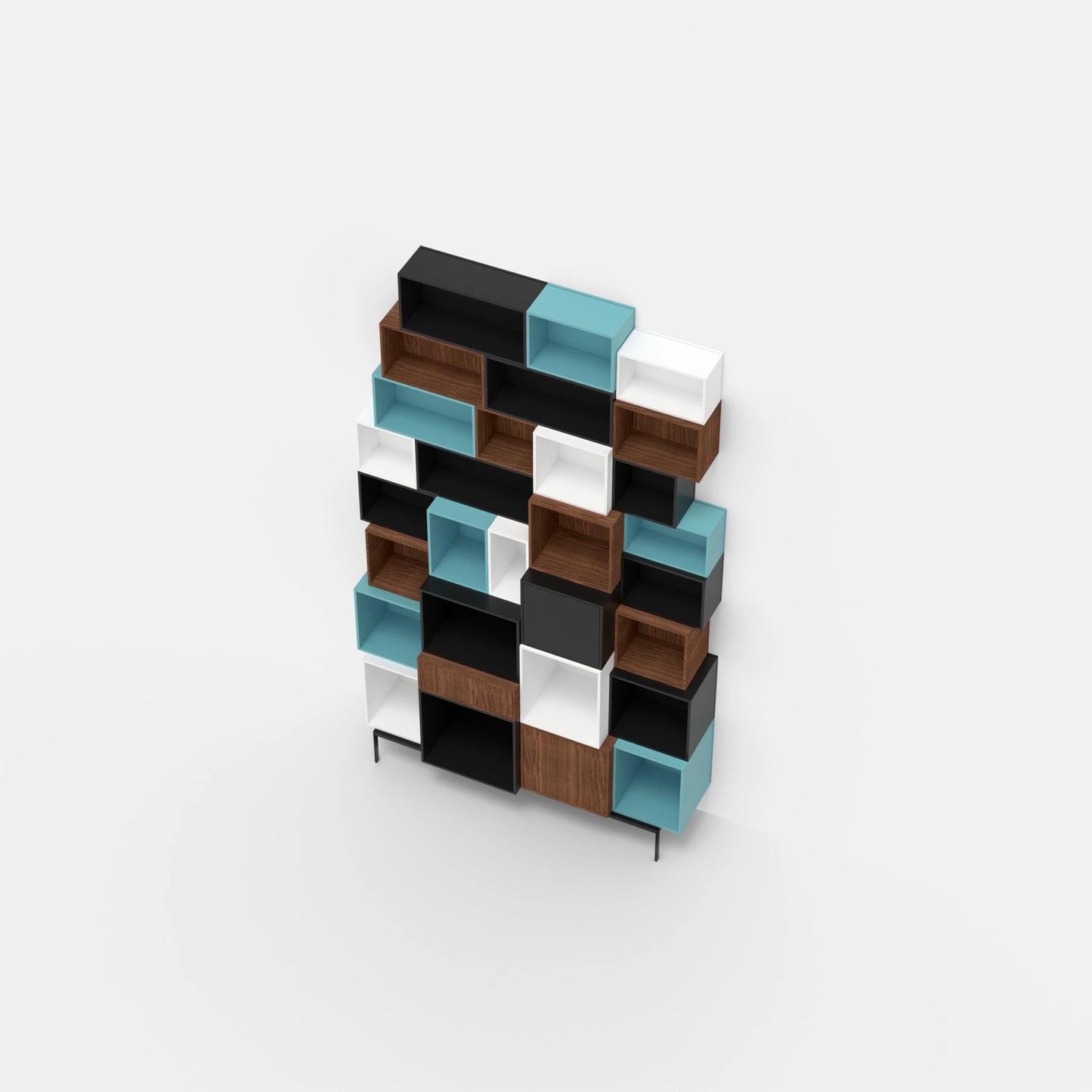 Three modular Cubit shelf boxes, two in light green and one in walnut veneer, arranged freely on the floor, another on a black metal frame