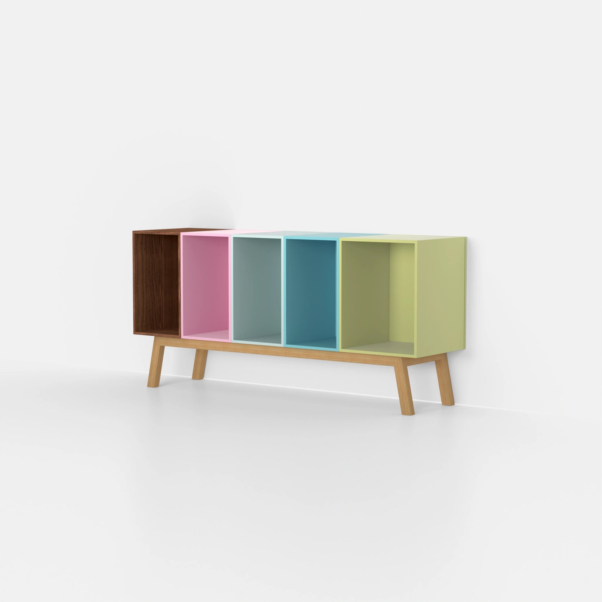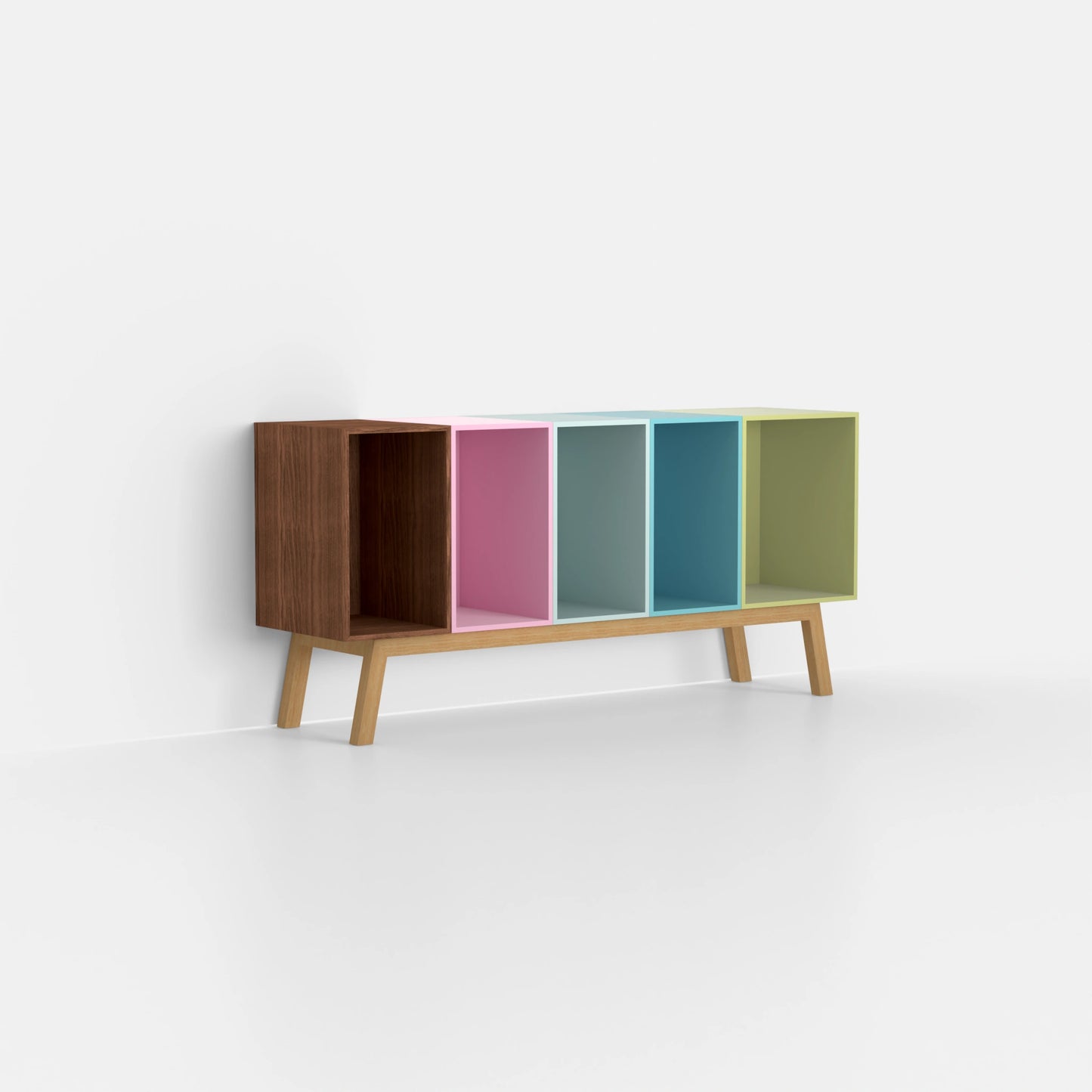 Three modular Cubit shelf boxes, two in light green and one in walnut veneer, arranged freely on the floor, another on a black metal frame