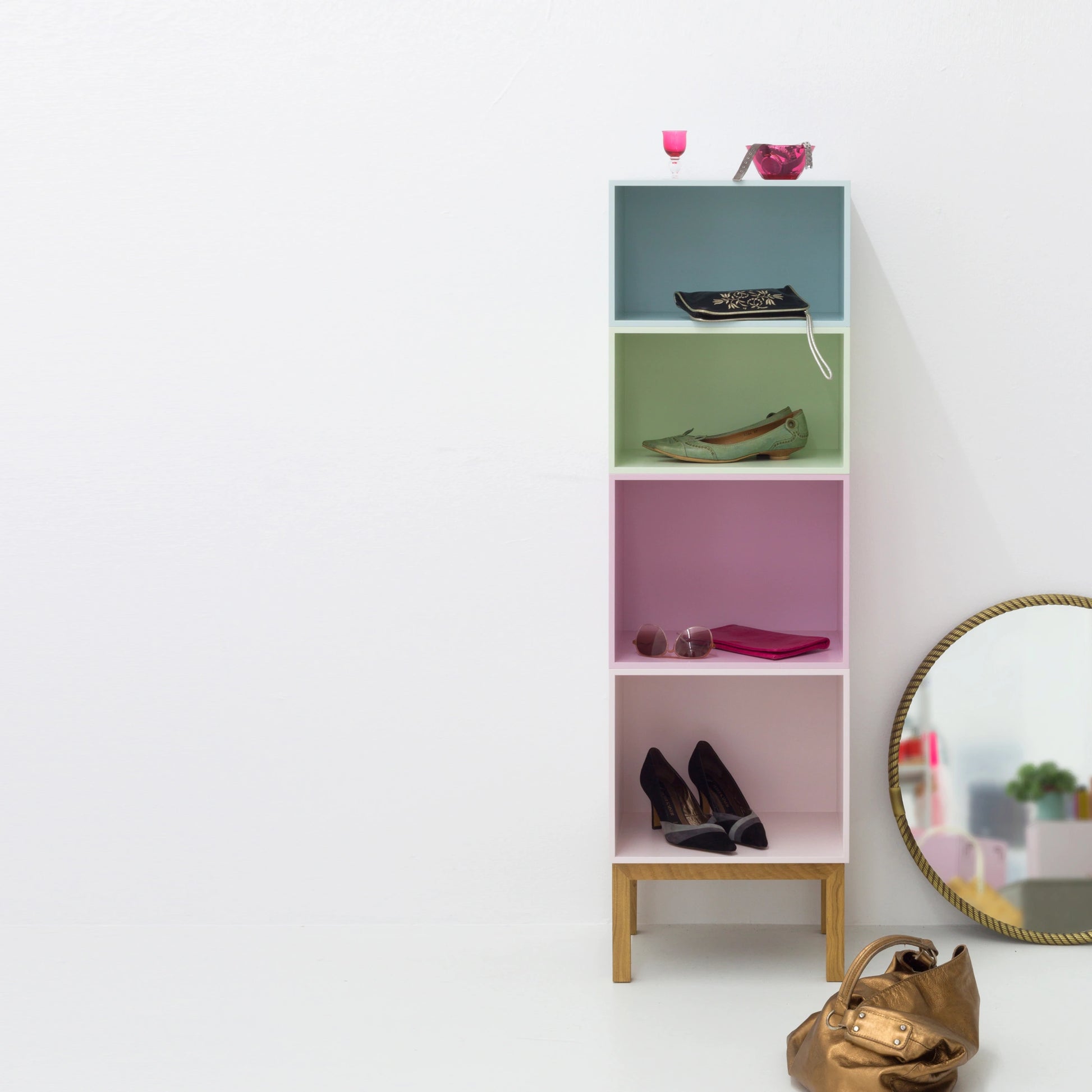 Three modular Cubit shelf boxes, two in light green and one in walnut veneer, arranged freely on the floor, another on a black metal frame