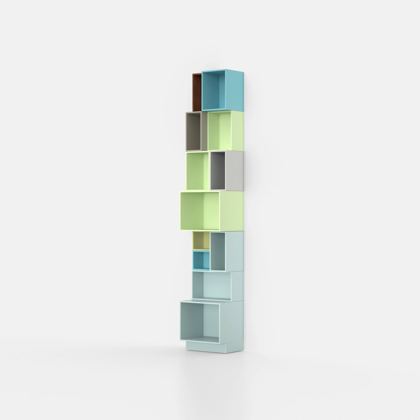 Three modular Cubit shelf boxes, two in light green and one in walnut veneer, arranged freely on the floor, another on a black metal frame