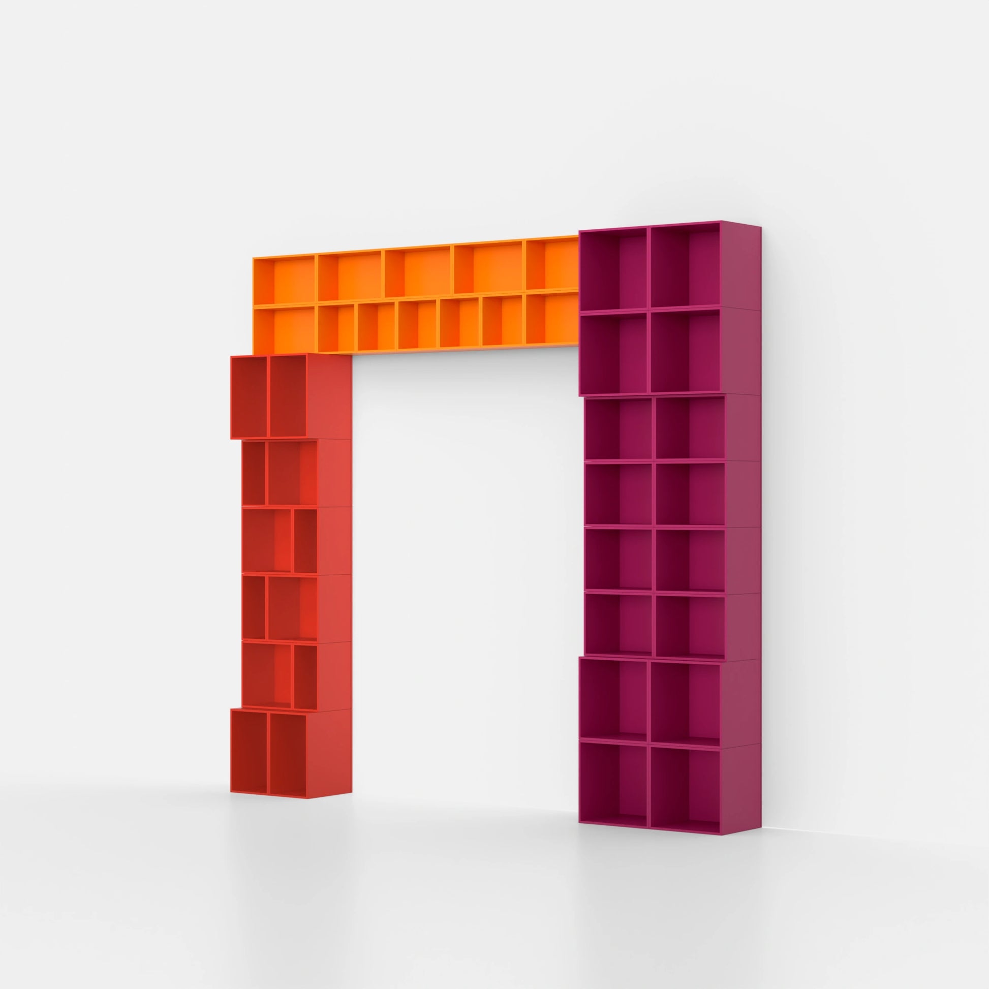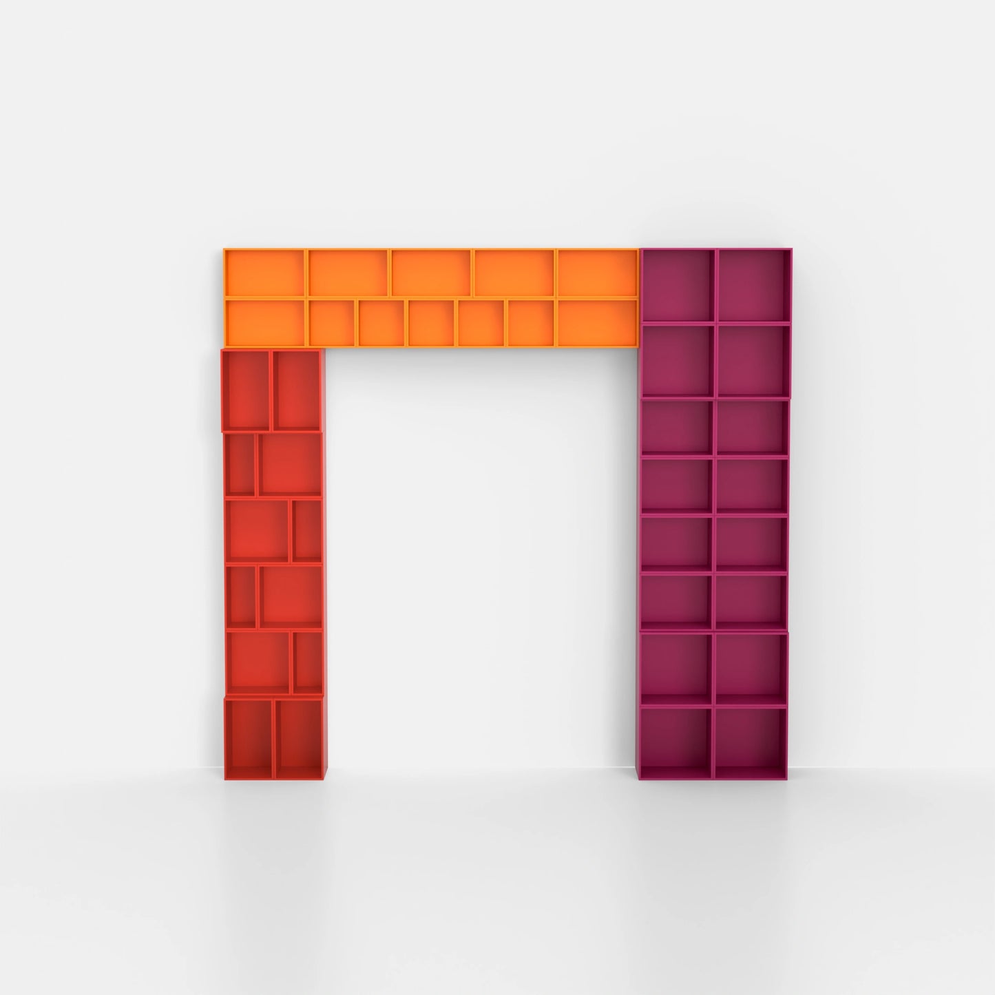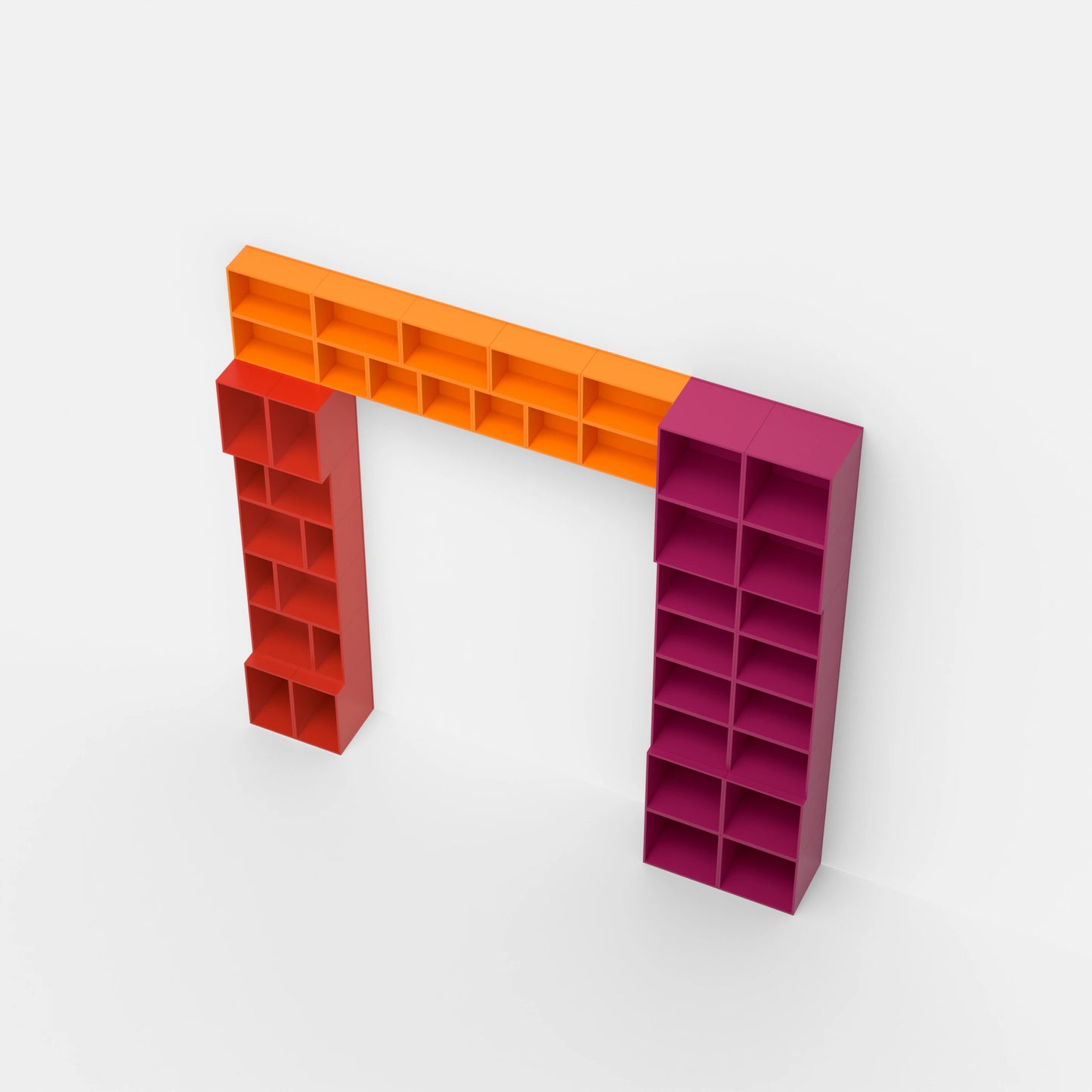 Cubit Wall bookshelf made of coloured modules in shades of red, pink and yellow, dynamically arranged for a lively room design