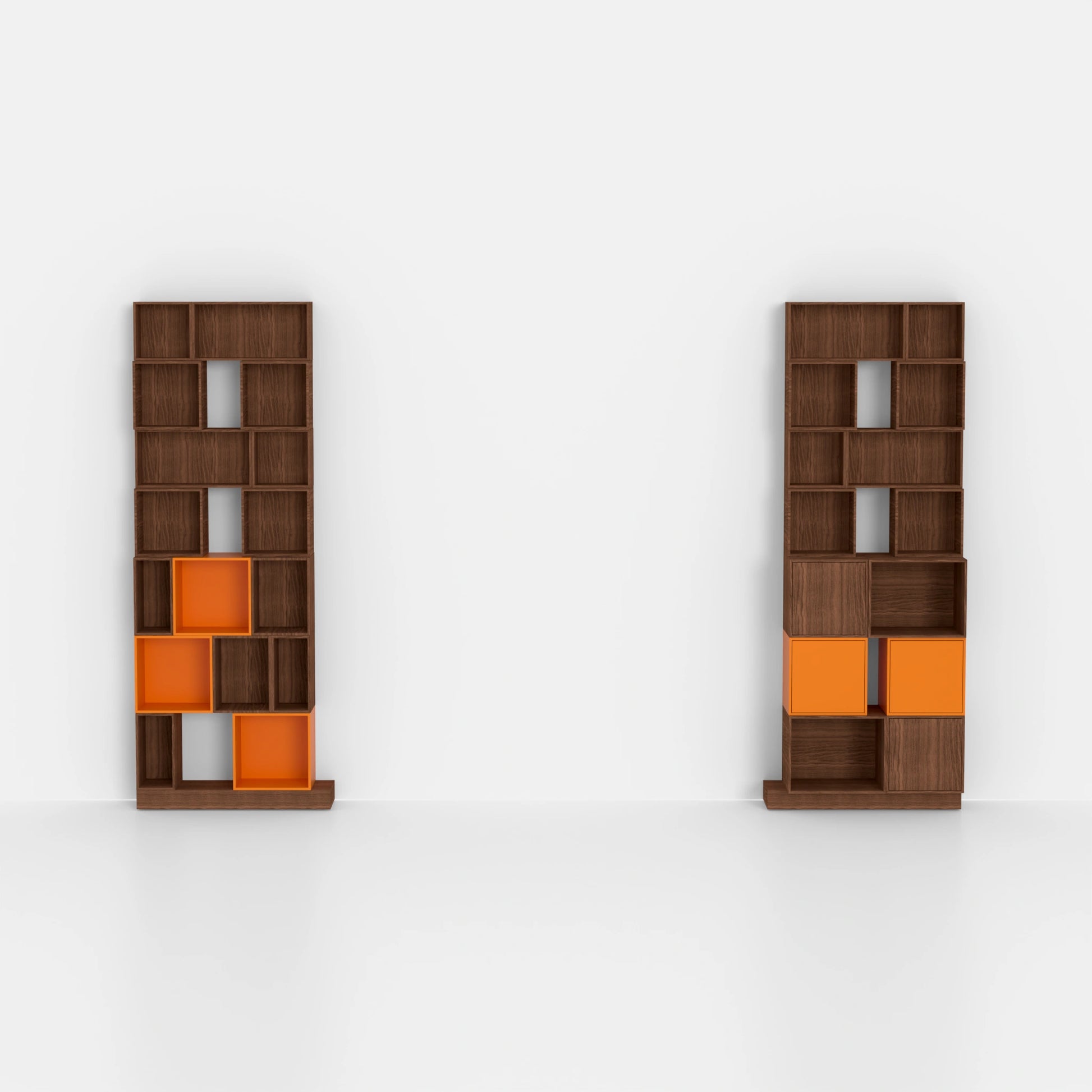 Cubit Wall bookshelf made of coloured modules in shades of red, pink and yellow, dynamically arranged for a lively room design