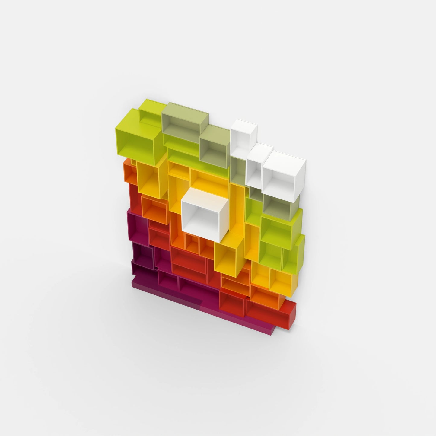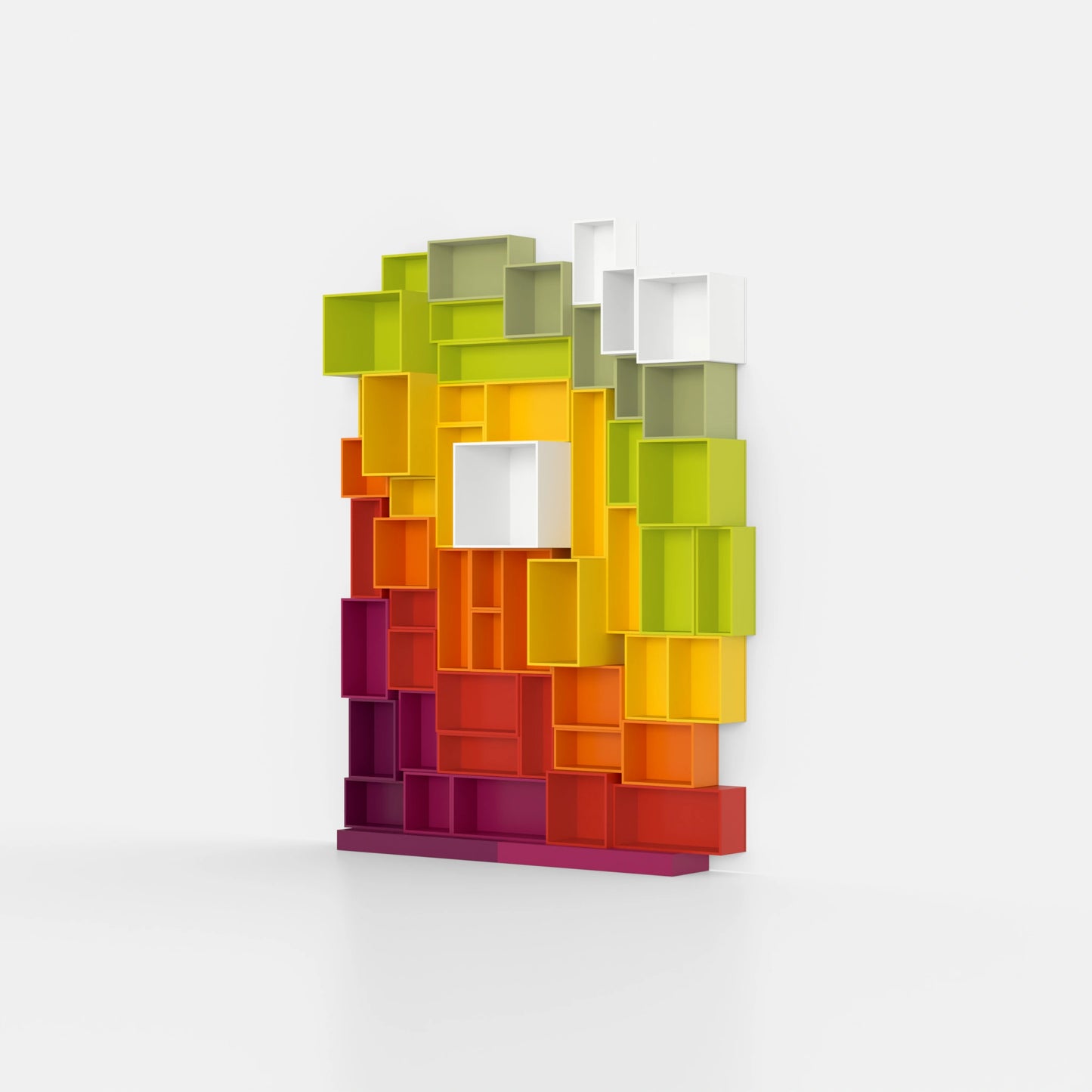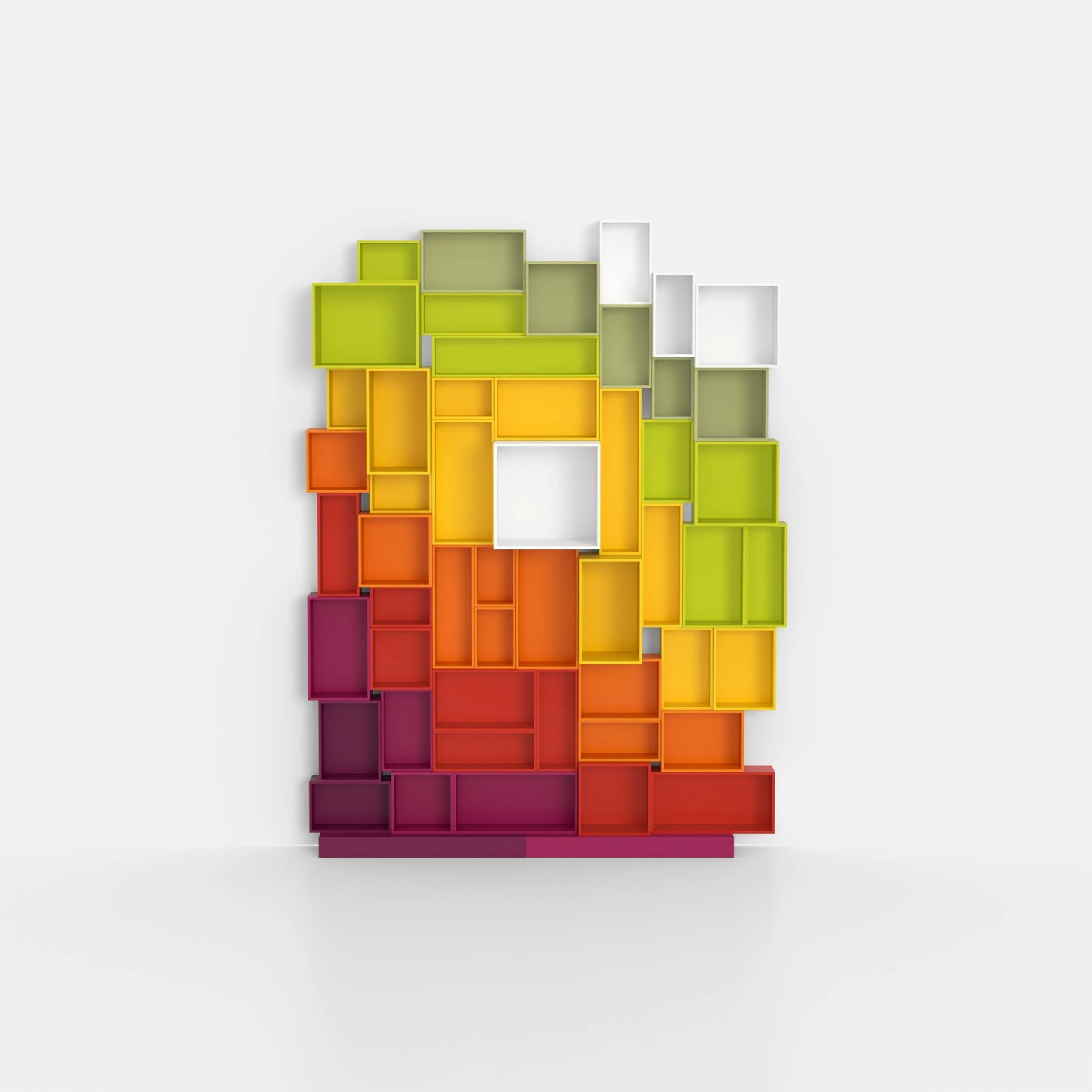 Cubit Wall bookshelf made of coloured modules in shades of red, pink and yellow, dynamically arranged for a lively room design