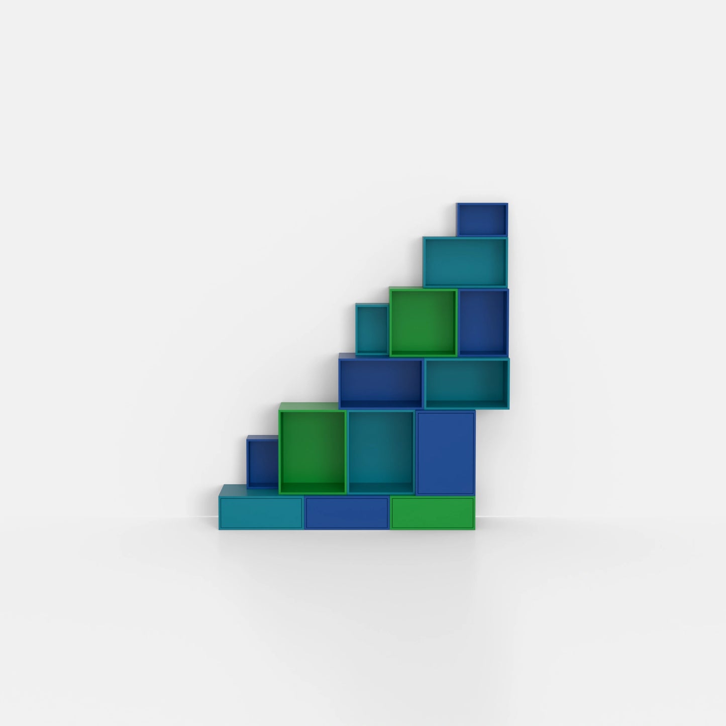 Three modular Cubit shelf boxes, two in light green and one in walnut veneer, arranged freely on the floor, another on a black metal frame