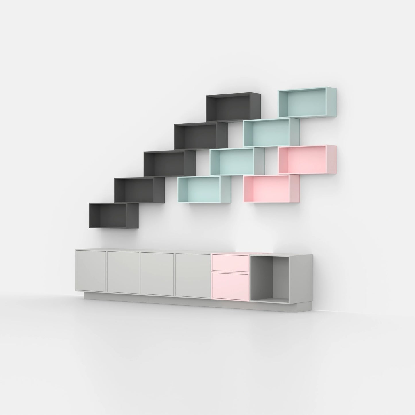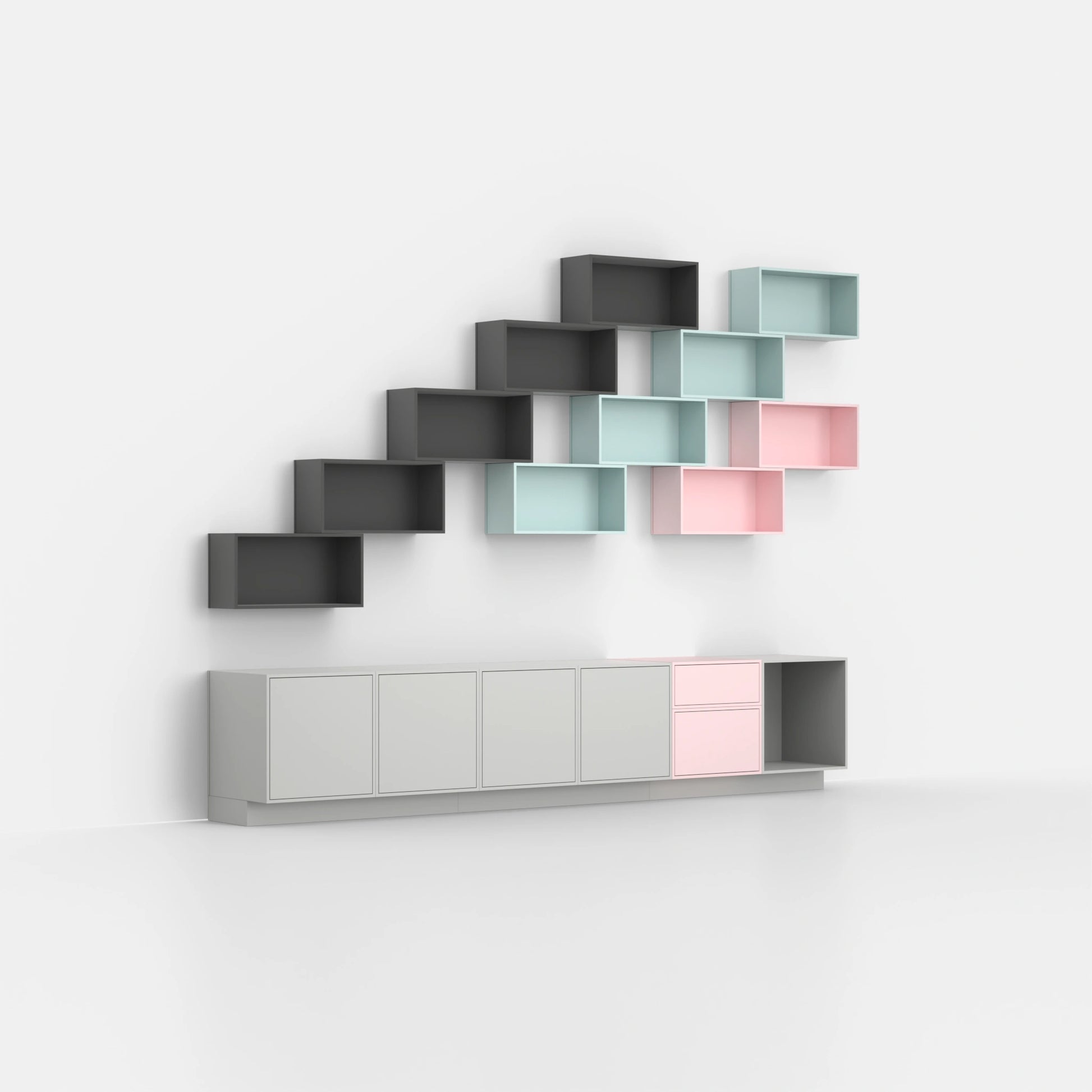 Shelving structure with various Cubit modules in pink and natural tones, combined with door modules and open modules