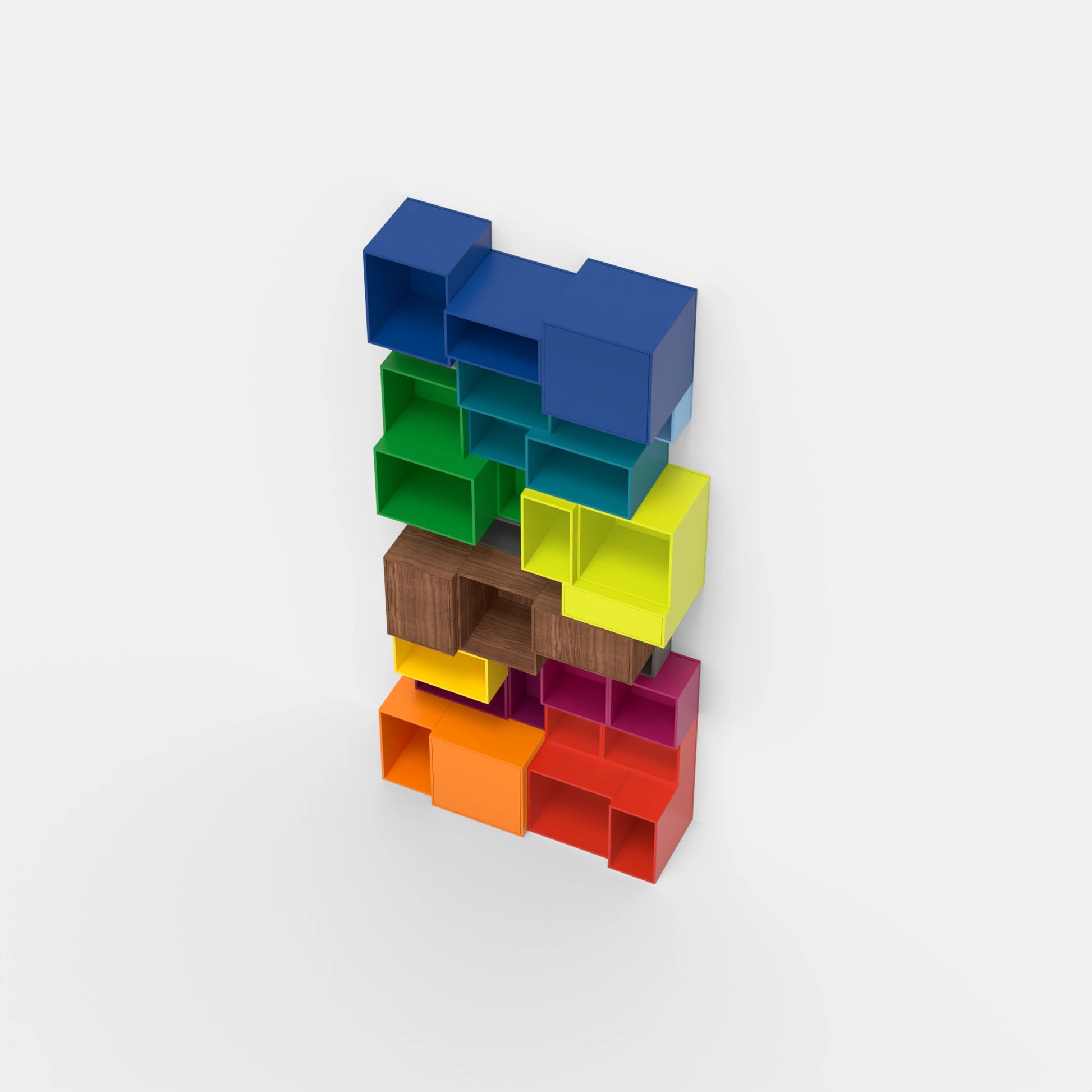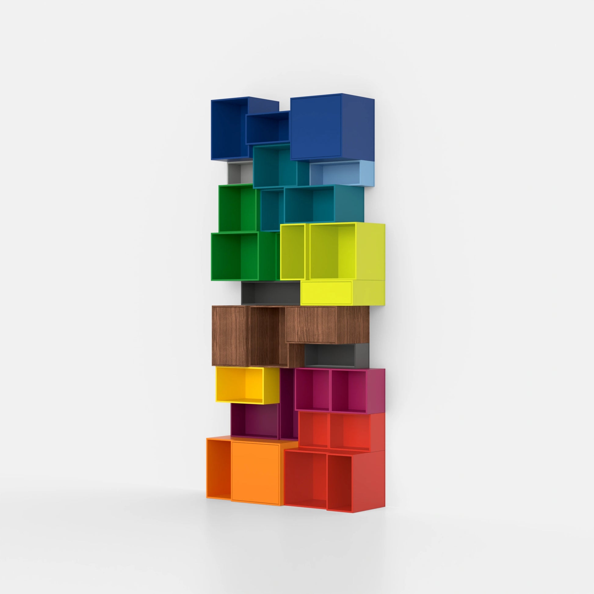 Cubit shelves in all colours of the rainbow as a wall installation, arranged in a flowing colour gradient - an expression of maximum colour variety and design freedom