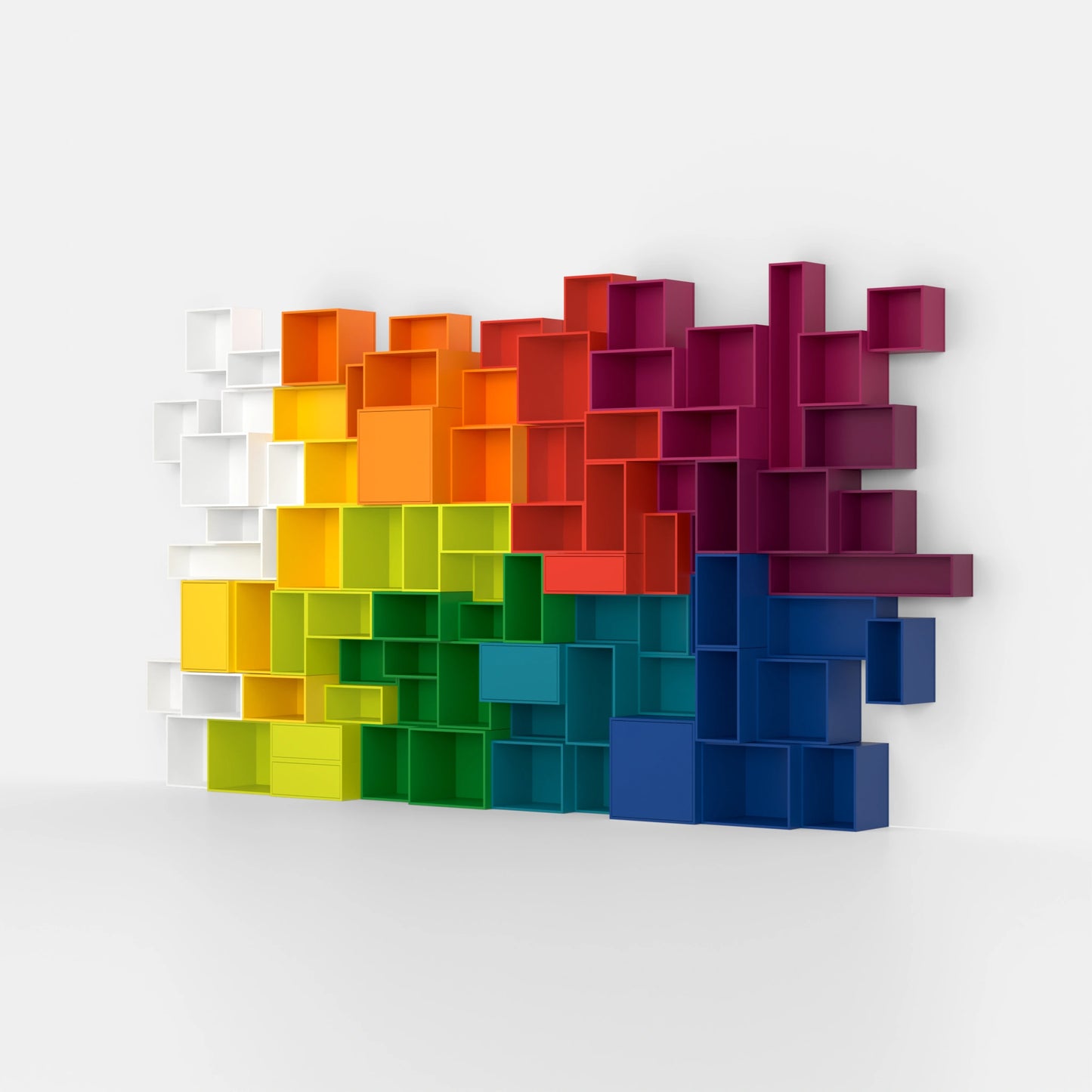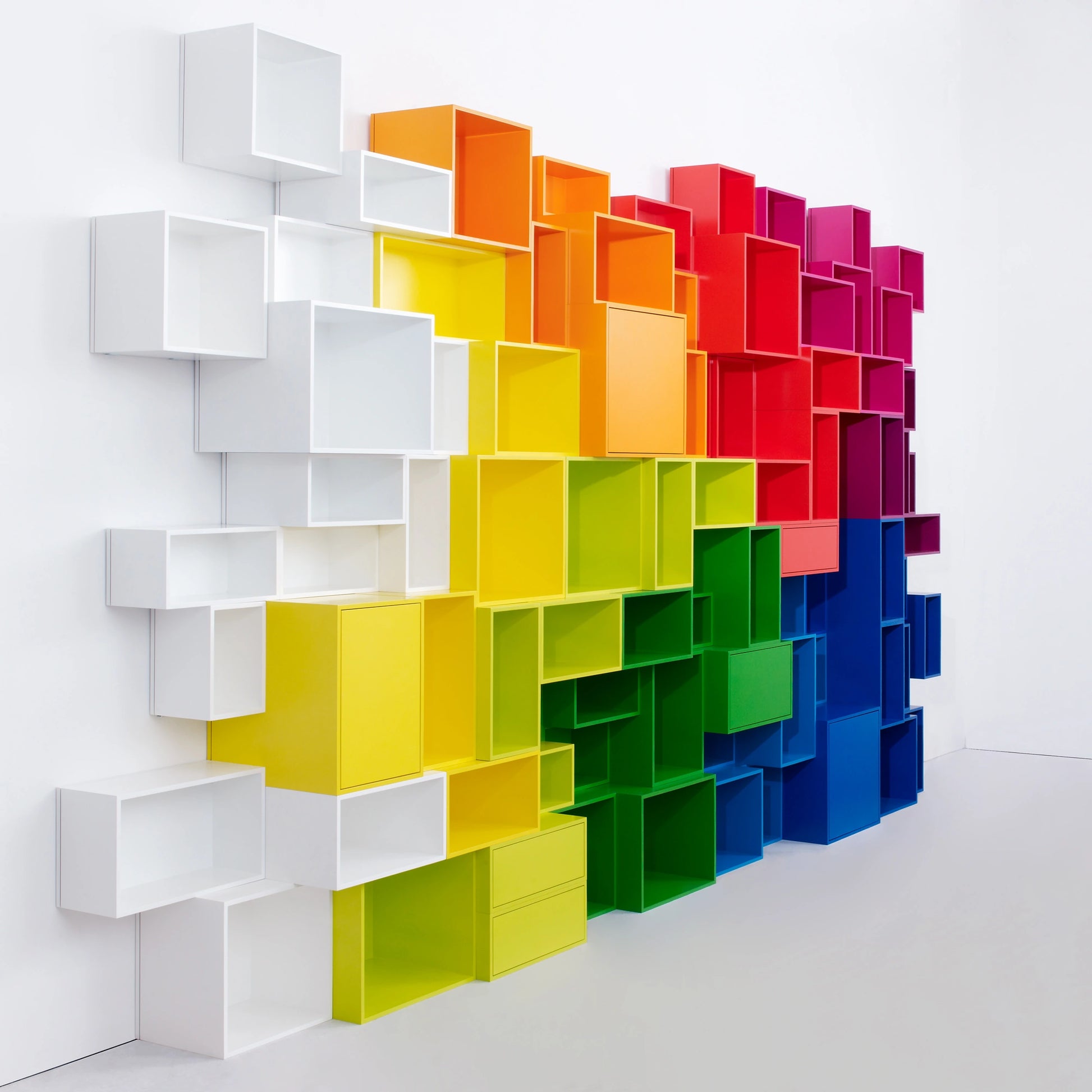 Cubit shelves in all colours of the rainbow as a wall installation, arranged in a flowing colour gradient - an expression of maximum colour variety and design freedom